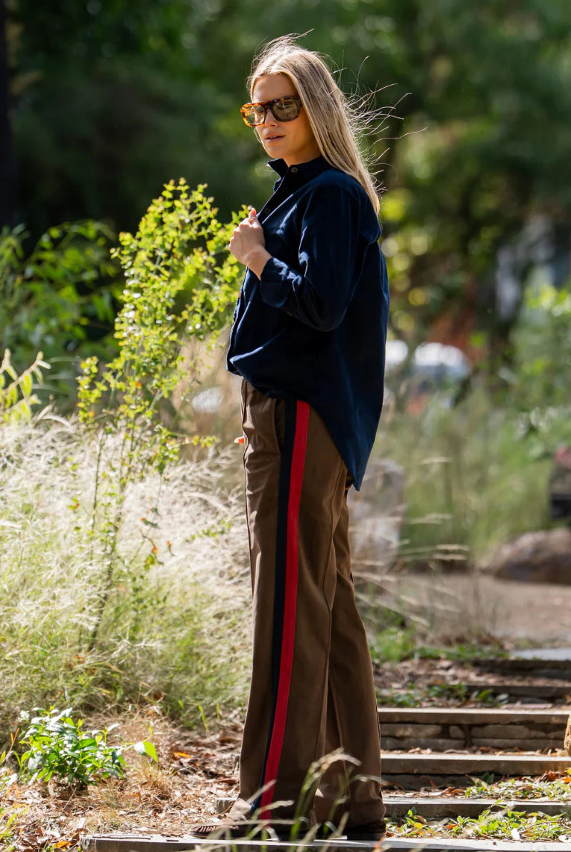 The Lucile Velvet Twill Pant - Chocolate With French Navy & Ruby Stripe