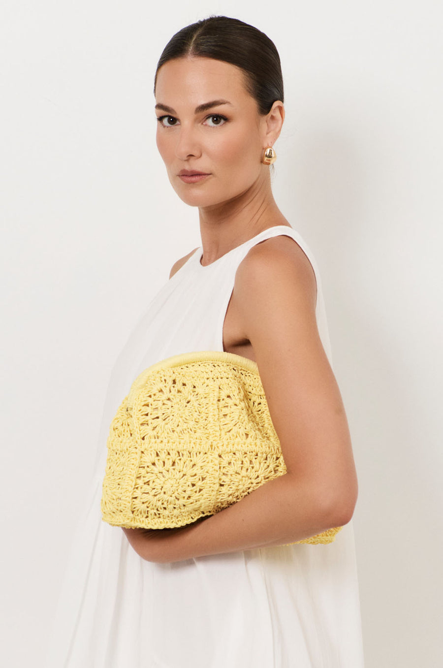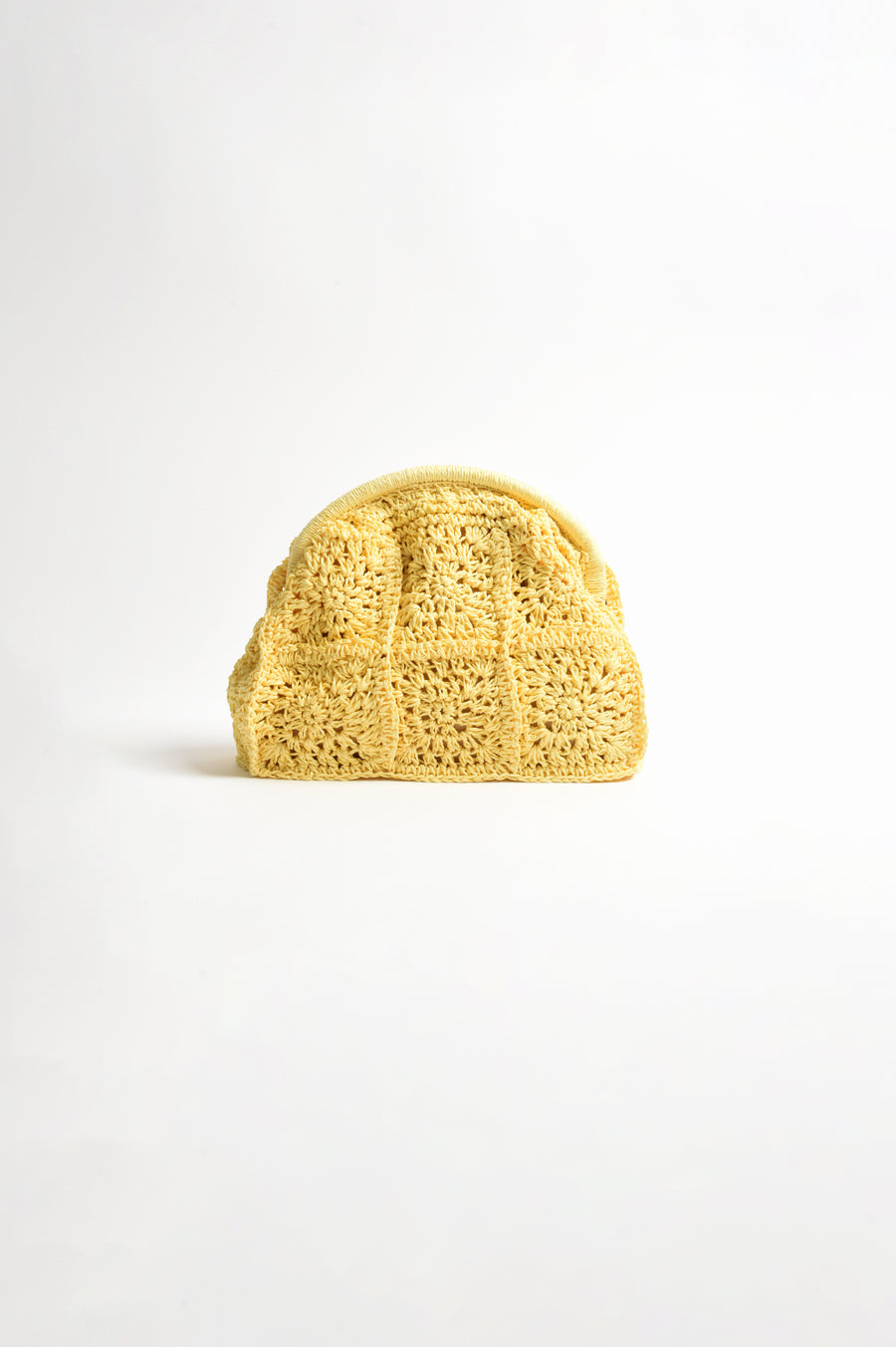 The Patterned Curved Paper Weave Clutch in Butter Yellow is crafted from woven raffia with a curved silhouette. Designed with a hinged frame closure, it features an internal pocket and an optional chain strap.