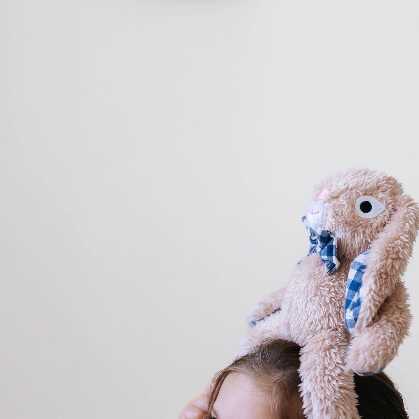Louis rabbit is made with caramel super soft plush fabric and is wears an elegant blue gingham bow tie and finished off with blue gingham detail on his ears, hands and feet. He is super soft and is the cuddliest friend around. • He loves to make paper aeroplanes • and fly them off the tallest building • play with his friends in the rain • and make up new games He doesn't like peas. • Suitable from birth • Size: medium (32cm). Also comes in mini size • Australian designed