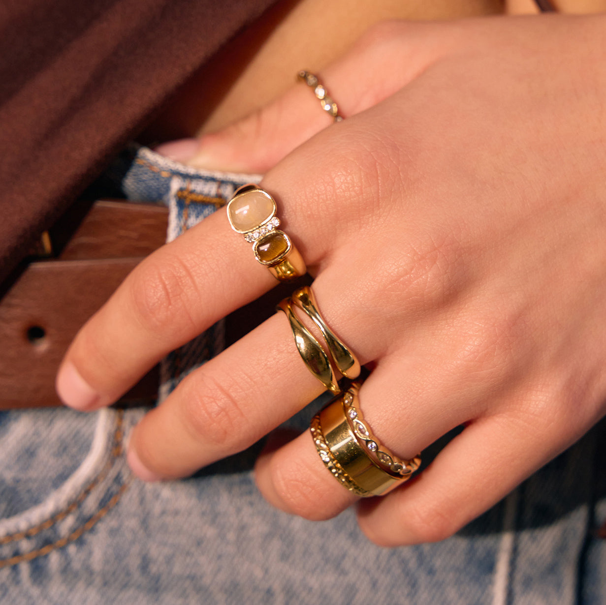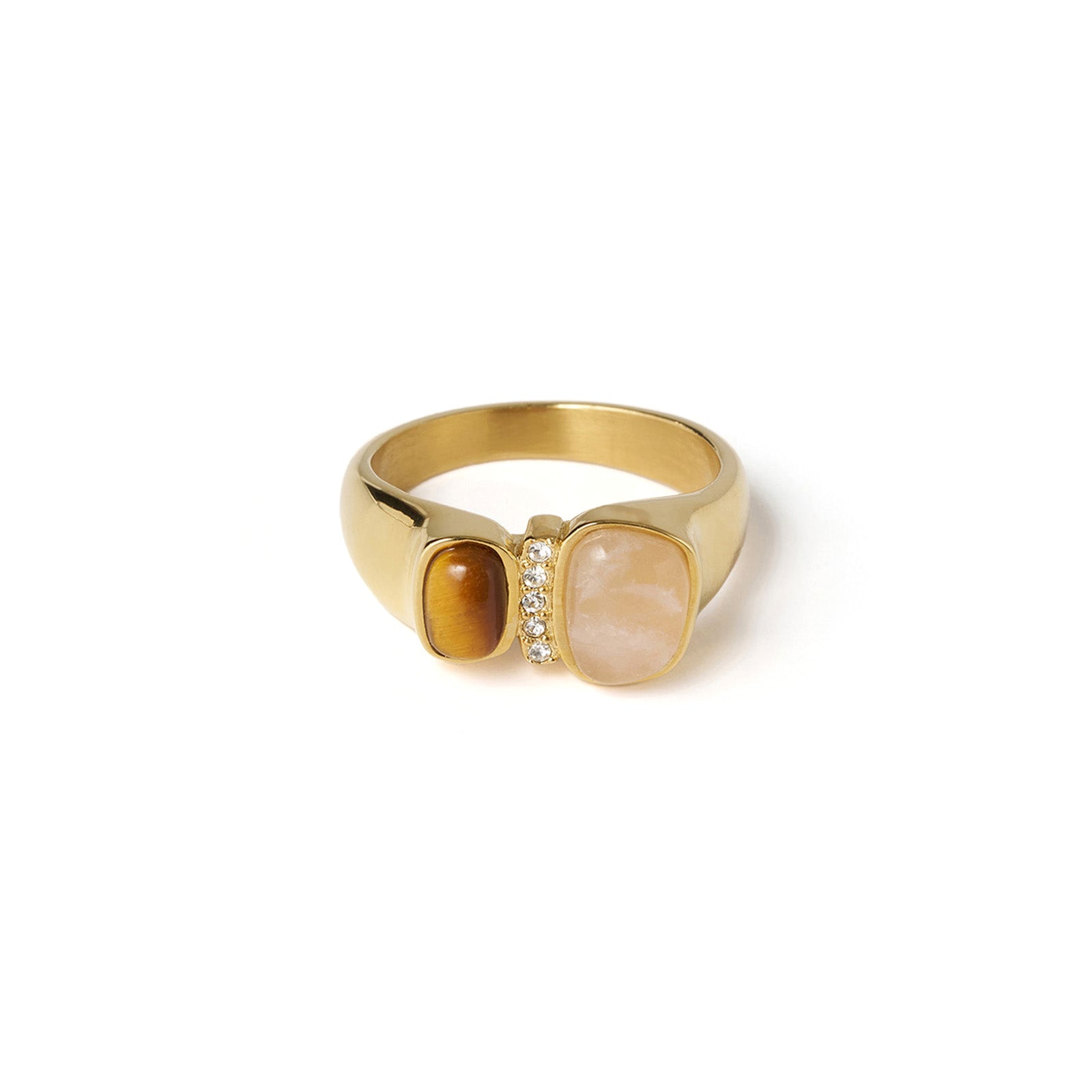 Meet the divine Dakota, a gorgeous gemstone ring adorned with rose quartz, tiger's eye, and zircon stones! This golden beauty radiates harmony, strength, and love, making Dakota perfect for everyday wear, adding a touch of warmth to your look.