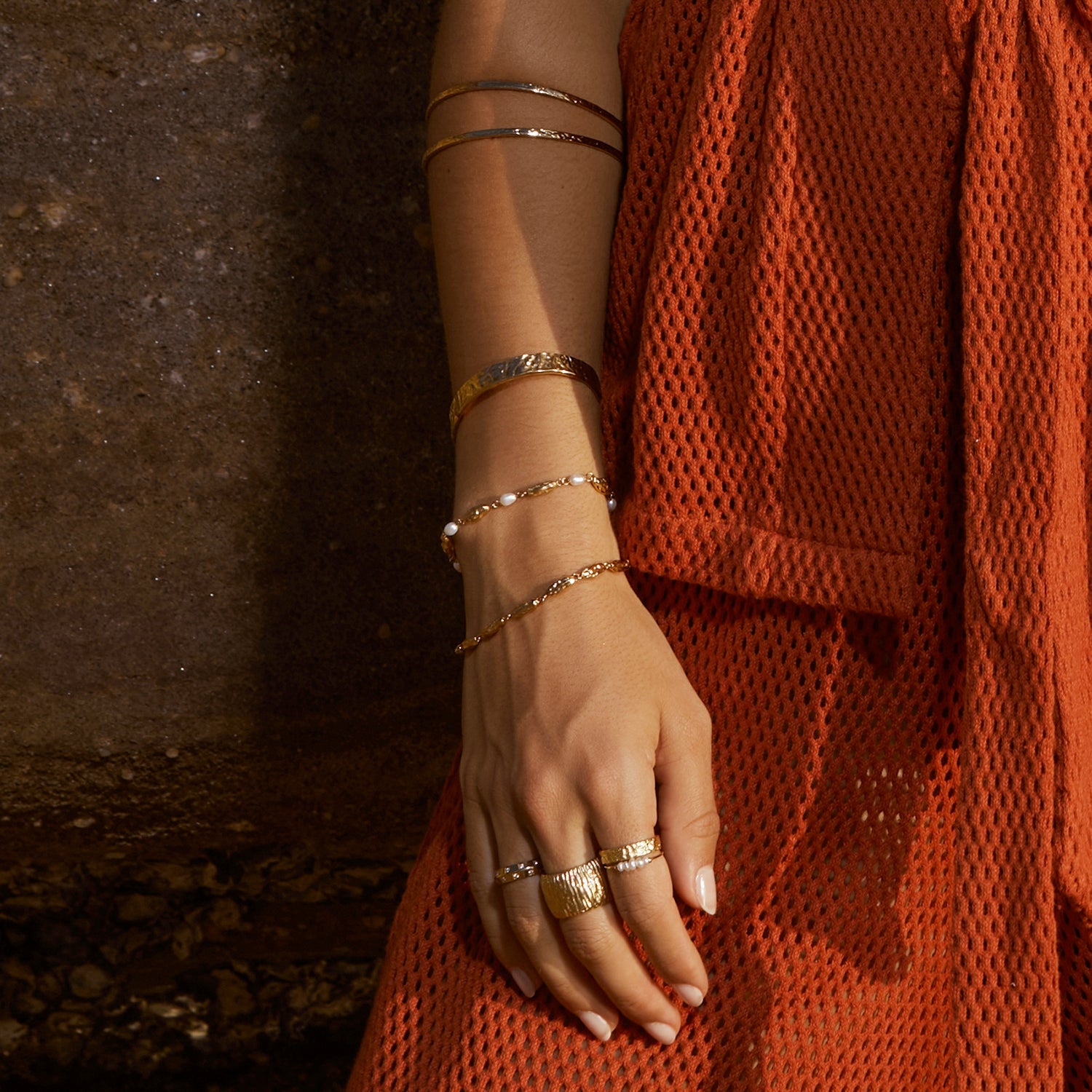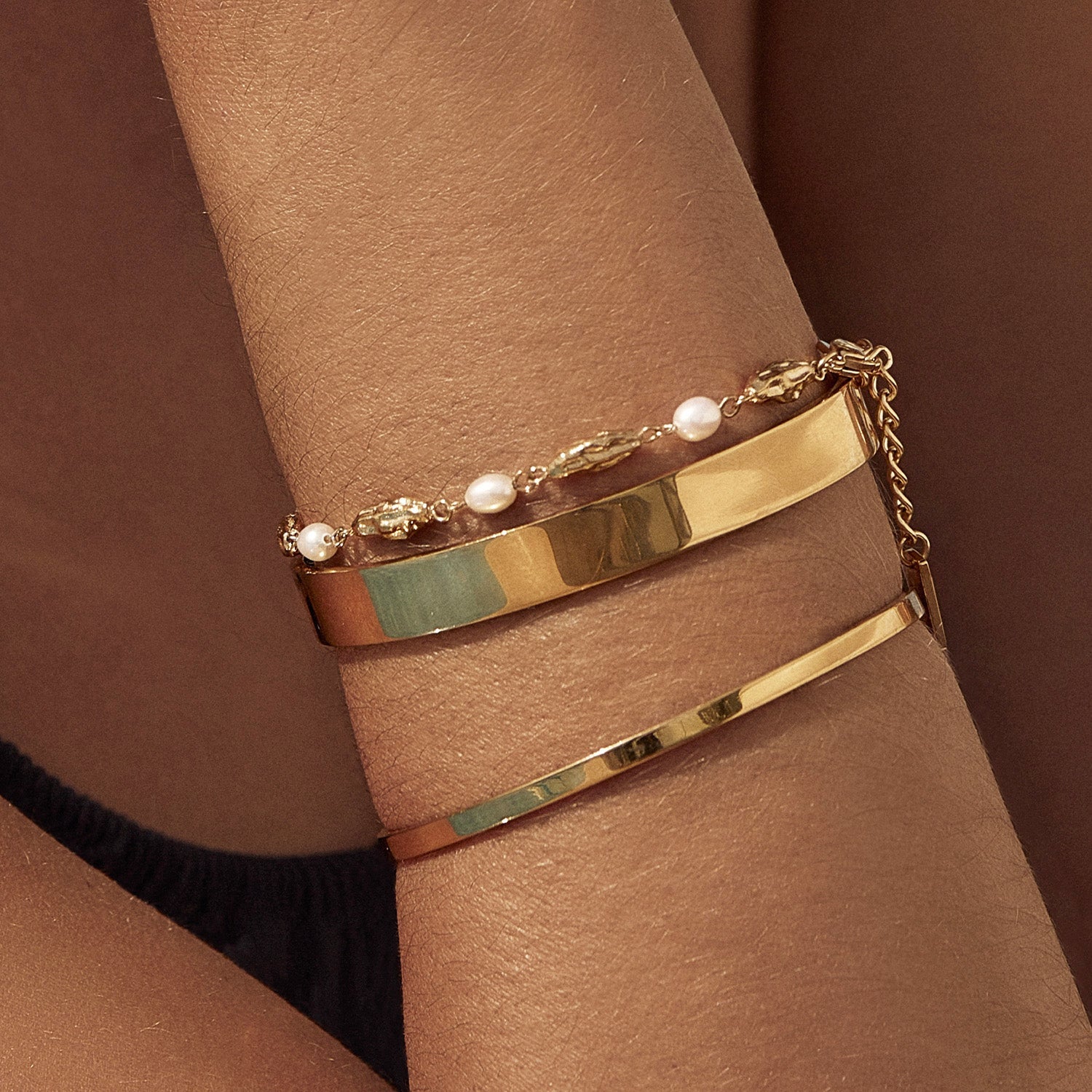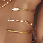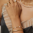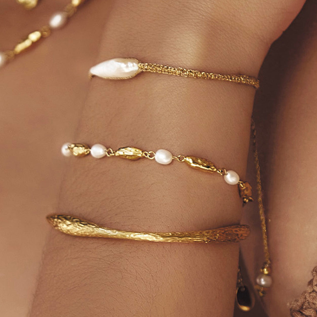 With the perfect contrast of cool crushed gold and classic freshwater pearls, our Mimi Bracelet is the perfect piece to elevate a glamorous look.