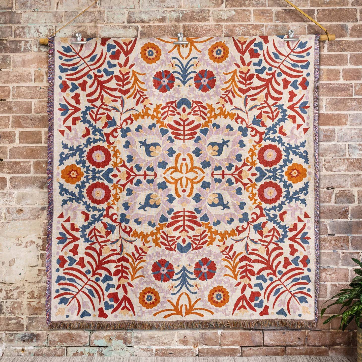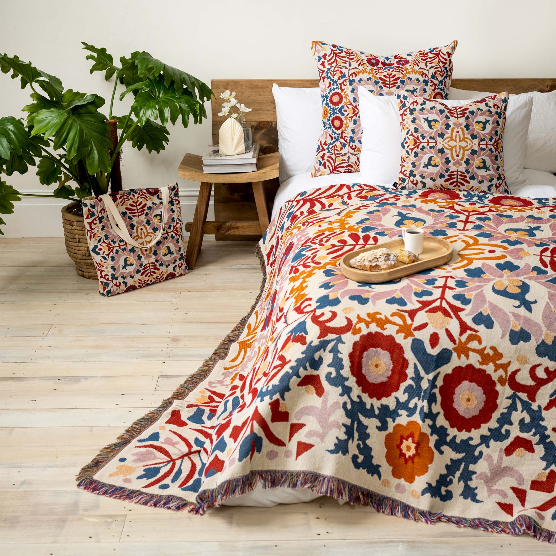 It is a light-weight throw that is thoughtfully woven using a blend of cotton and recycled polyester (sourced from plastic bottles and waste diverted from landfill and our oceans) ... to create an intricate bohemian folk & structured design.