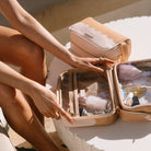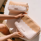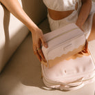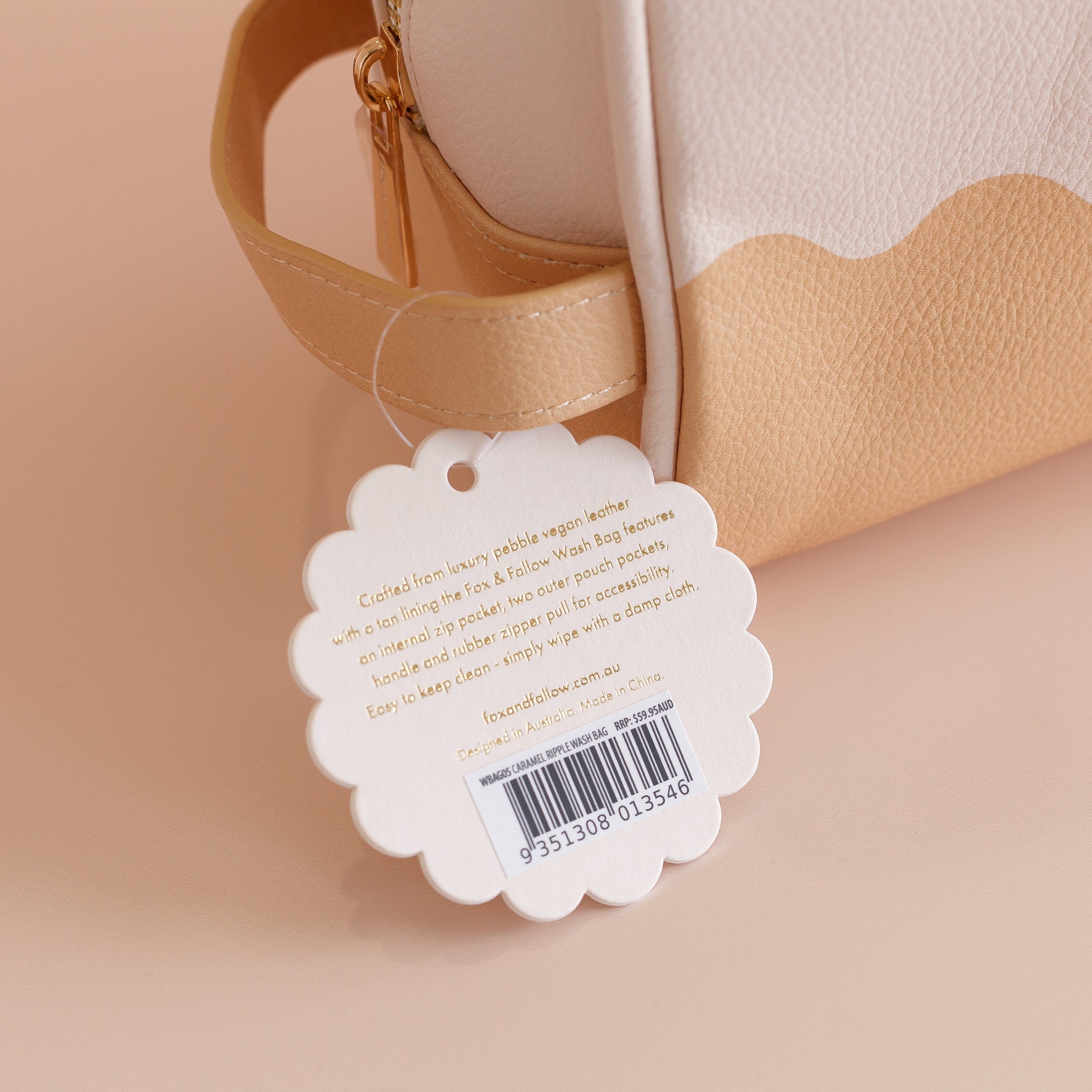 Introducing the coolest toiletry bags you've ever seen! Crafted from super soft, yet durable luxury pebble vegan leather it's easy to keep clean - simply wipe down with a damp cloth. Medium: 25 x 10.5 x 14.5cm. Pebble vegan leather with a tan lining. Internal zip pocket. Gold hardware. Two outer pouch pockets. Handle. Gold zipper. Packaged with a diecut gold foiled swing tag. Designed in Australia, made ethically in China.