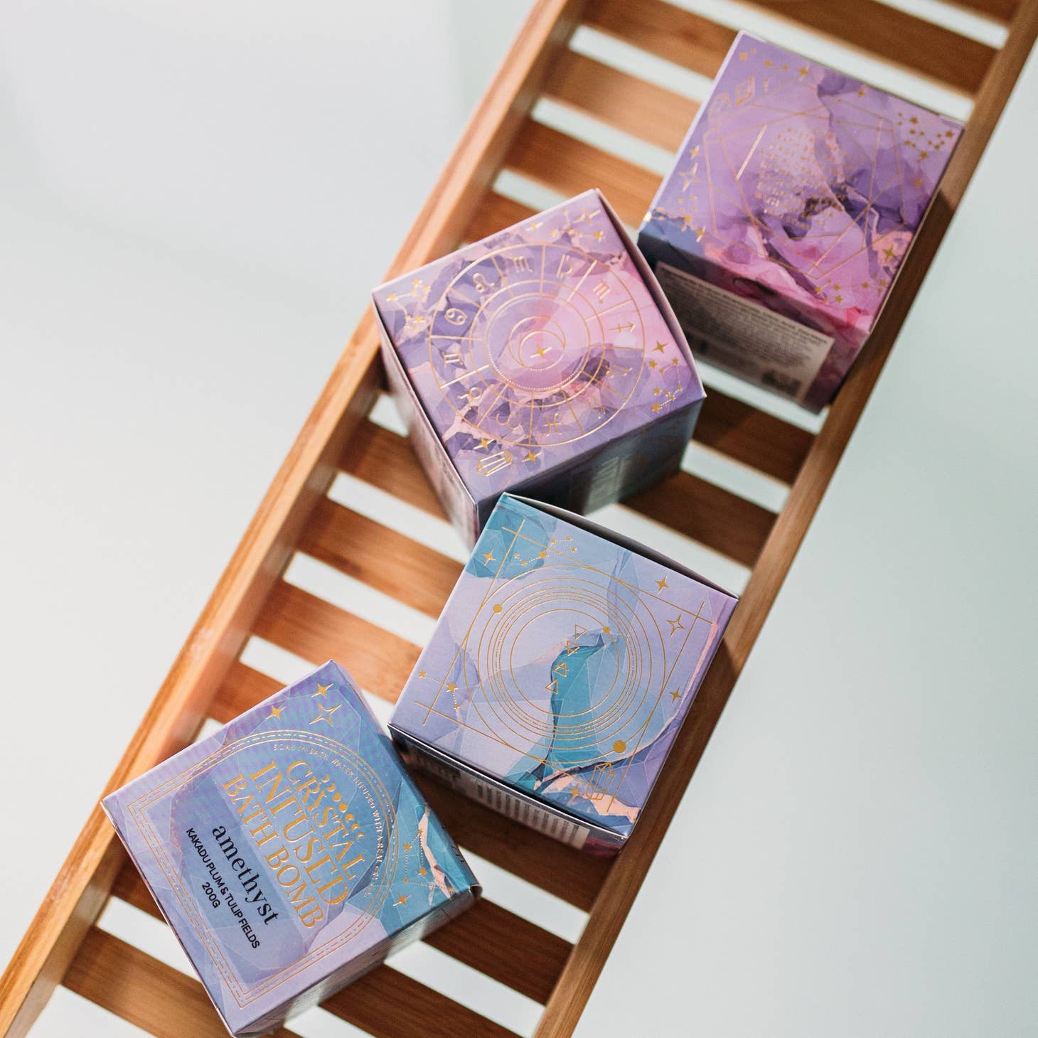 Our NEW Crystal Infused Bath Bombs are handmade with sweet and floral scents and in the center of each bomb is a crystal to infuse your bath water as you soak. Our Clear Quartz Crystal Bath Bomb is handmade with the sugar sweet and warm scent of pink sugar & tonka bean. A clarifying and protective tumbled clear quartz crystal awaits you inside a sparkling white bath bomb. What makes our bath bombs so special? + Australian Made and Owned + PETA approved Vegan and Cruelty Free + Palm Oil Free + Zero Plastic + Landfill Biodegradable Shrink Wrap + No Nasties (no SLS, SLES, Parabens, or Petrochemicals) + 1% of Revenue goes to an environmental non-for-profits