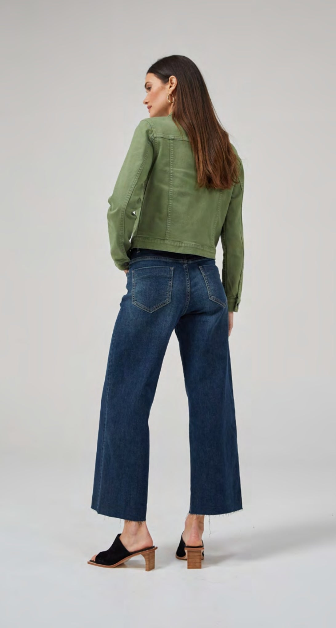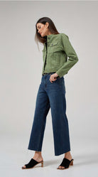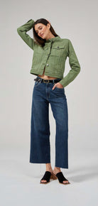 A cropped wide-leg jeans designed mid to high rise. Slightly faded and lightly frayed at the bottom for a vintage appearance. Crafted in stretch denim.
