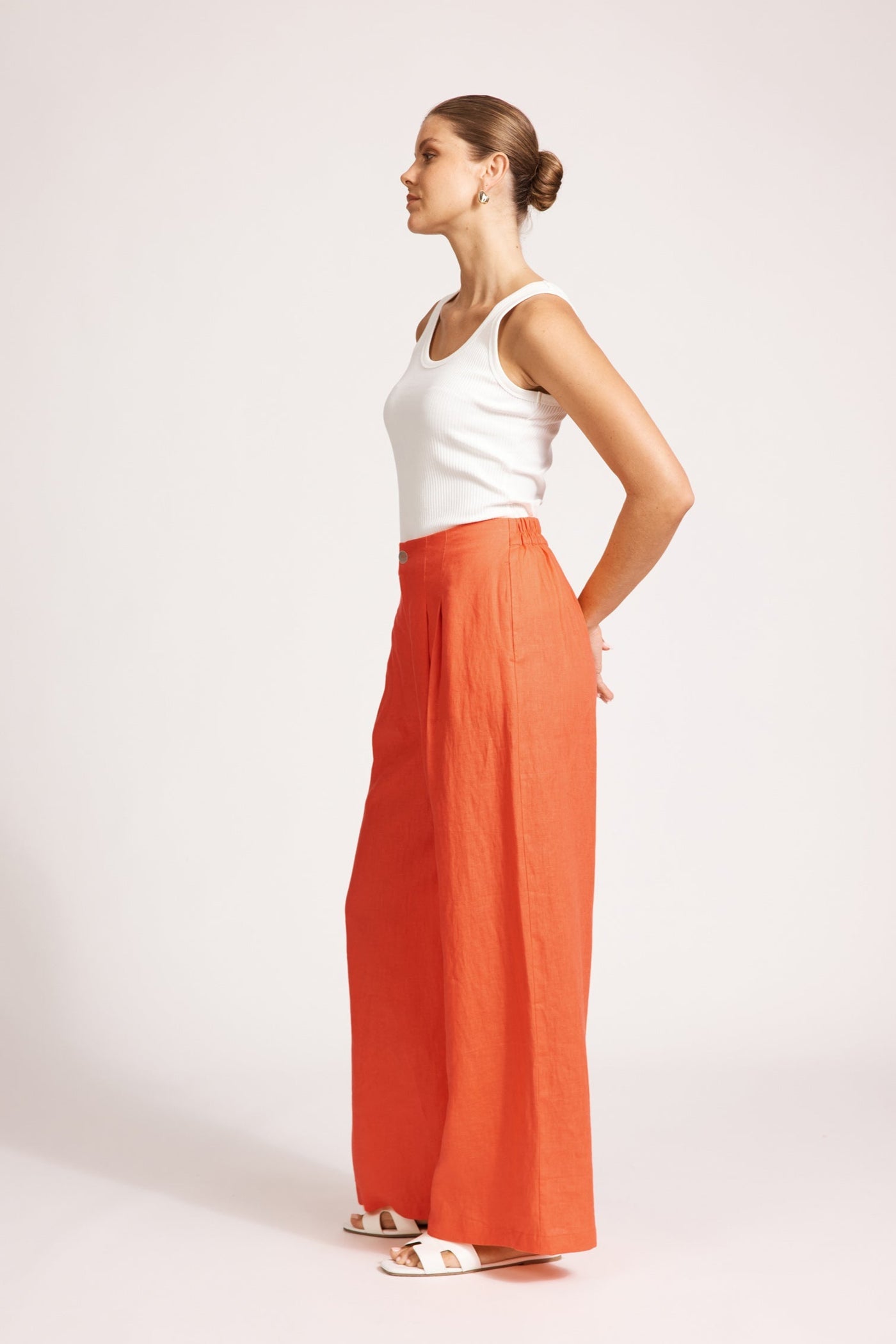 A wide-leg essential with relaxed polish. Crafted from 100% linen for natural breathability. Features a flat front high waist with button closure, elasticated back, and subtle pleat detail at the front. Fully lined for comfort.