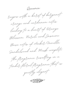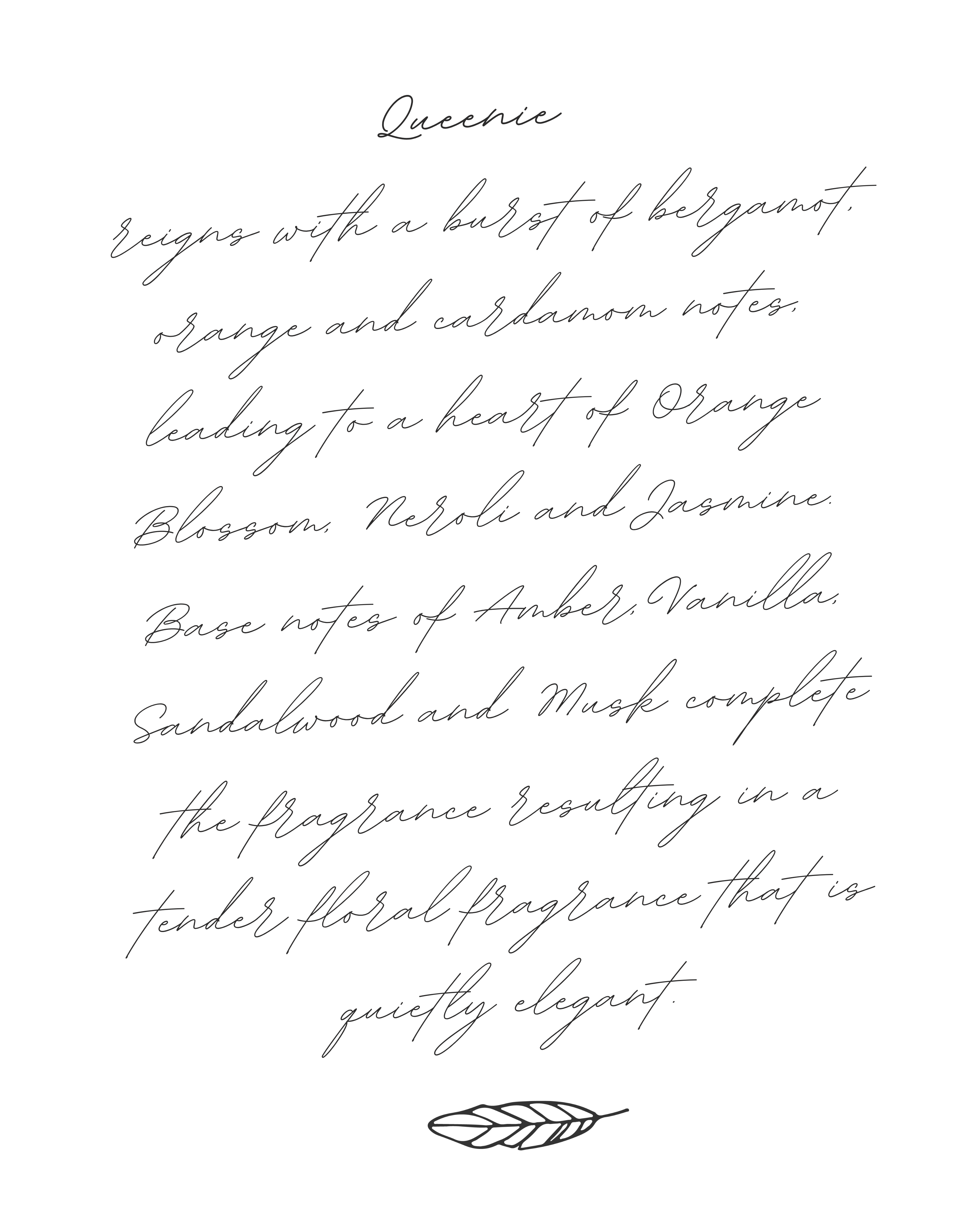 Queenie reigns with a burst of bergamot, orange and cardamom notes, leading to a heart of Orange Blossom, Neroli and Jasmine. Base notes of Amber, Vanilla, Sandalwood and Musk complete the fragrance resulting in a tender floral fragrance that is quietly elegant.