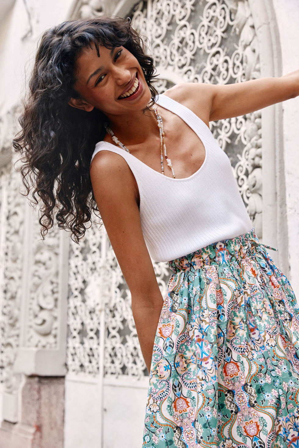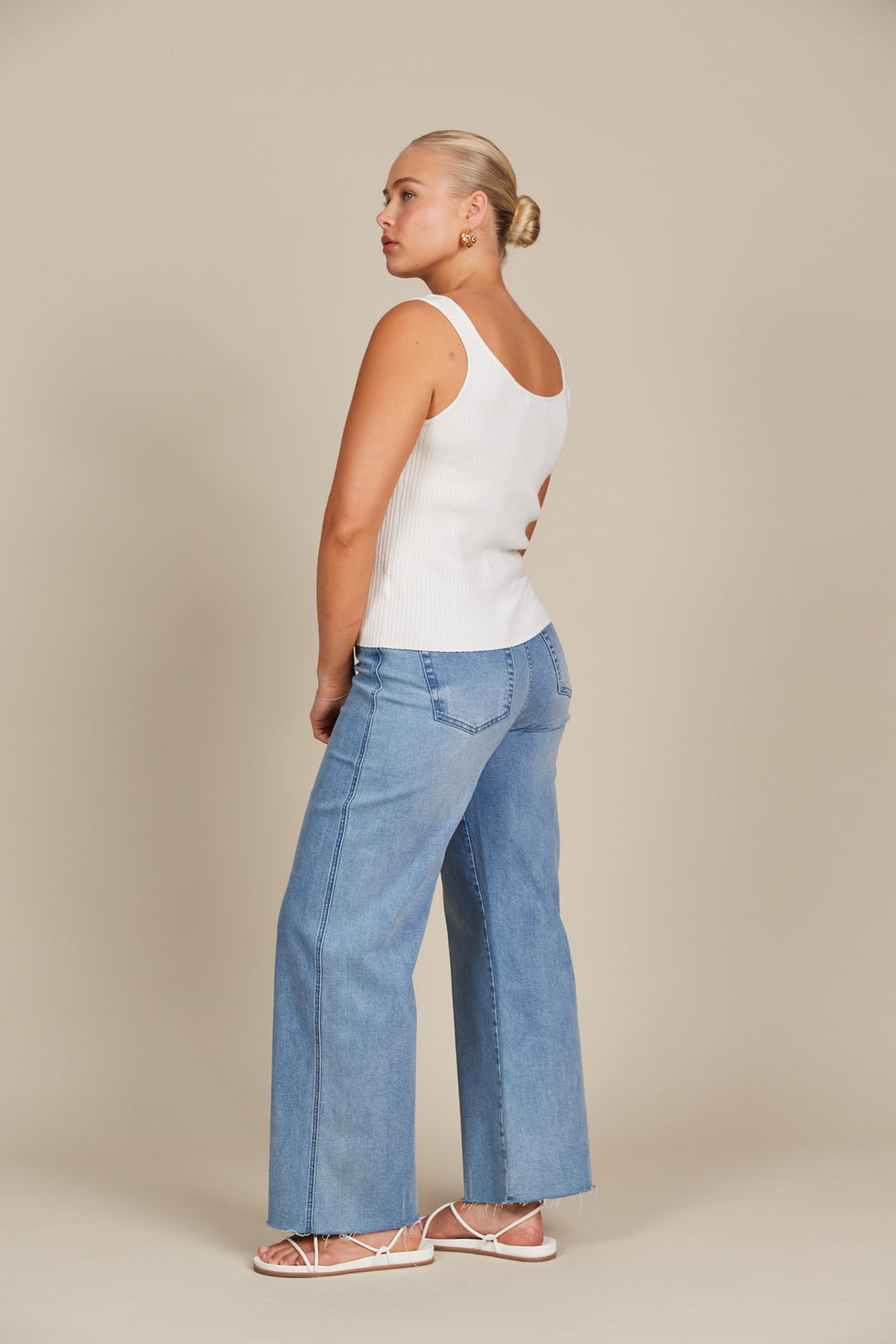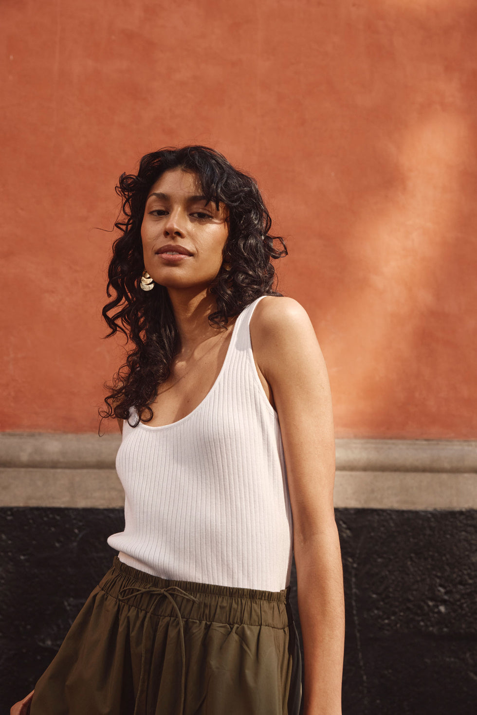 Meet your new summer essential: the Adele Tank. This tank is the ultimate basic, pairing perfectly with everything in your wardrobe. In a soft and stretchy rib knit, this tank sits comfortably at your hip, featuring a scoop neck and sleeveless design for easy wear. With its versatility, the styling options are endless! Whether you tuck it into trousers or a skirt or layer it under a cape or button-down shirt, you'll always look effortlessly chic. Trust us, you'll want one in every colour!