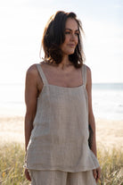 The design of the Classic Linen Tank is refined and classic. The neckline is a square cut and shows off the perfect amount of décolletage. The bottom hem falls just above the hip, pairing elegantly with the Arana Pant or Tallows Shorts.