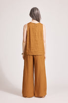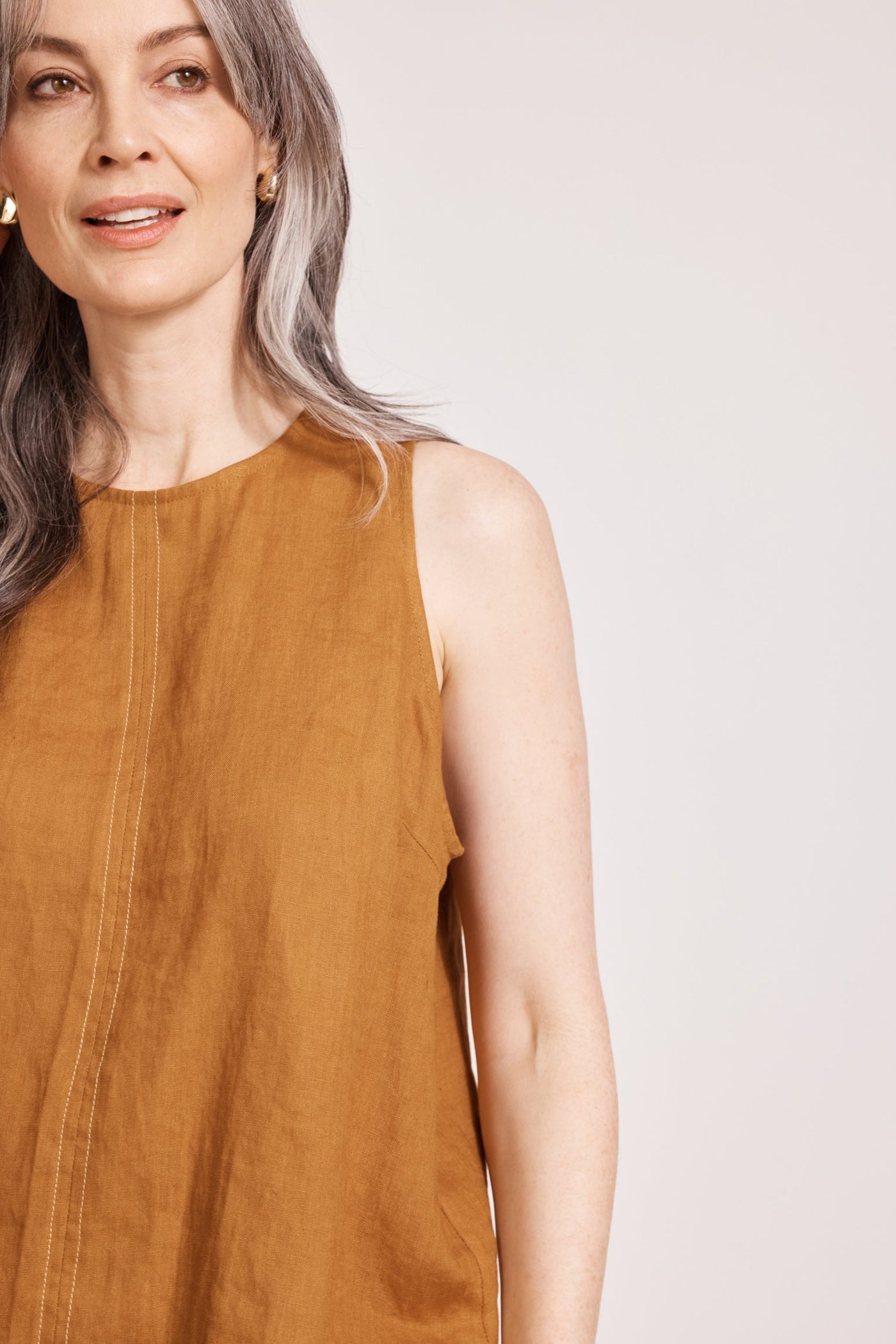 A relaxed linen tank with refined detailing. Crafted from 100% linen for breathable comfort. Features exposed shoulders, contrast decorative topstitching, button closure at the back neck, wide cuffed hem, and soft A-line silhouette.