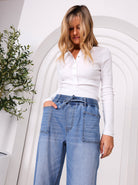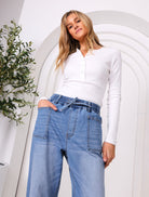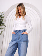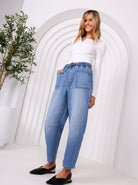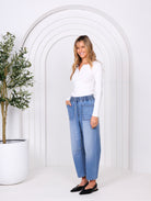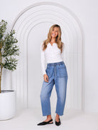 Characteristics of Leo Barrel-Leg Jeans include a fitted waist, flared-out shape around the mid-leg, and tapered silhouette at the bottom, which exudes the look of, well, a barrel. It's the vibe of a cowboy ready for a showdown in the Wild, Wild West!!!