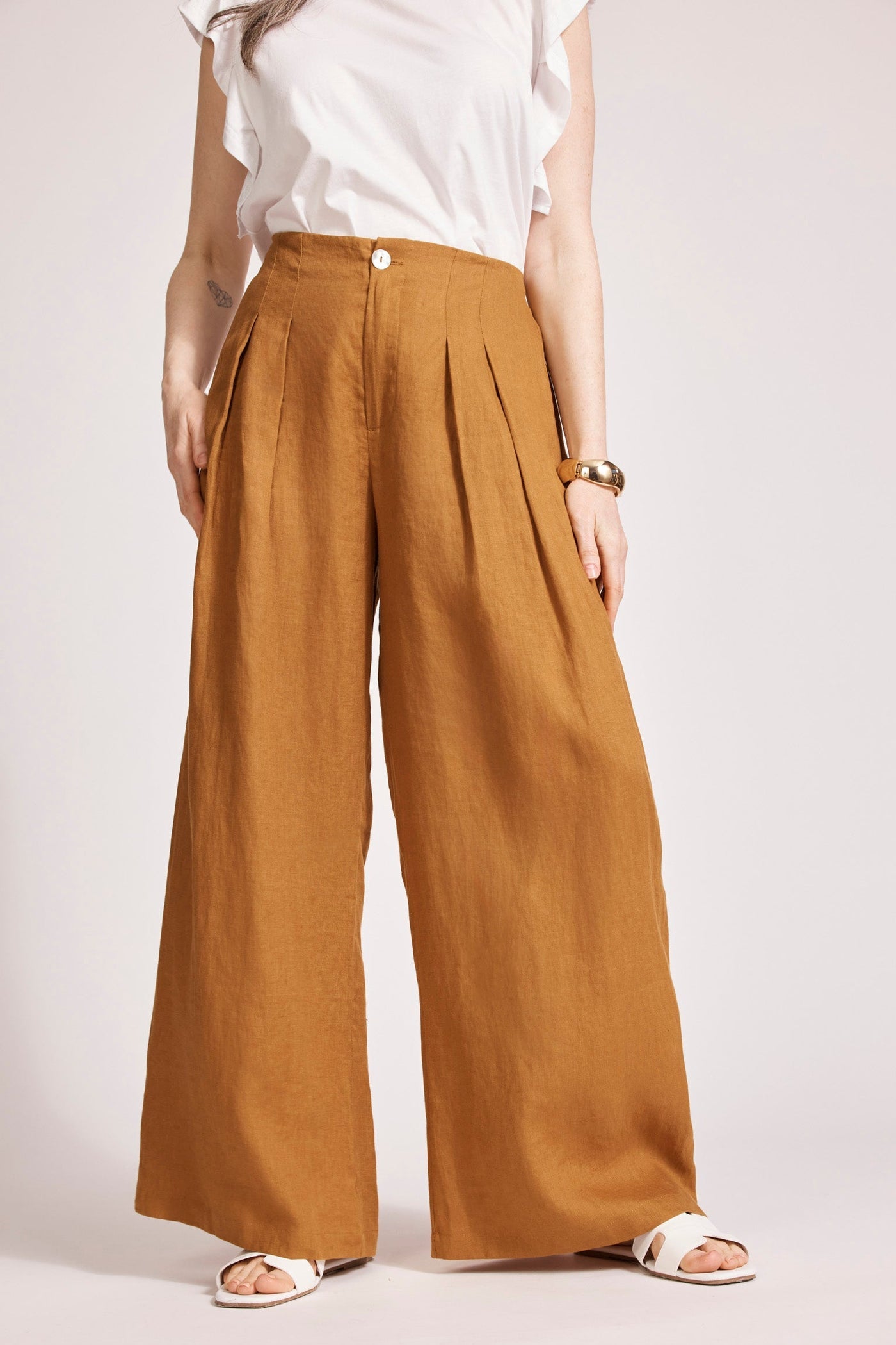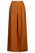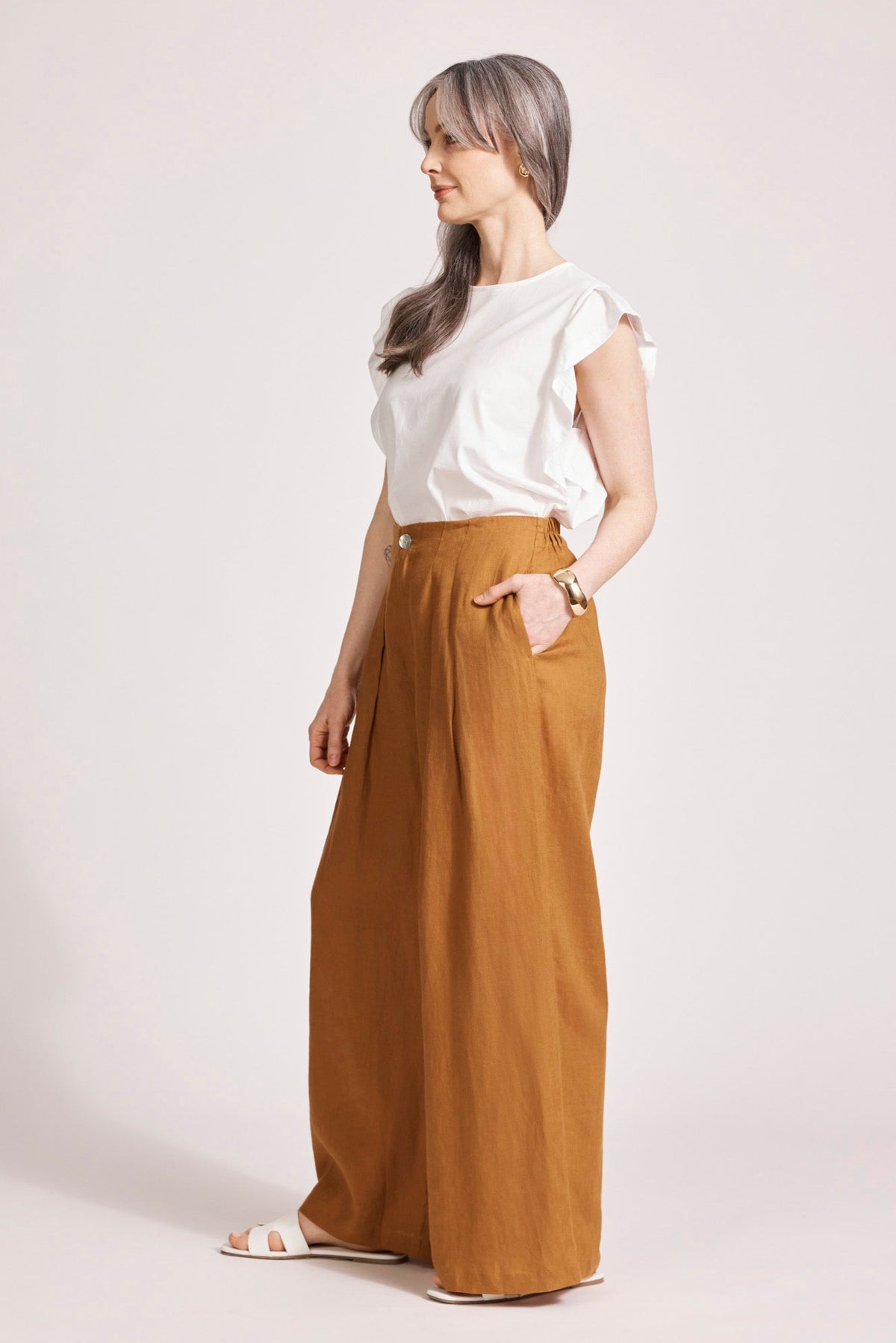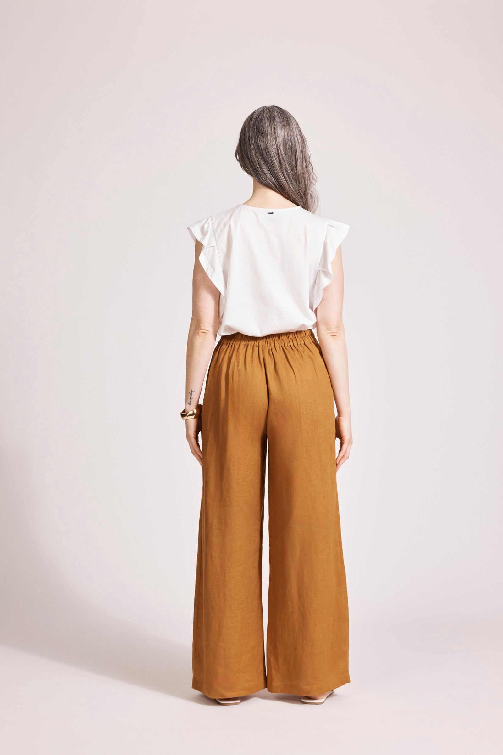 A wide-leg essential with relaxed polish. Crafted from 100% linen for natural breathability. Features a flat front high waist with button closure, elasticated back, and subtle pleat detail at the front. Fully lined for comfort.