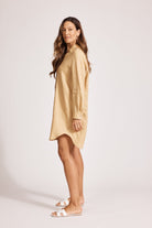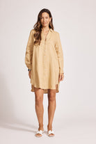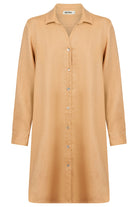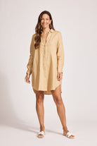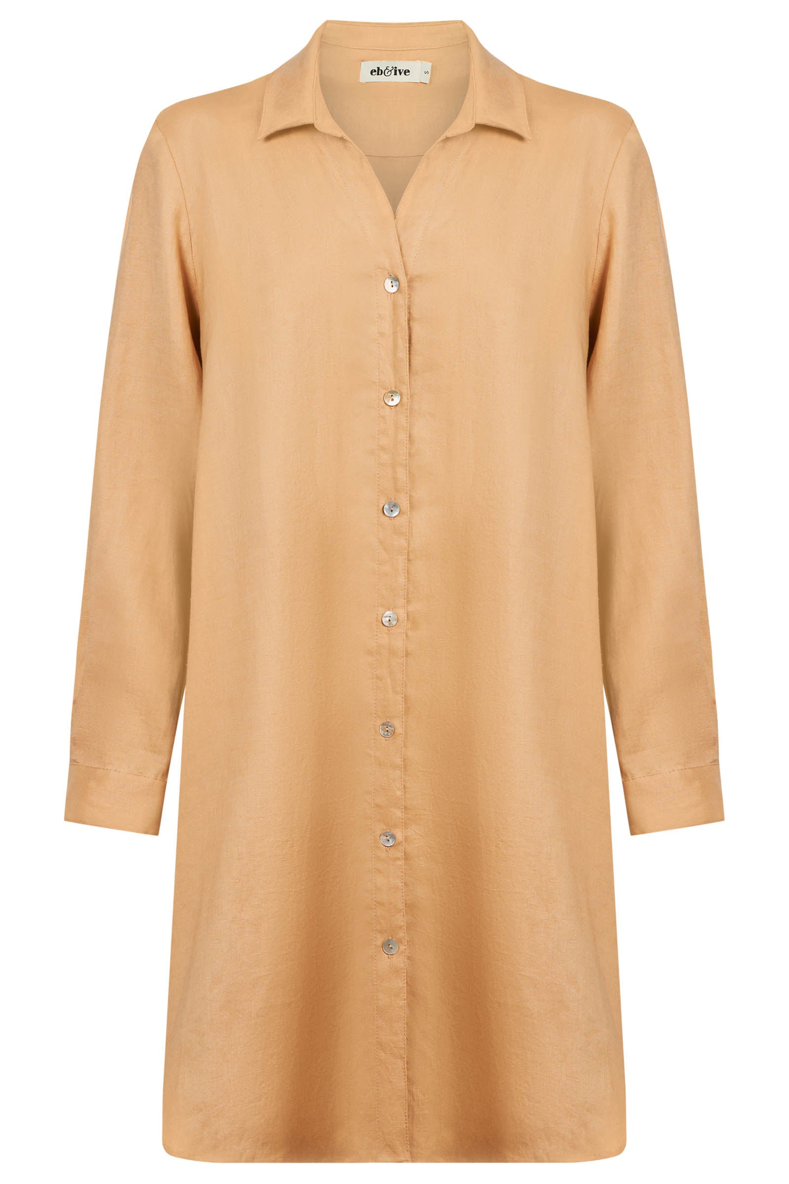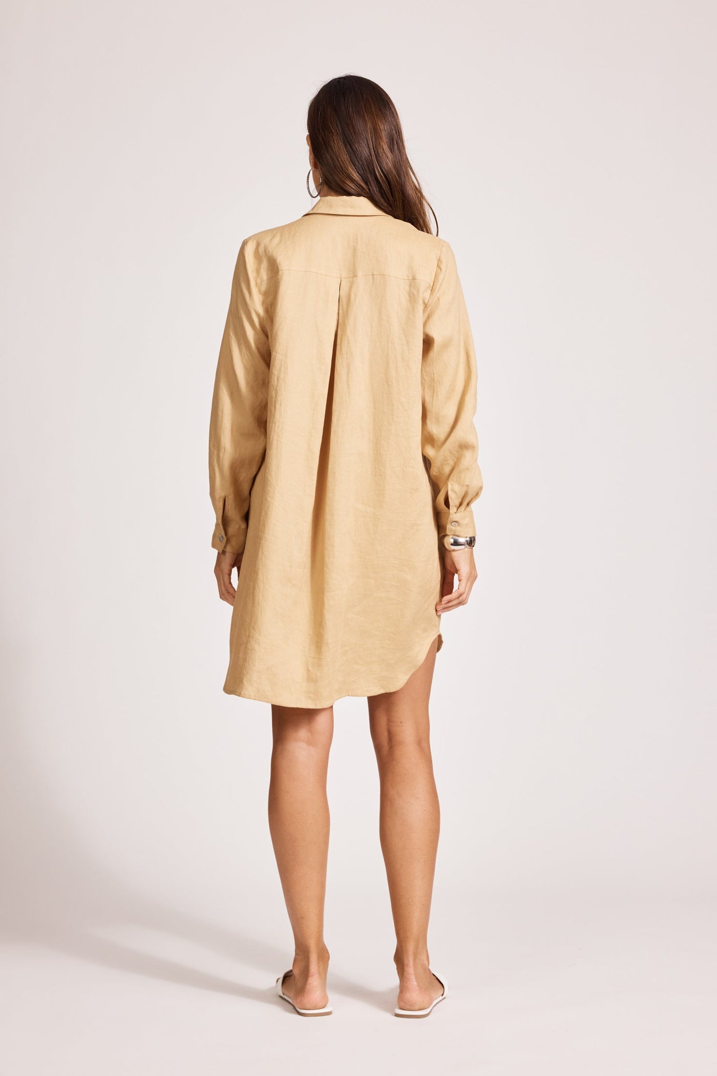 A relaxed staple shirt dress, perfect for warm weather holidays. Crafted from 100% Linen for breathable ease. Features a classic collar, shell button-through front, long sleeves, curved hemline, and functional pockets.