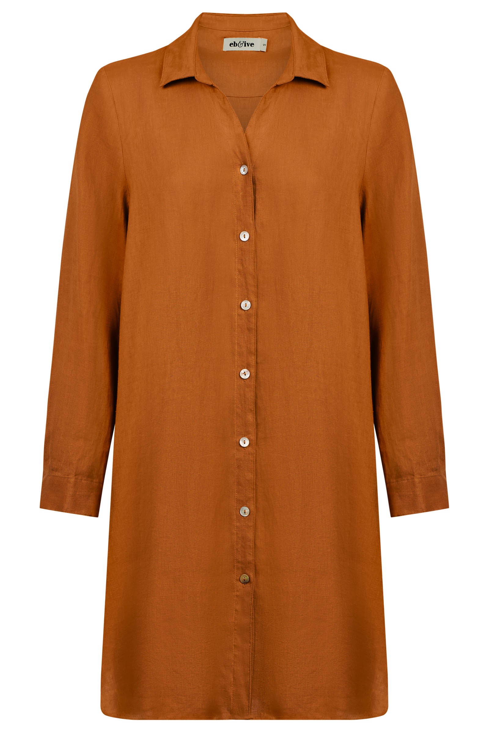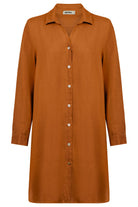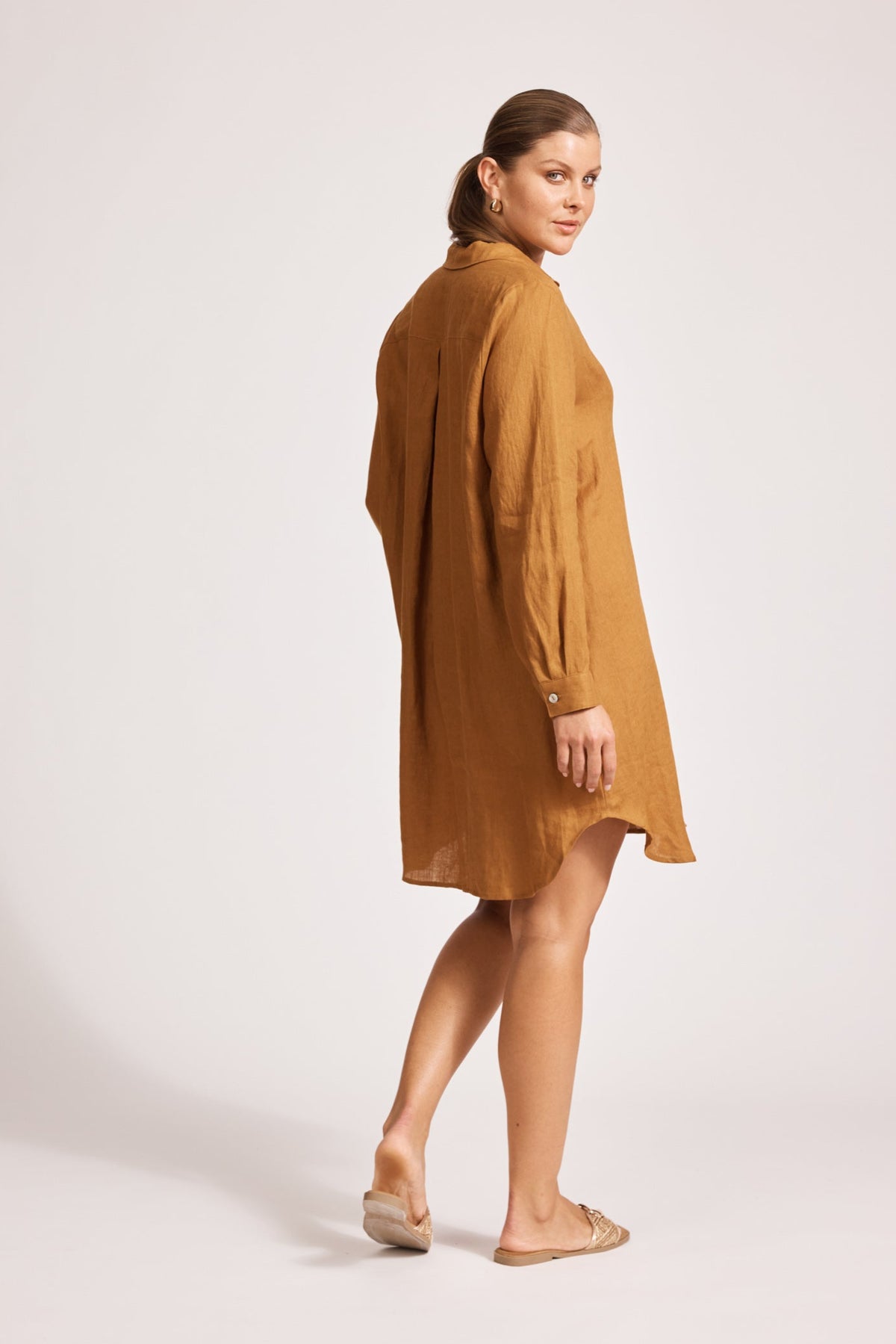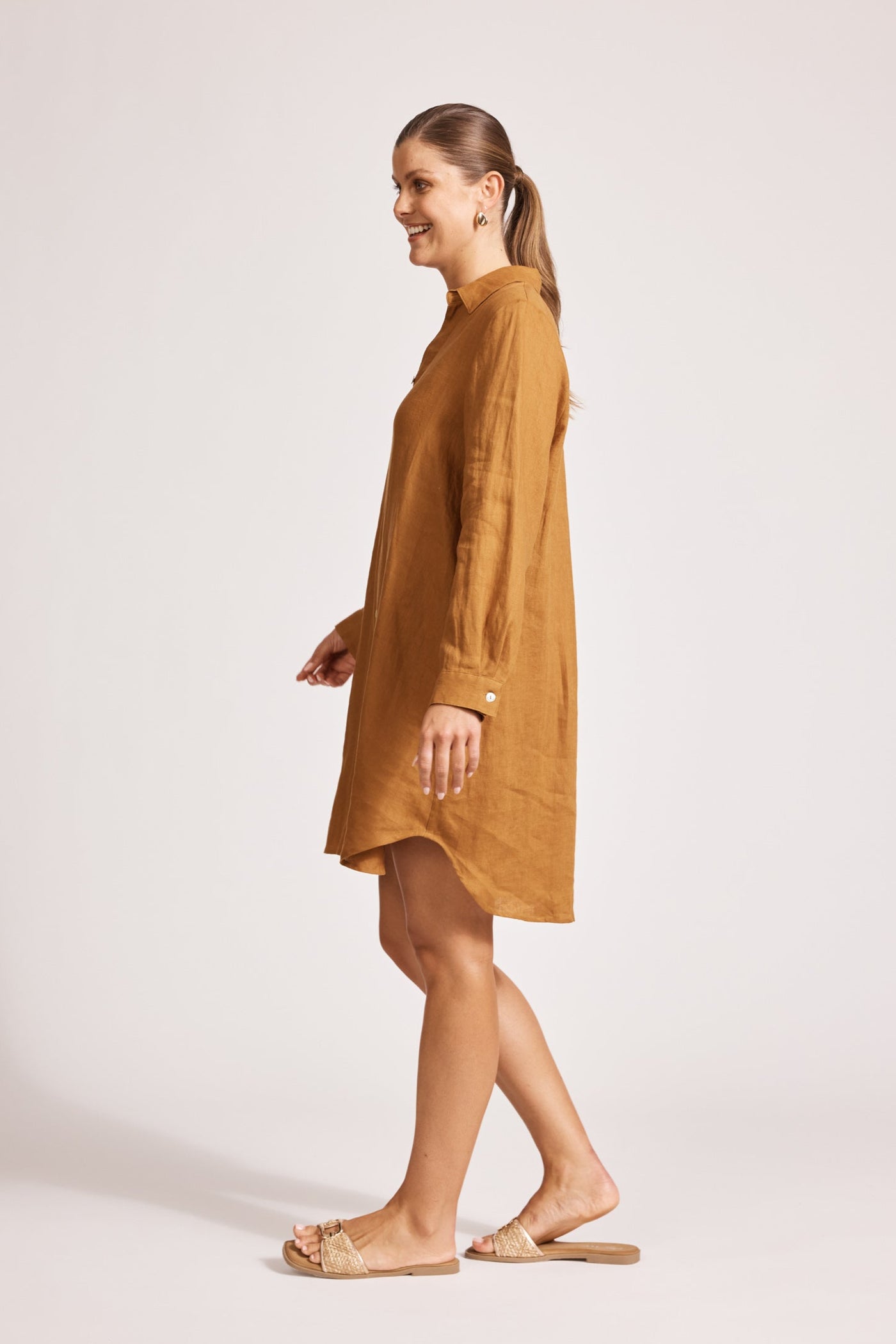A relaxed staple shirt dress, perfect for warm weather holidays. Crafted from 100% Linen for breathable ease. Features a classic collar, shell button-through front, long sleeves, curved hemline, and functional pockets.