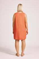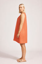 A relaxed linen dress designed for warm weather ease. Crafted from 100% linen with a soft A-line silhouette. Features exposed shoulders, side pockets, contrast topstitching on the front panel, button closure at the back neck, and wide cuffed hem.