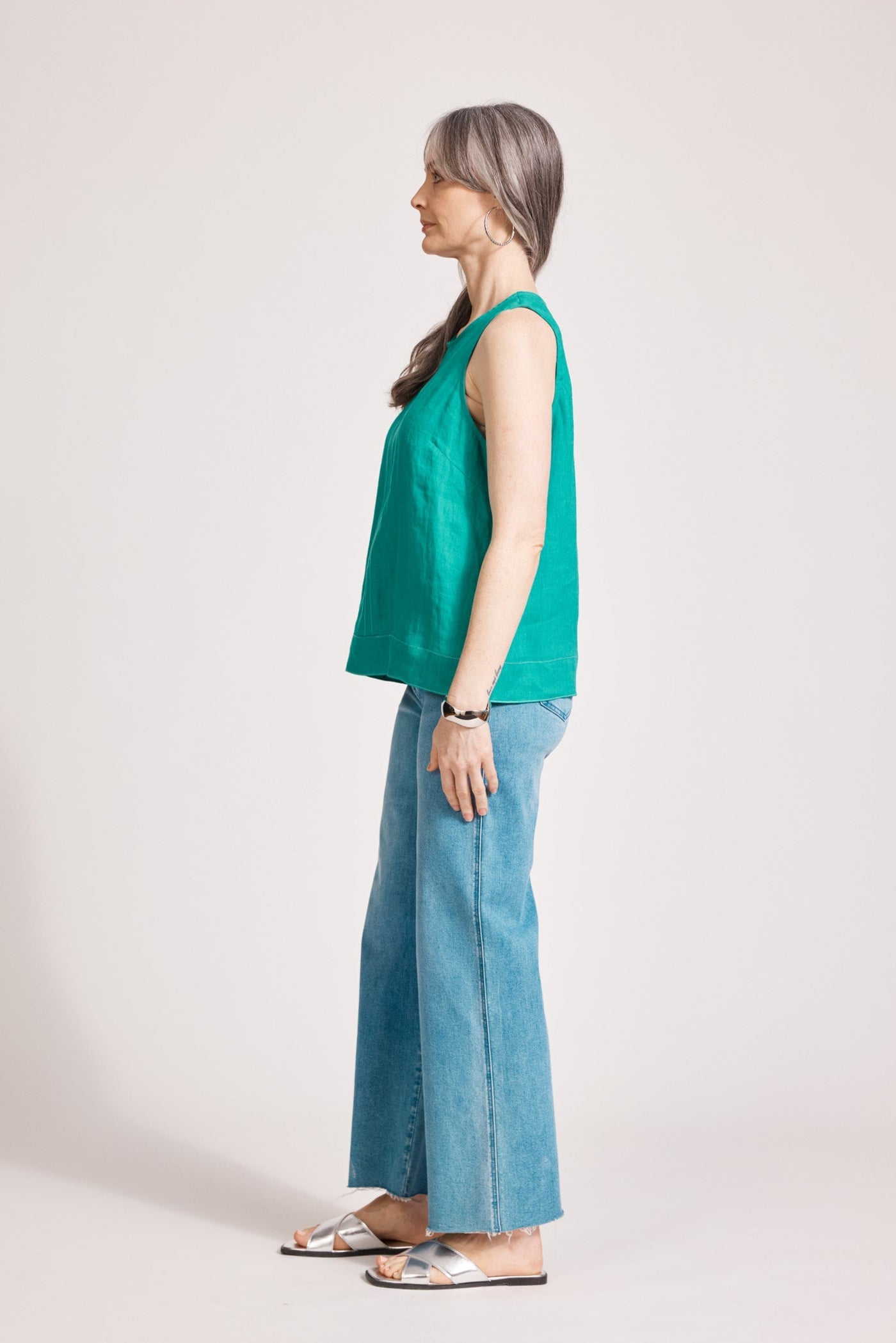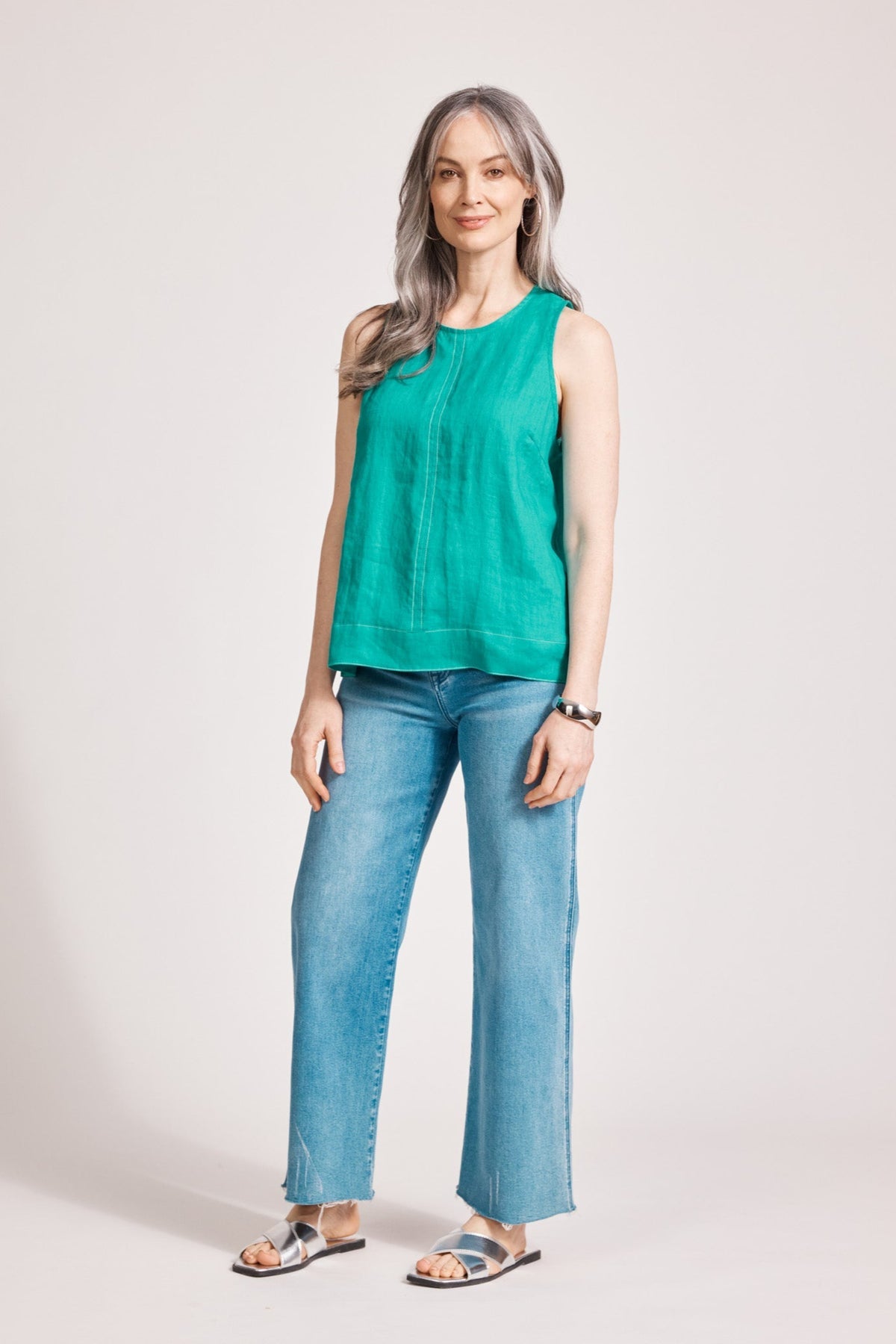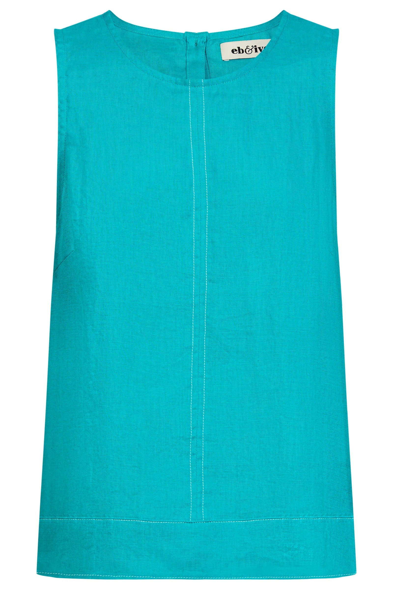 A relaxed linen tank with refined detailing. Crafted from 100% linen for breathable comfort. Features exposed shoulders, contrast decorative topstitching, button closure at the back neck, wide cuffed hem, and soft A-line silhouette.