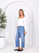 Characteristics of Toni Barrel-Leg Jeans include a fitted waist, flared-out shape around the mid-leg, and tapered silhouette at the bottom, which exudes the look of, well, a barrel. It's the vibe of a cowboy ready for a showdown in the Wild, Wild West!!!