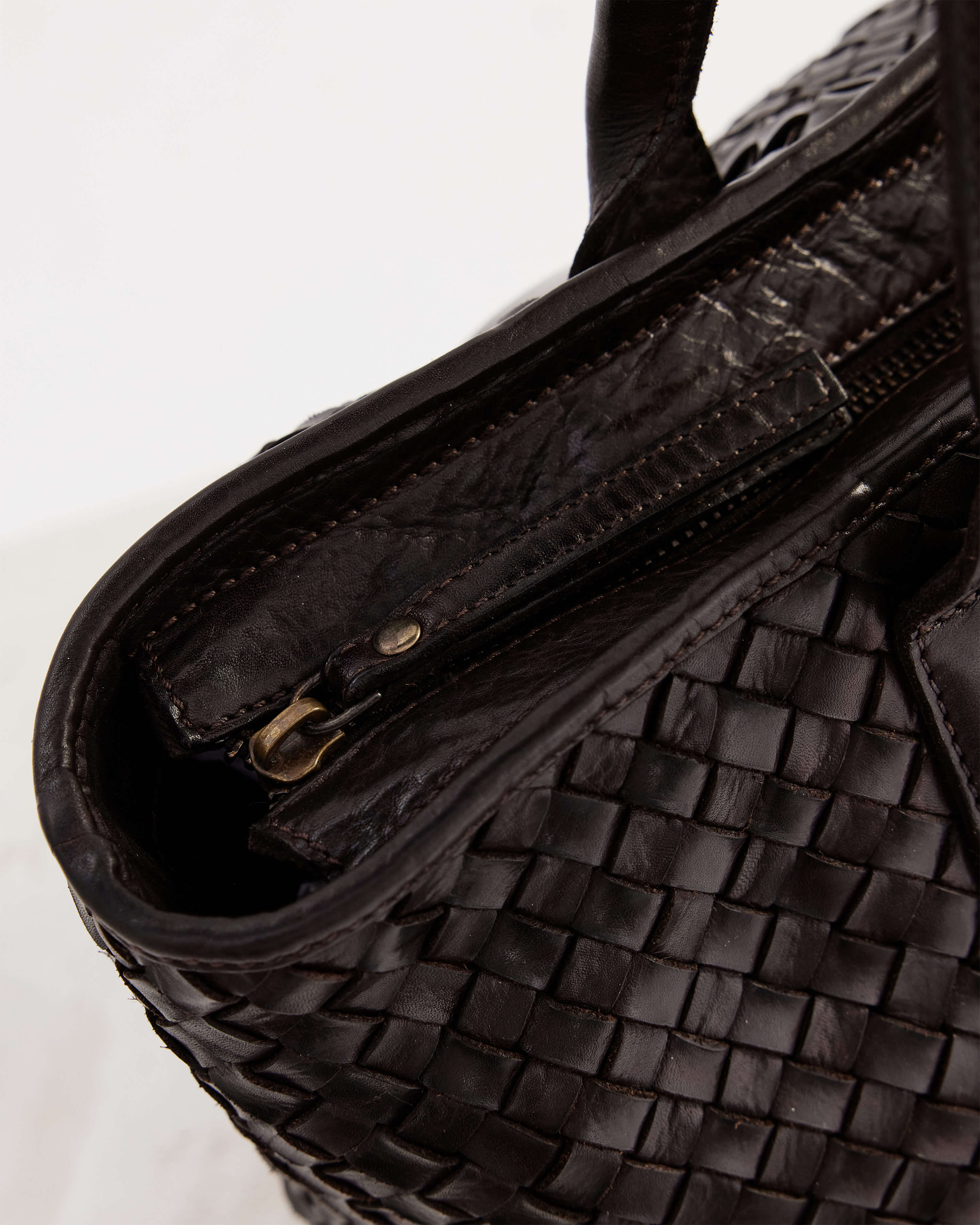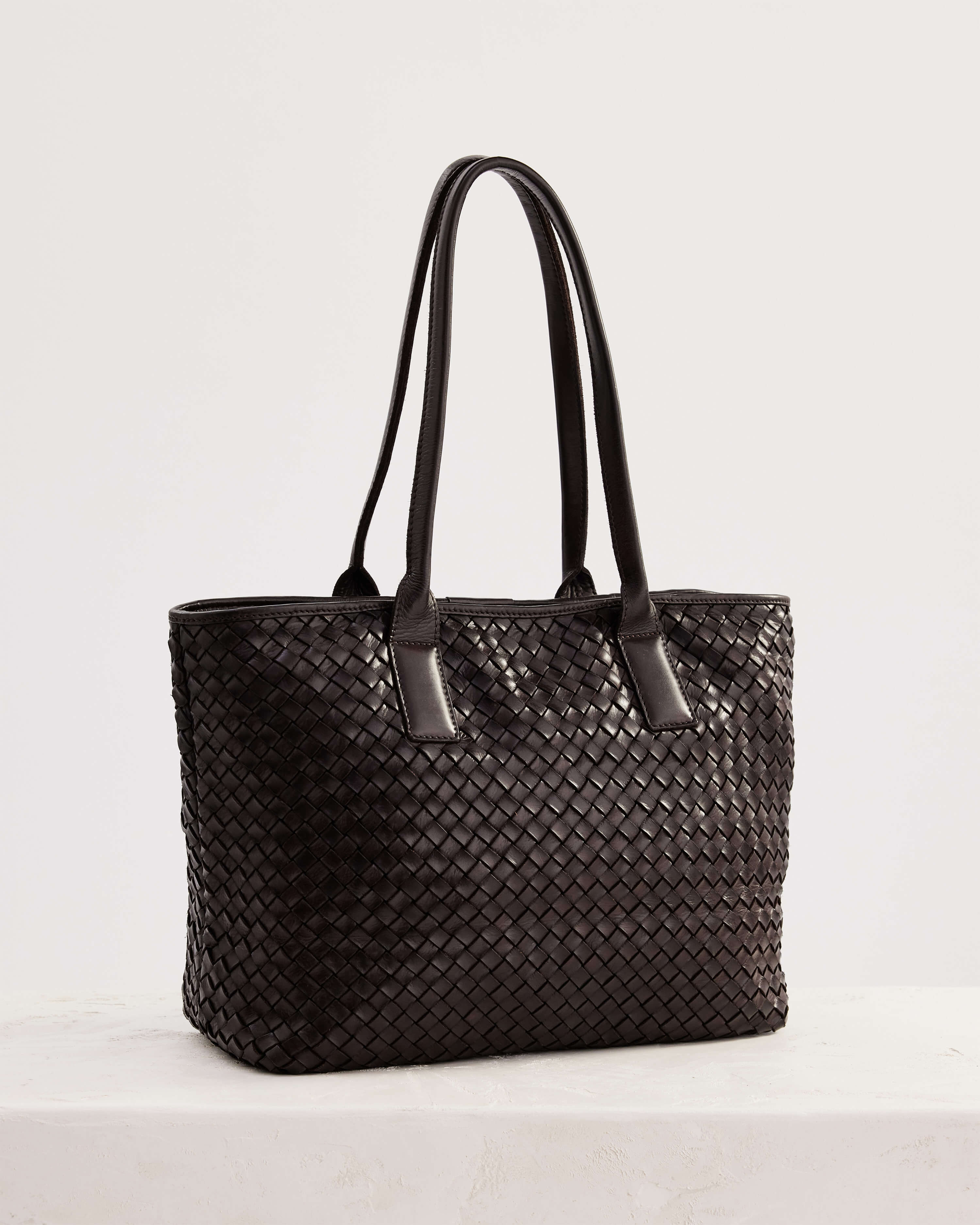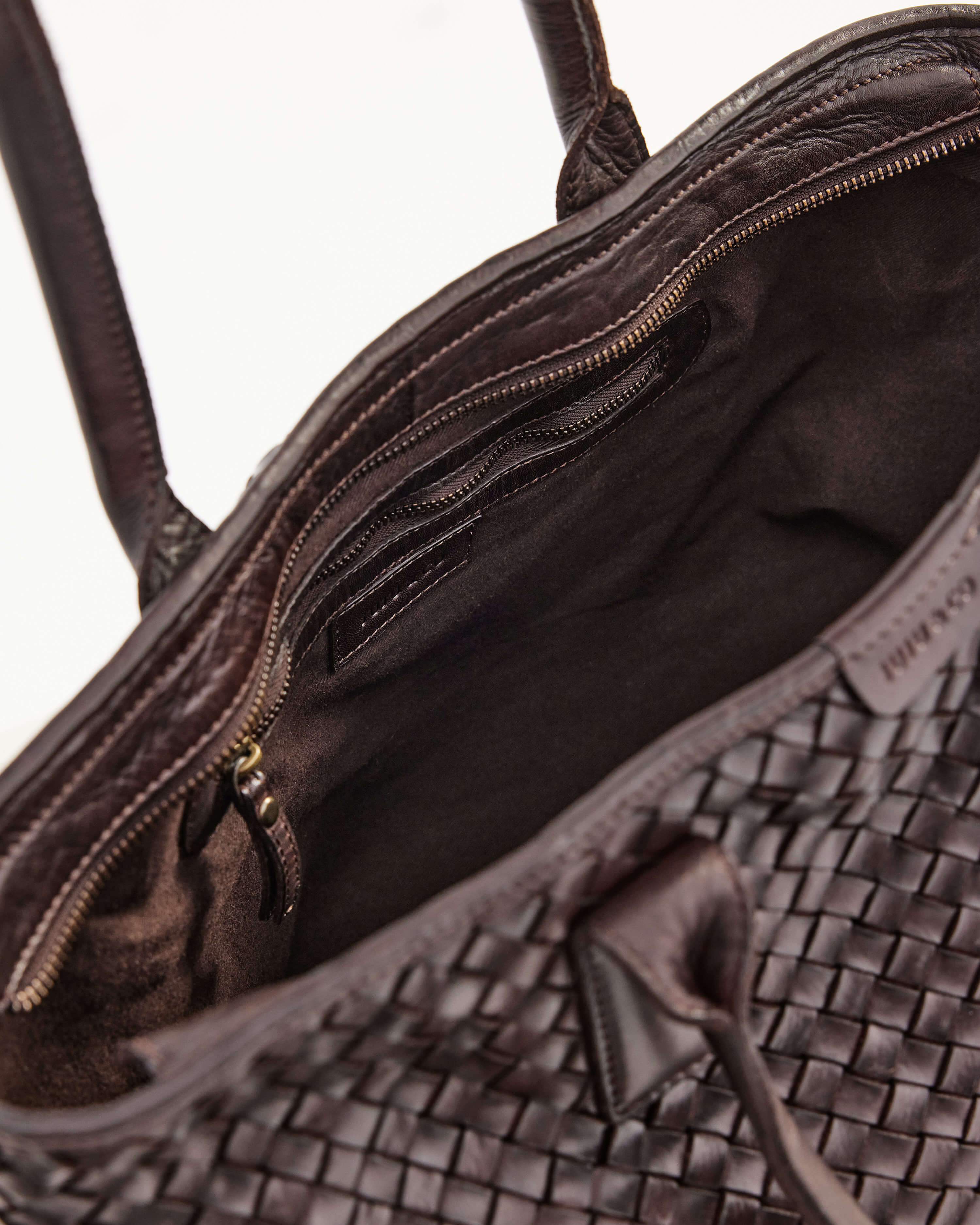 The Basque Tote in Chocolate is a large tote bag made from brown woven leather. This tote is the ultimate work bag, with ample space for a laptop, and a top zip closure to keep your things secure.