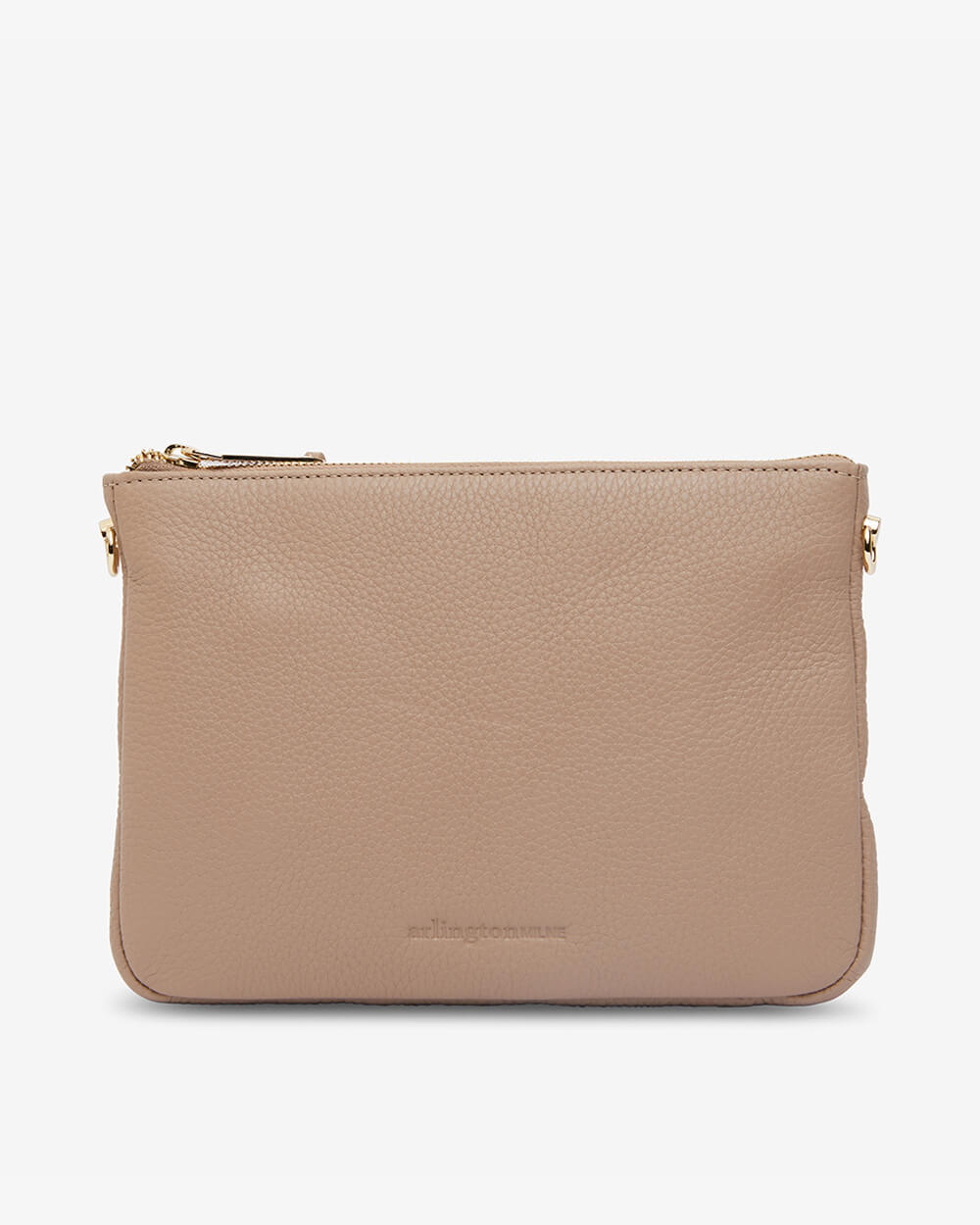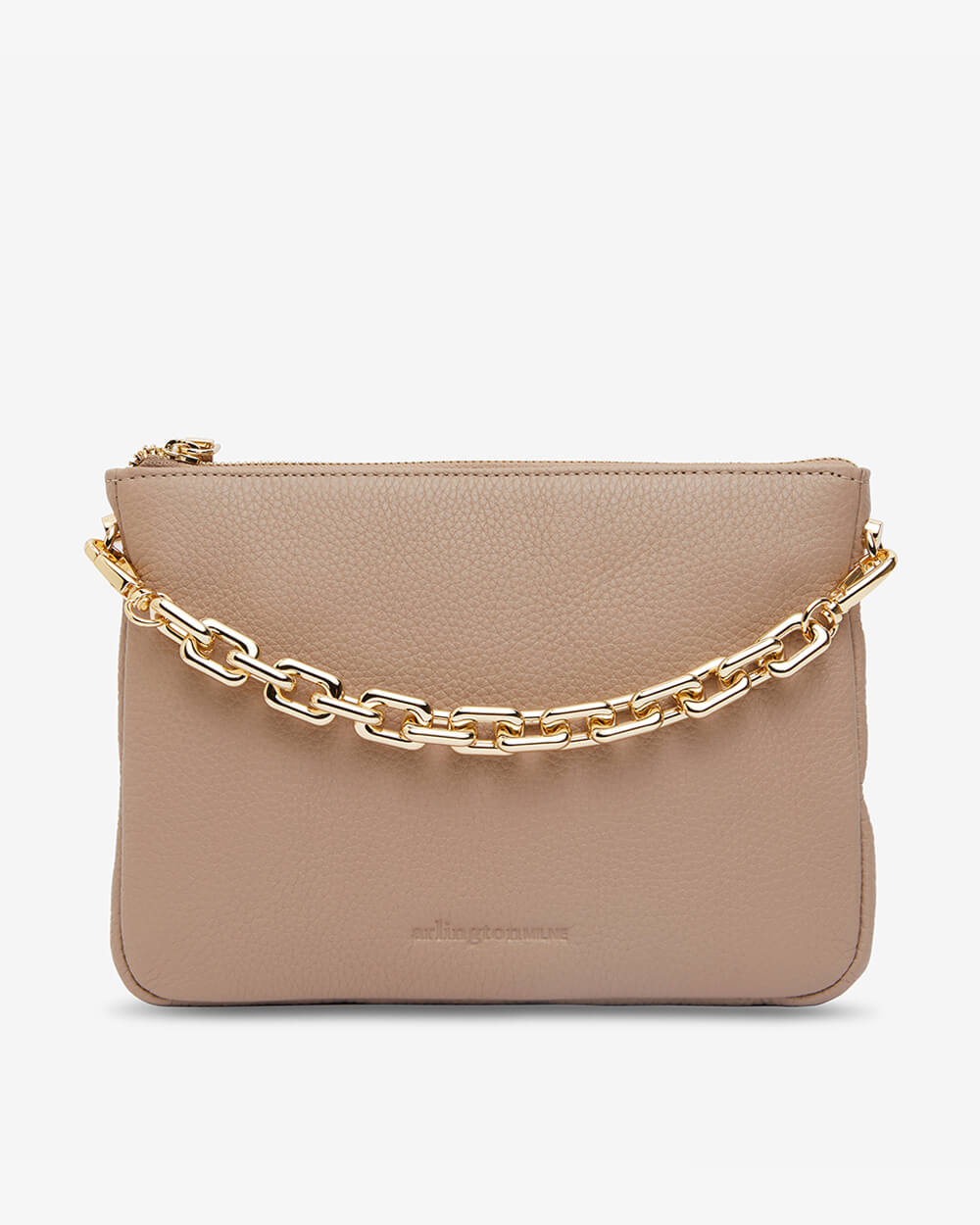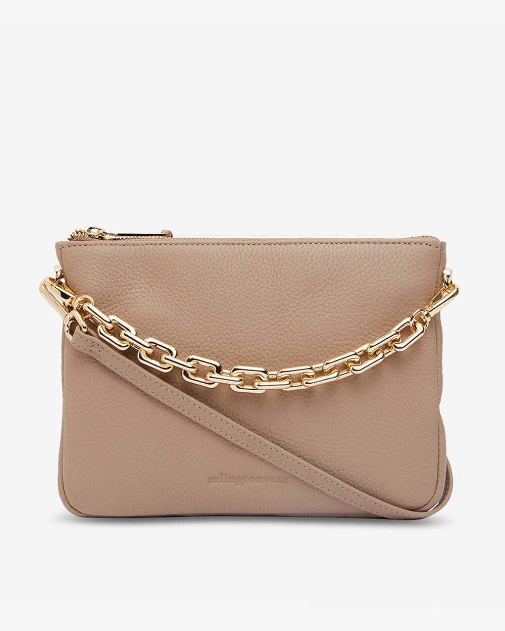 The Arlington Milne Samantha Crossbody in Black is crafted from premium leather and features a decorative front chain detail. Samantha can be carried clutch style or worn using the long shoulder strap. The top zipper opens to reveal Arlington Milnes signature hot pink lining, a zipper pocket, and an open top slip pocket, both with leather trim.