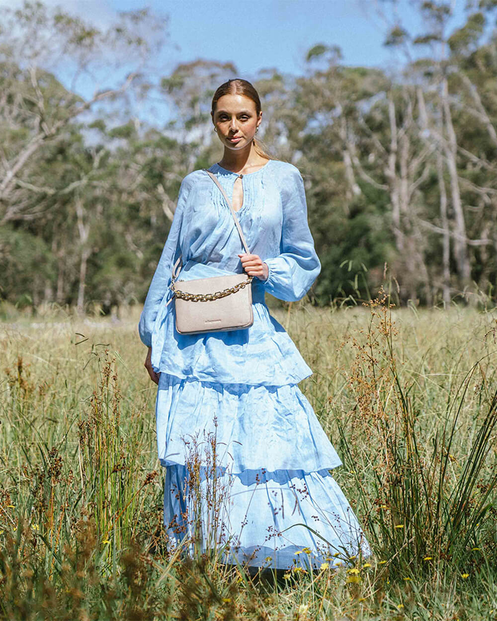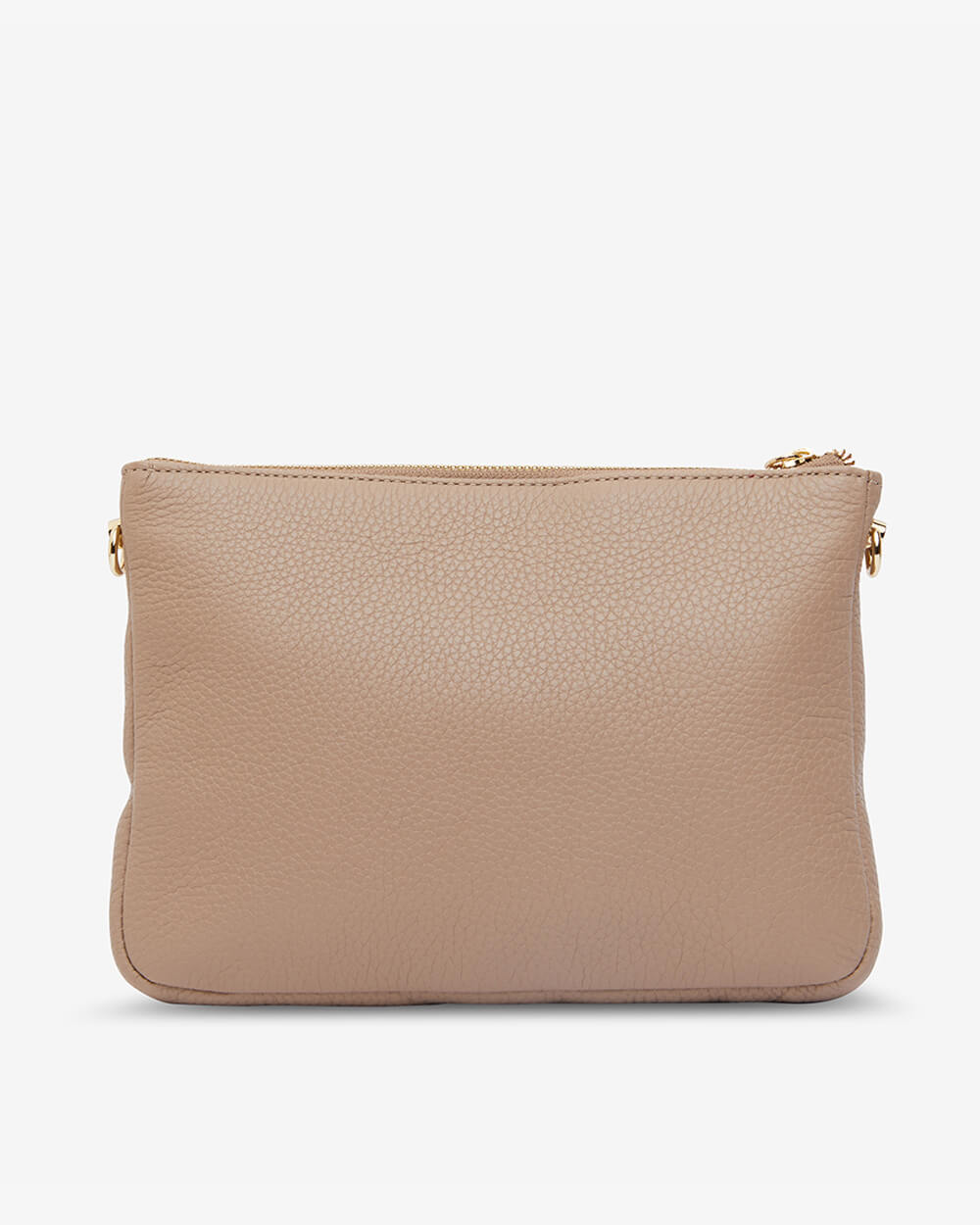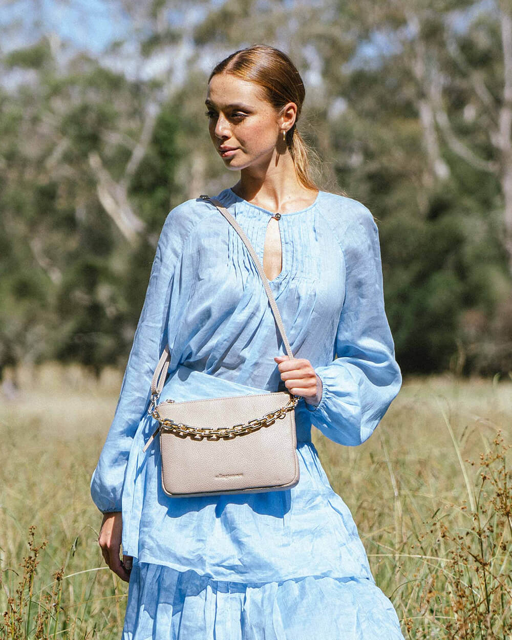 The Arlington Milne Samantha Crossbody in Black is crafted from premium leather and features a decorative front chain detail. Samantha can be carried clutch style or worn using the long shoulder strap. The top zipper opens to reveal Arlington Milnes signature hot pink lining, a zipper pocket, and an open top slip pocket, both with leather trim.