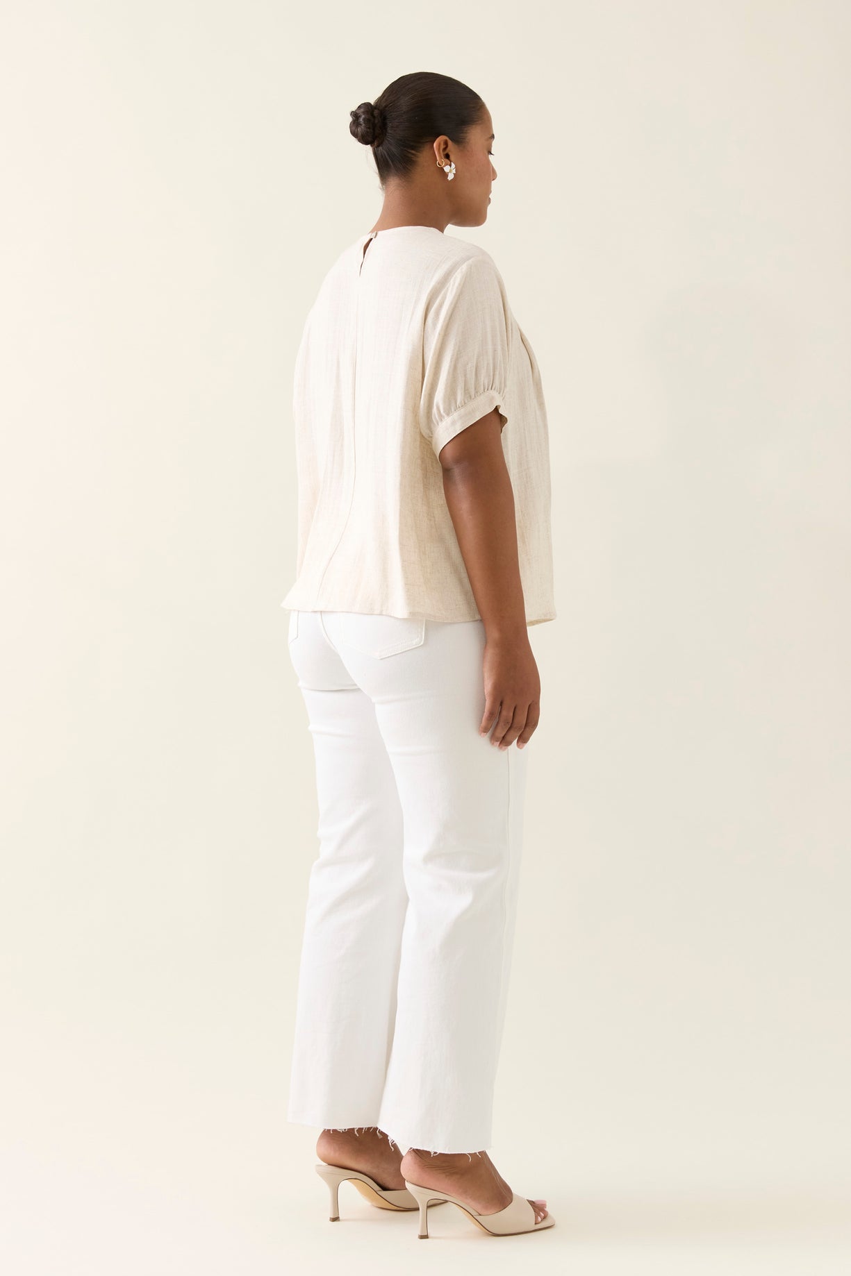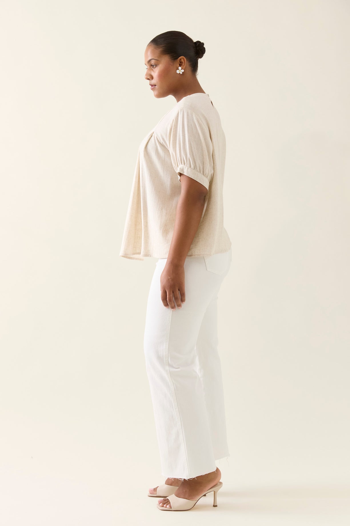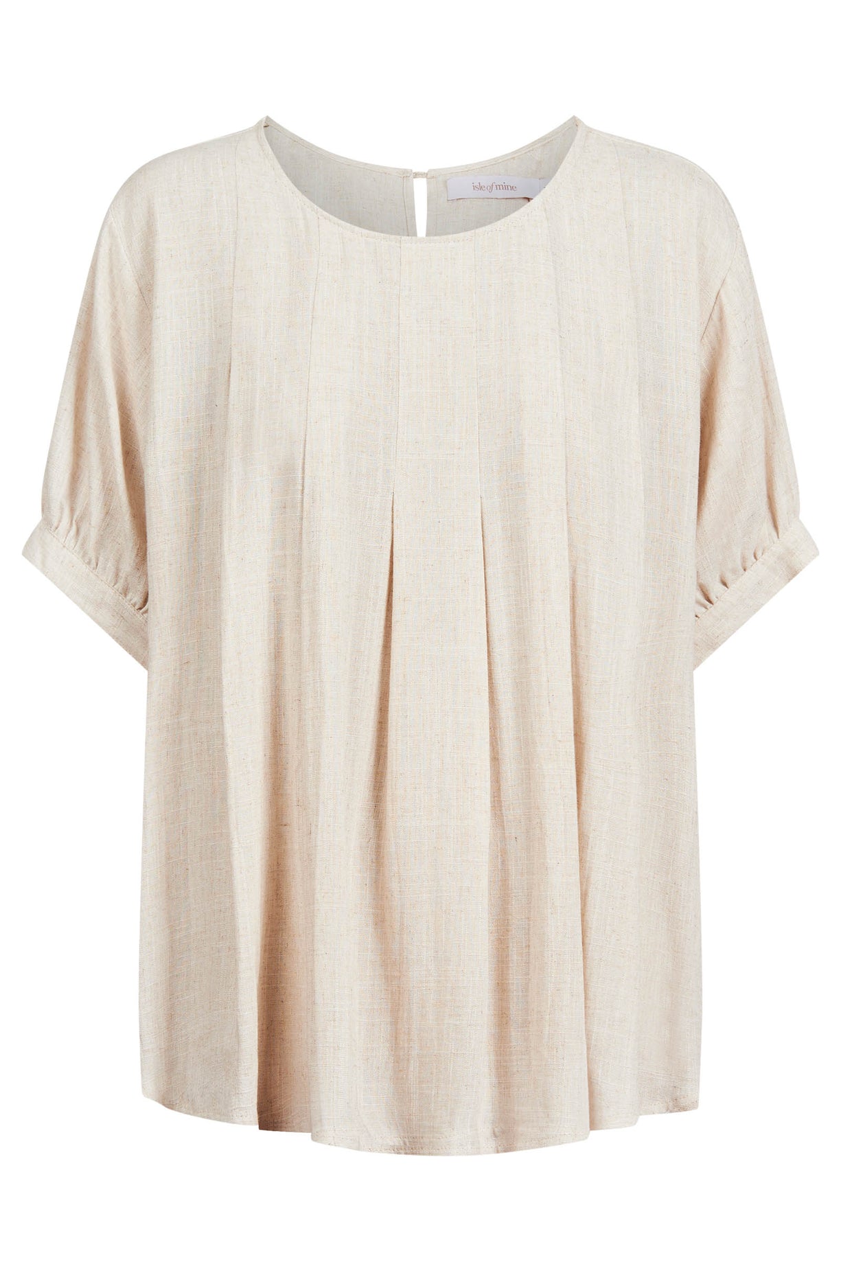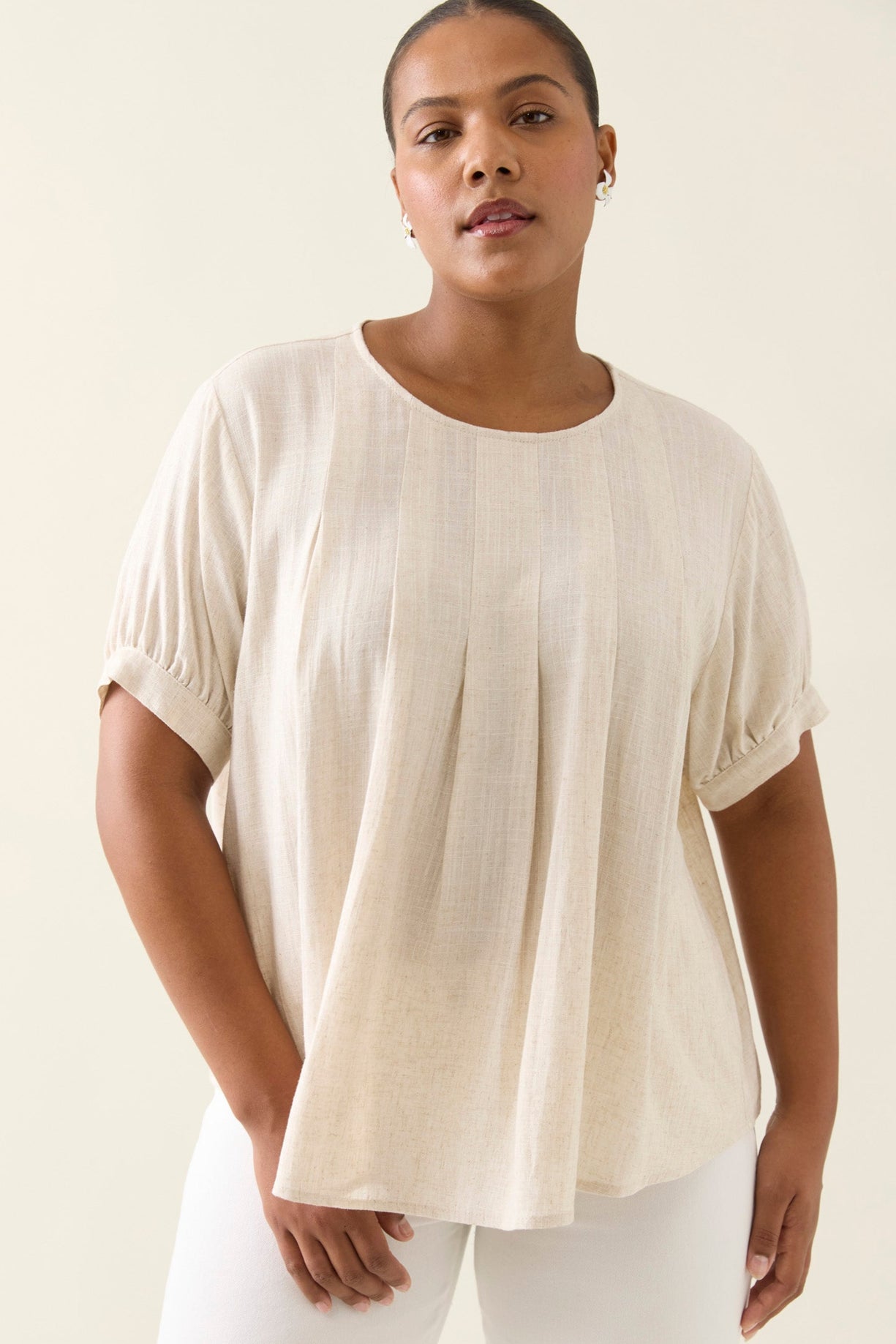 A relaxed linen-blend top with soft front pleats that bring subtle texture to the neckline. Finished with a round neck, keyhole button closure at the back, and cuffed short sleeves for laid-back comfort.