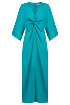 A show-stopping linen maxi designed for elegant summer dressing. Crafted from 100% linen for breathability. Features a fixed twist detail at the front to contour the waist, V neckline with hook-and-eye closure option, and mid-length relaxed sleeves.