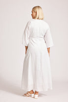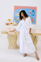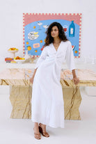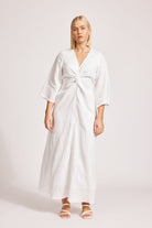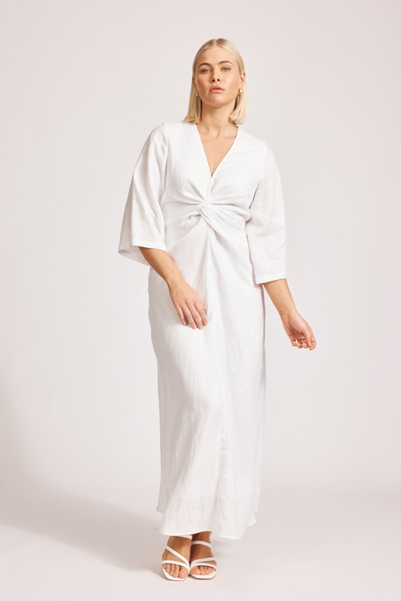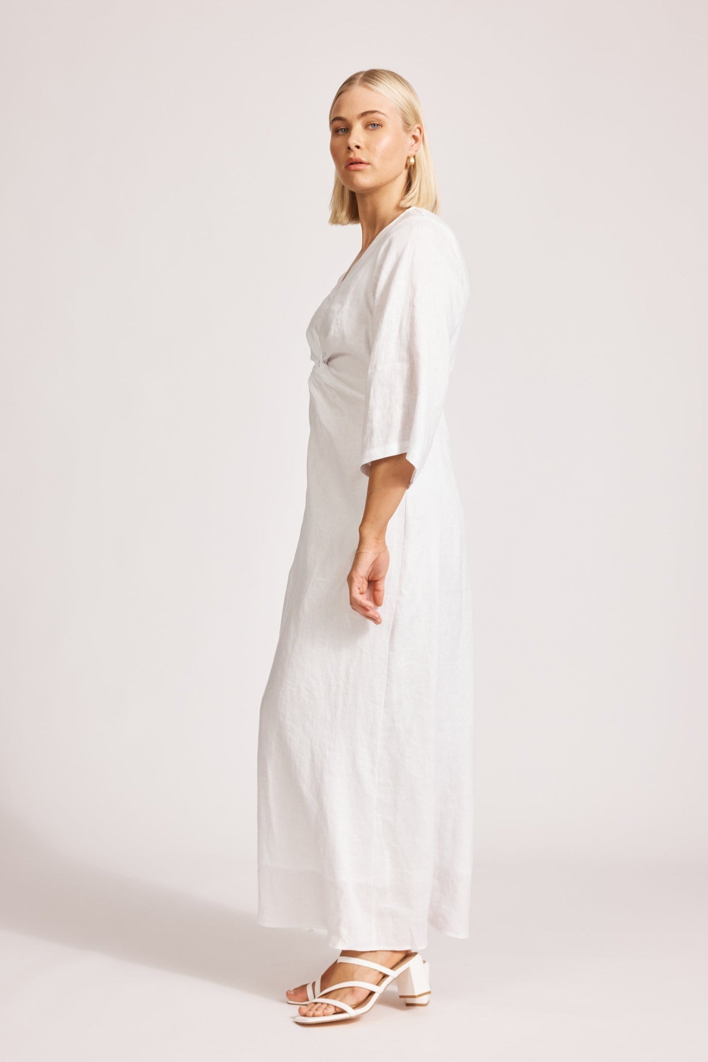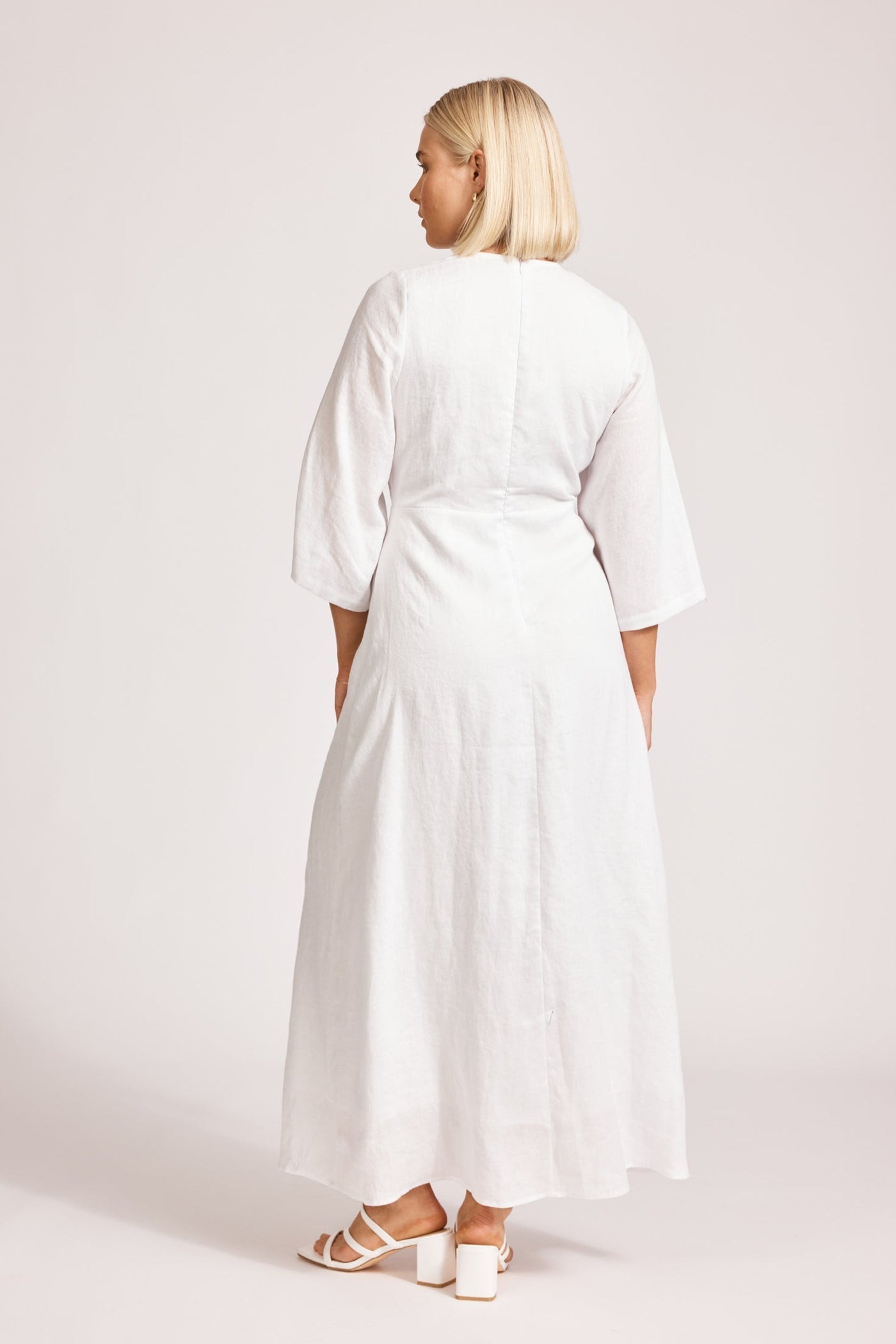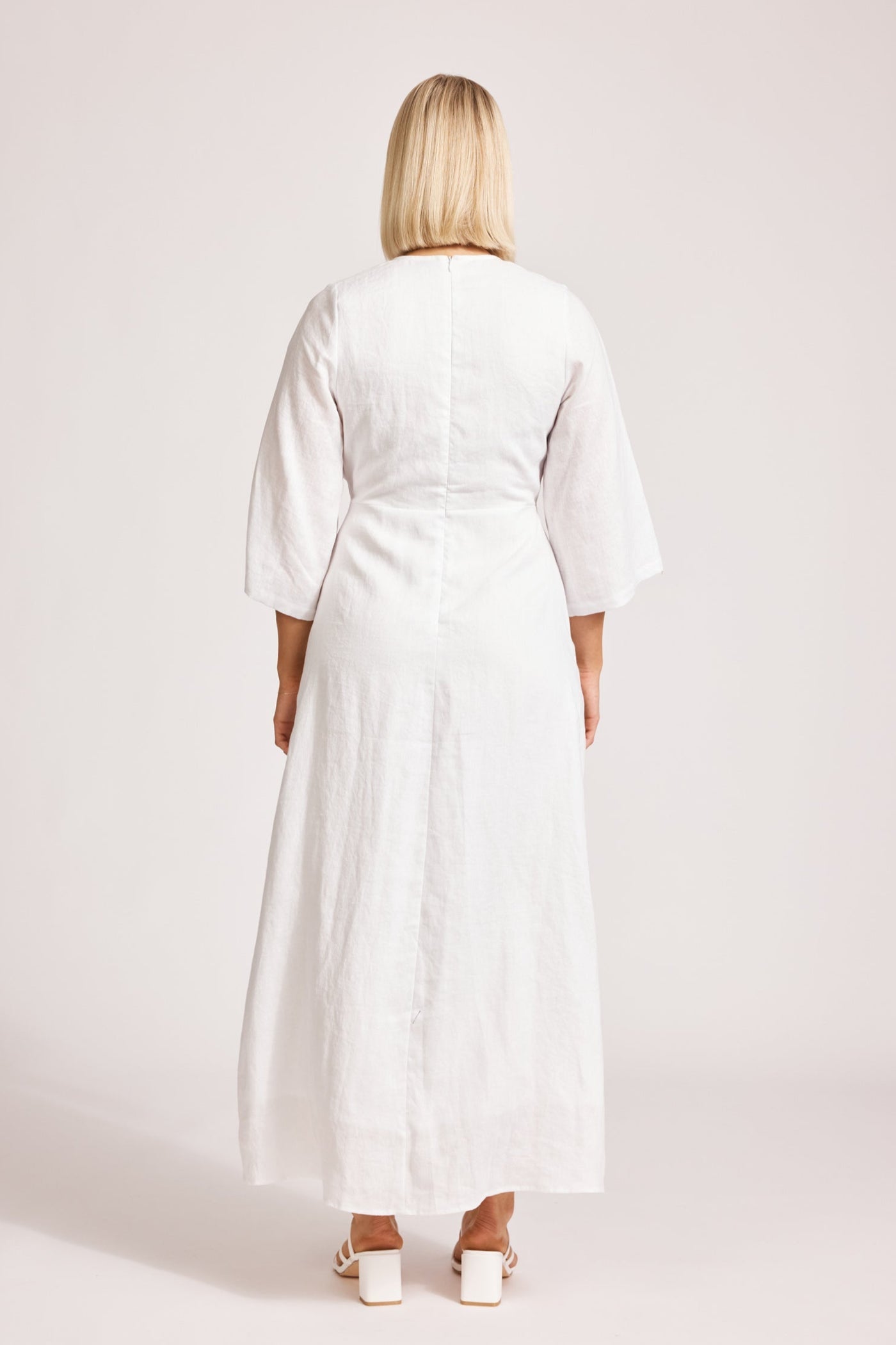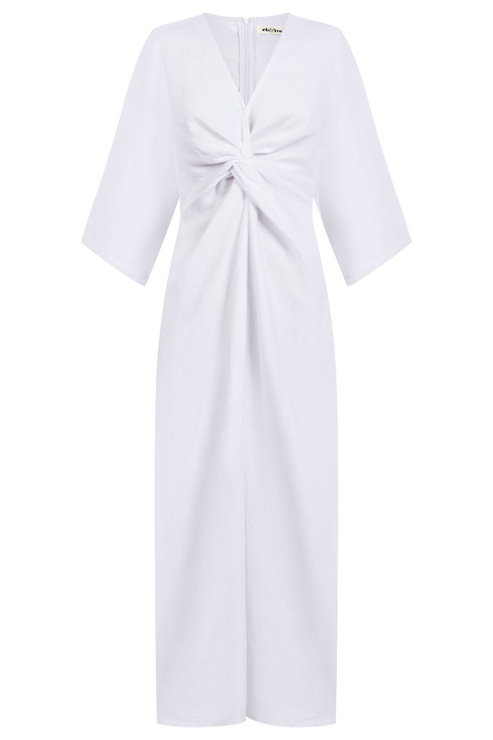 A show-stopping linen maxi designed for elegant summer dressing. Crafted from 100% linen for breathability. Features a fixed twist detail at the front to contour the waist, V neckline with hook-and-eye closure option, and mid-length relaxed sleeves.
