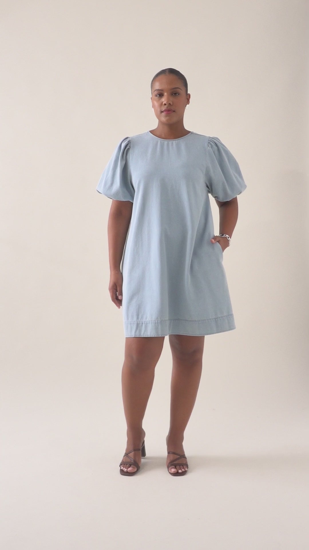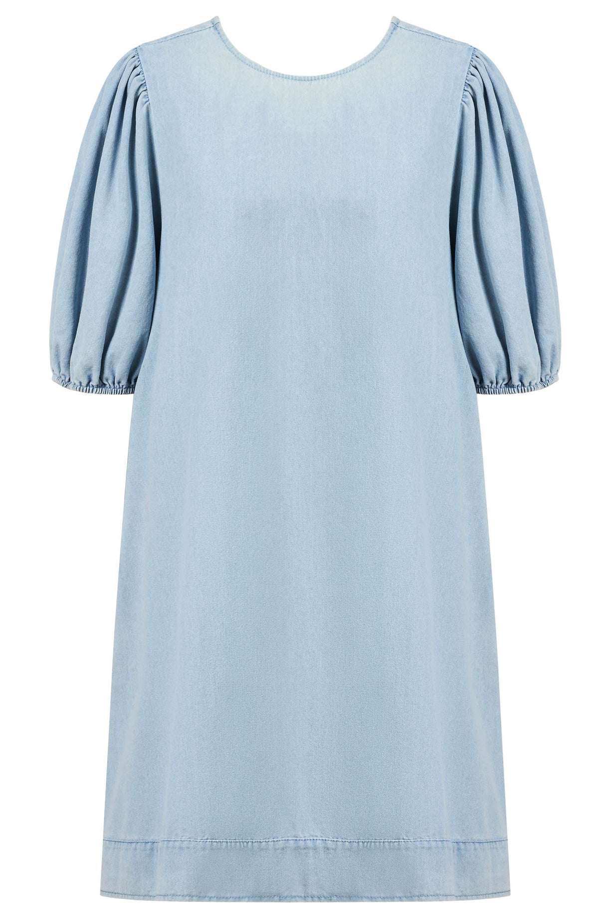 A refined staple that combines comfort with structured style. Made from lightweight denim, this dress features a round neckline, puff sleeves and side seam pockets. A scooped back and topstitched wide hem complete the silhouette.