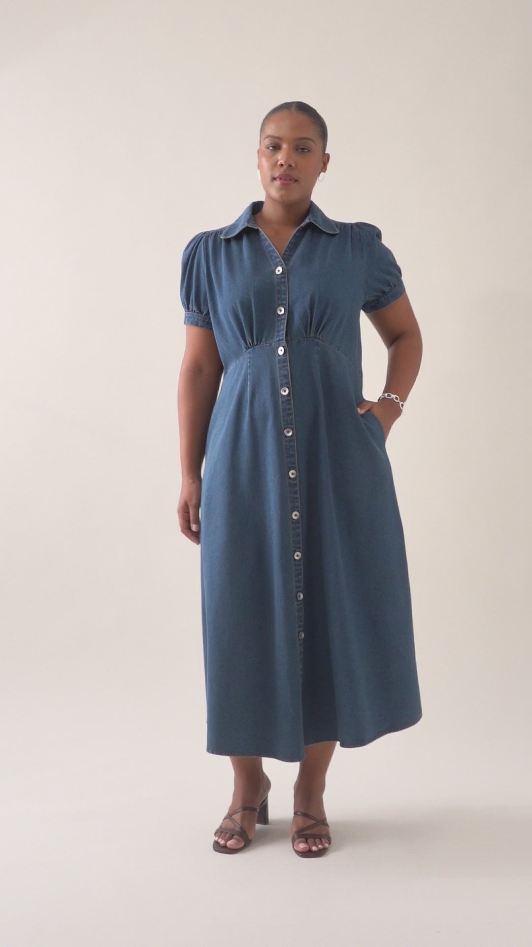 Designed in a breathable cotton denim, in two beautiful washes, the Sofie Denim Maxi is a button-through empire line dress with gathered bust detailing, fixed puff sleeves, and side seam pockets. Its 7/8 length and soft structure make it endlessly wearable.