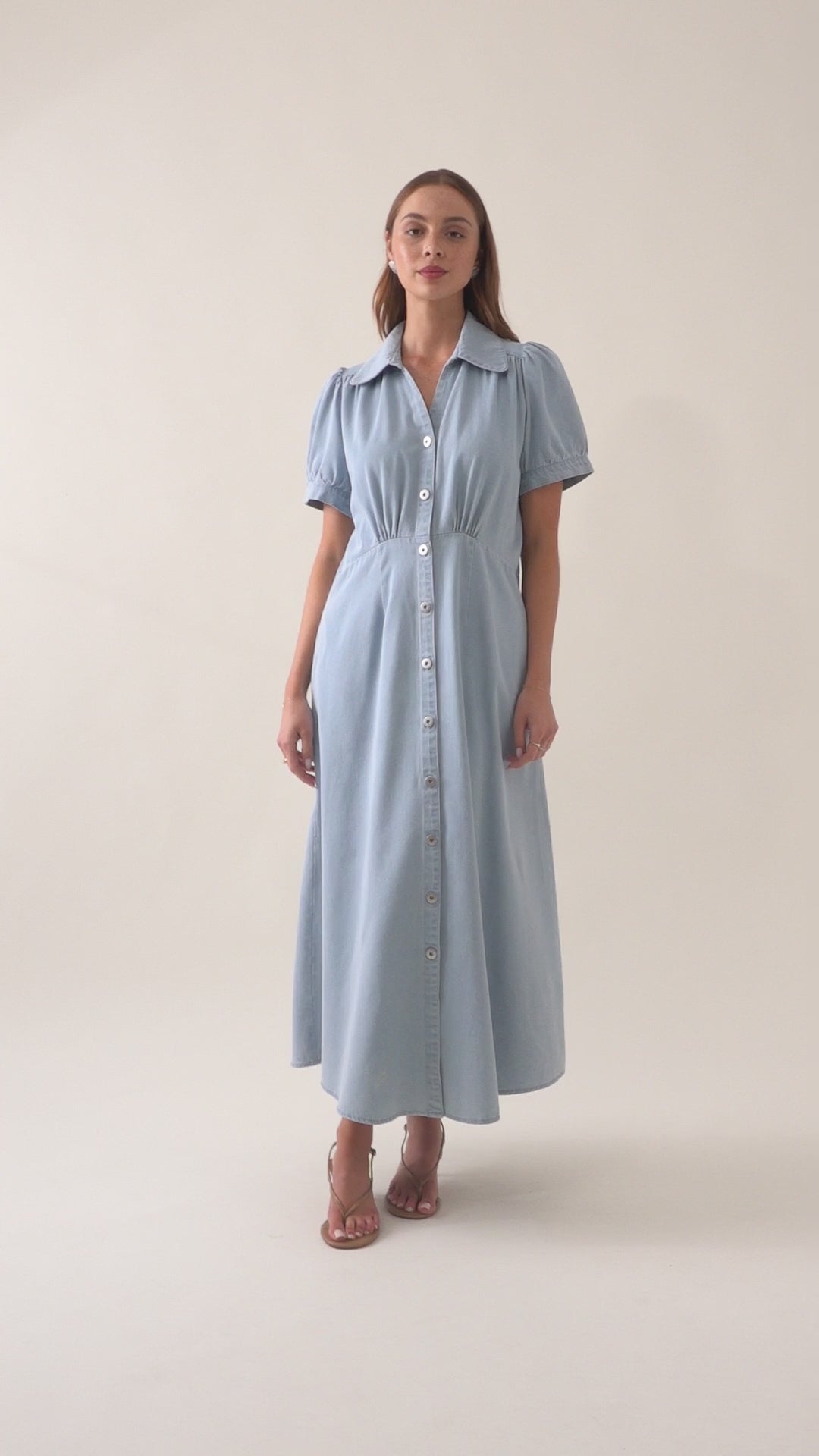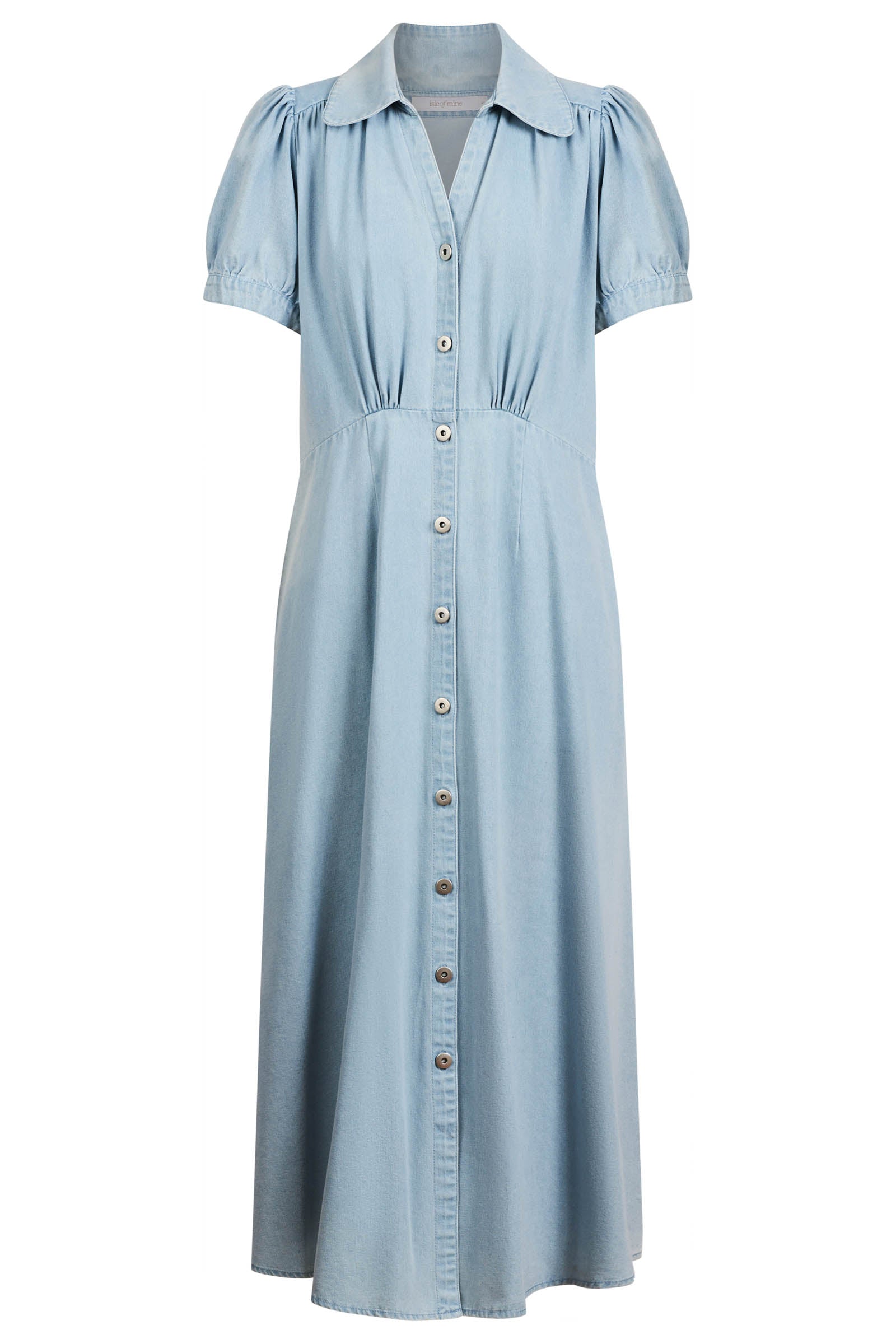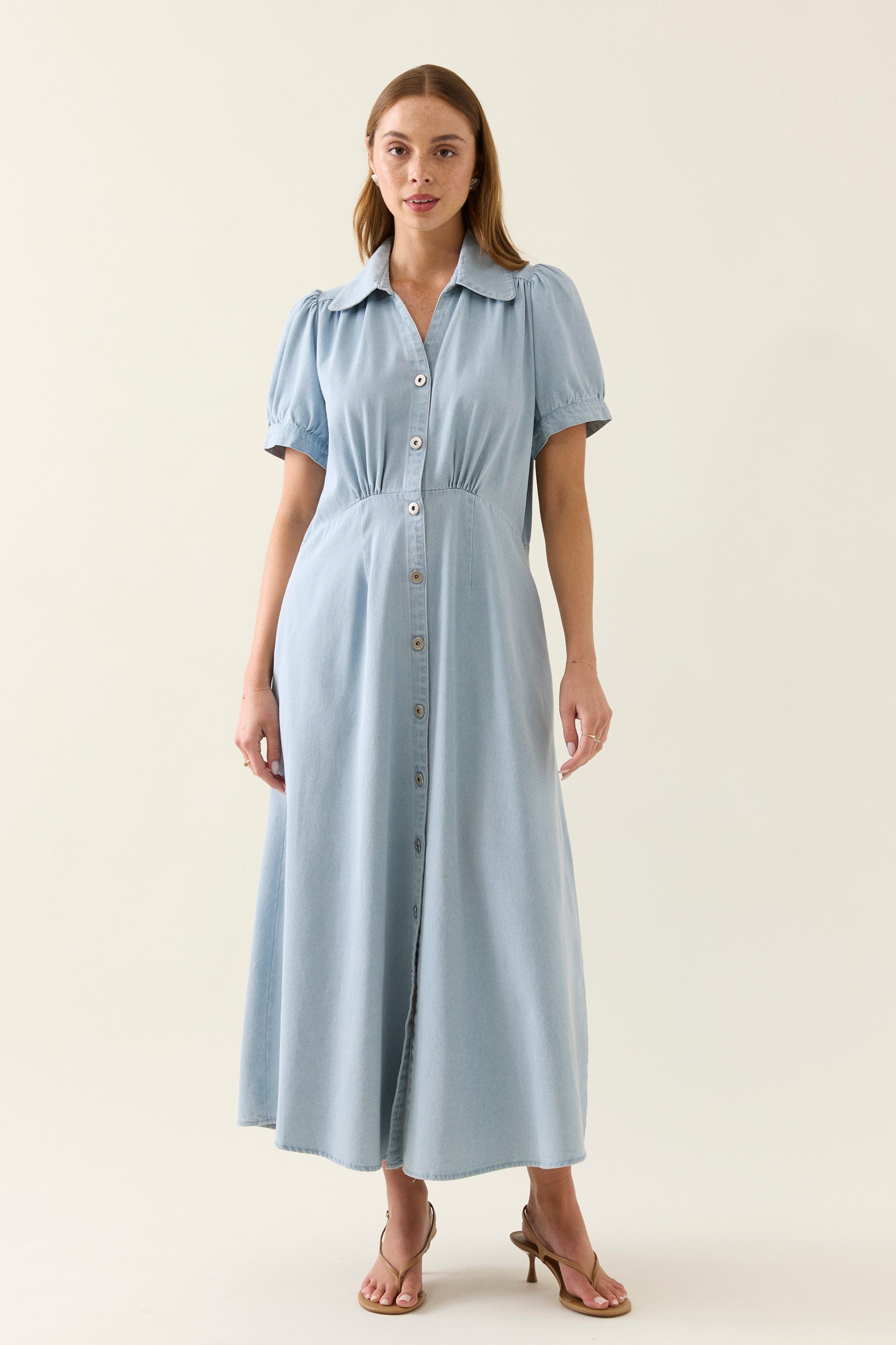 Designed in a breathable cotton denim, in two beautiful washes, the Sofie Denim Maxi is a button-through empire line dress with gathered bust detailing, fixed puff sleeves, and side seam pockets. Its 7/8 length and soft structure make it endlessly wearable.