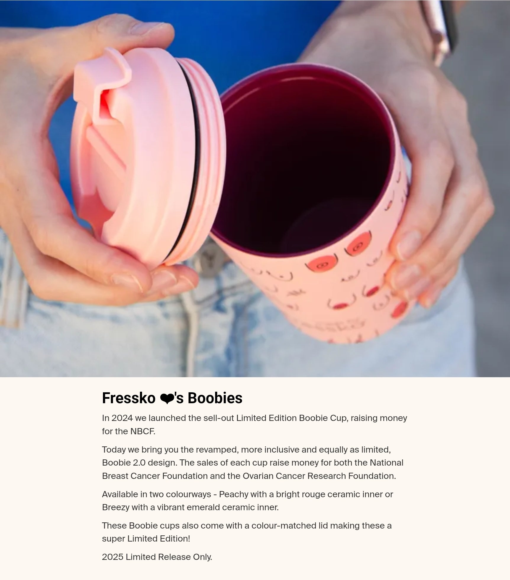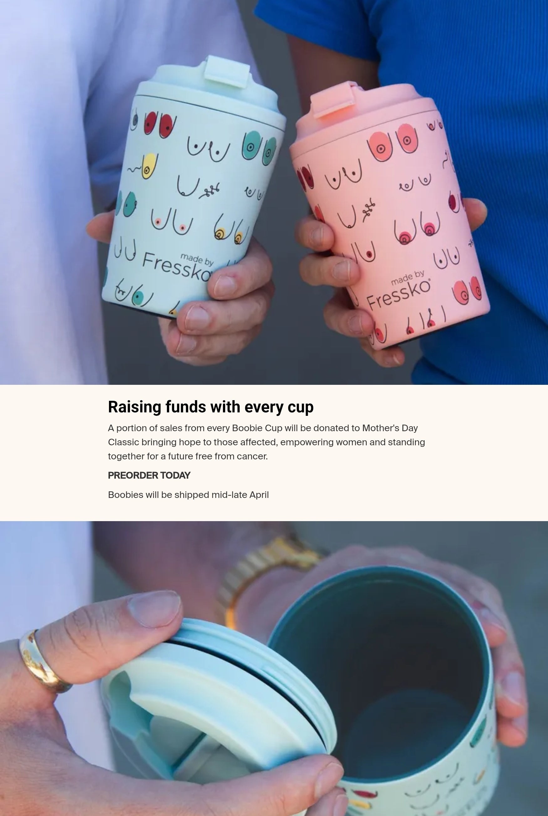 The “Boobie” Cup celebrates women’s beauty and uniqueness, with a portion of proceeds from every sale supporting the Mothers Day Classic. This limited edition cup stands as a symbol of solidarity in the fight against cancer, embodying empowerment and support in style!