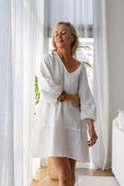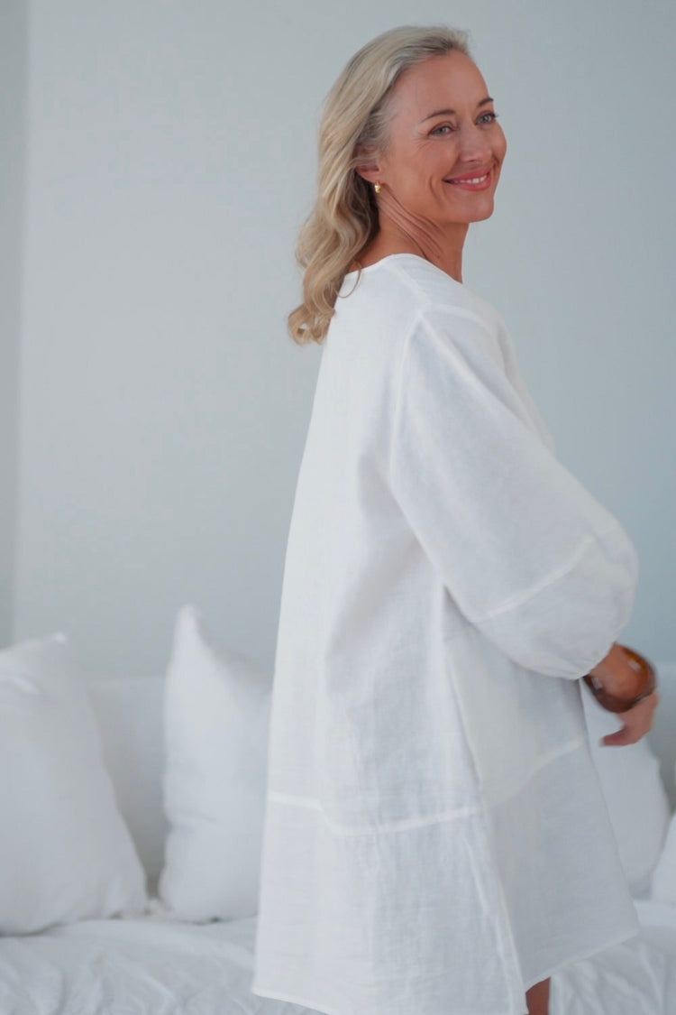 Crafted from breathable European linen and lightly lined with cotton, it feels soft on the skin and airy in warmer weather. A structured V neckline and balloon sleeves create a flattering shape, while deep side pockets add a practical touch.
