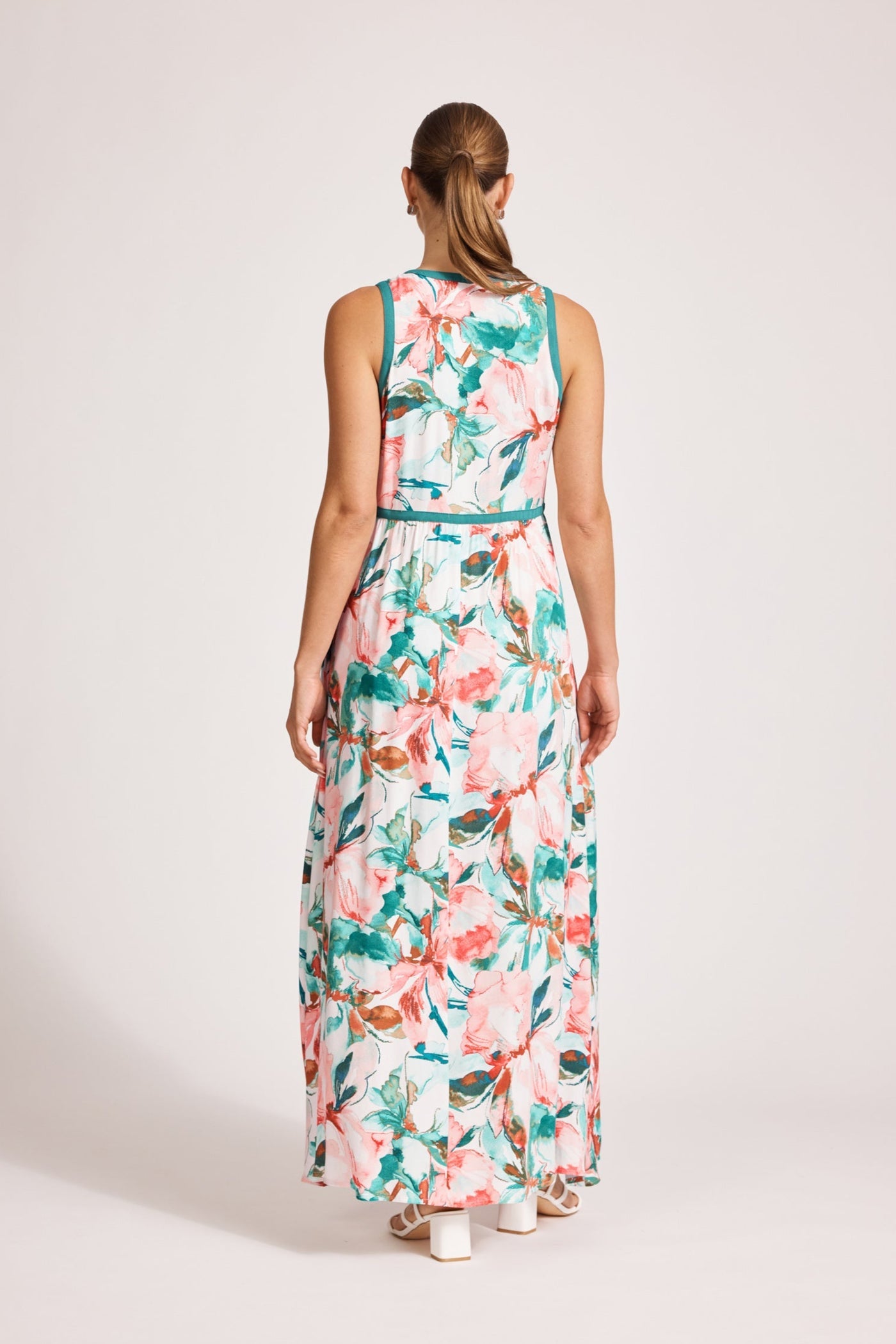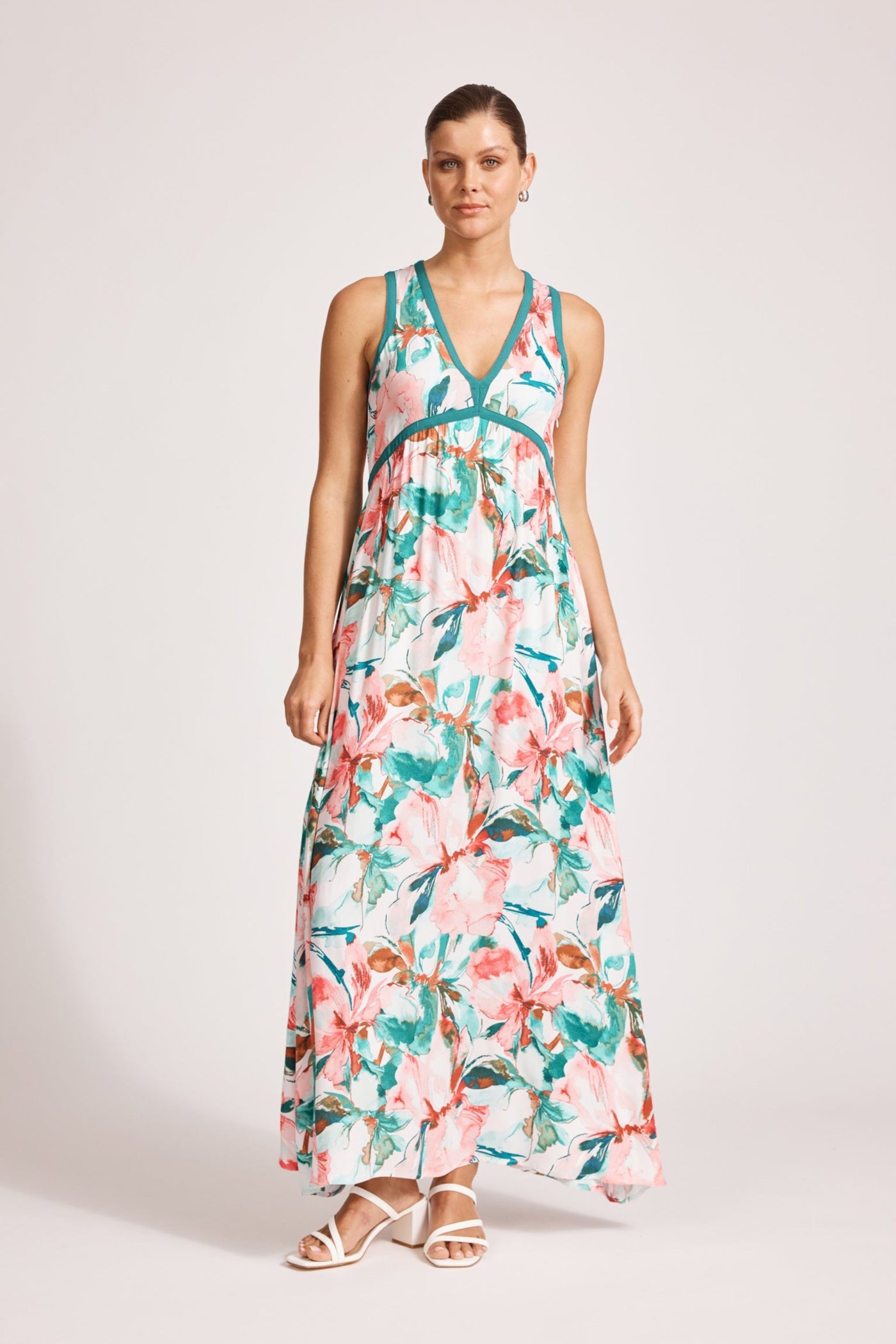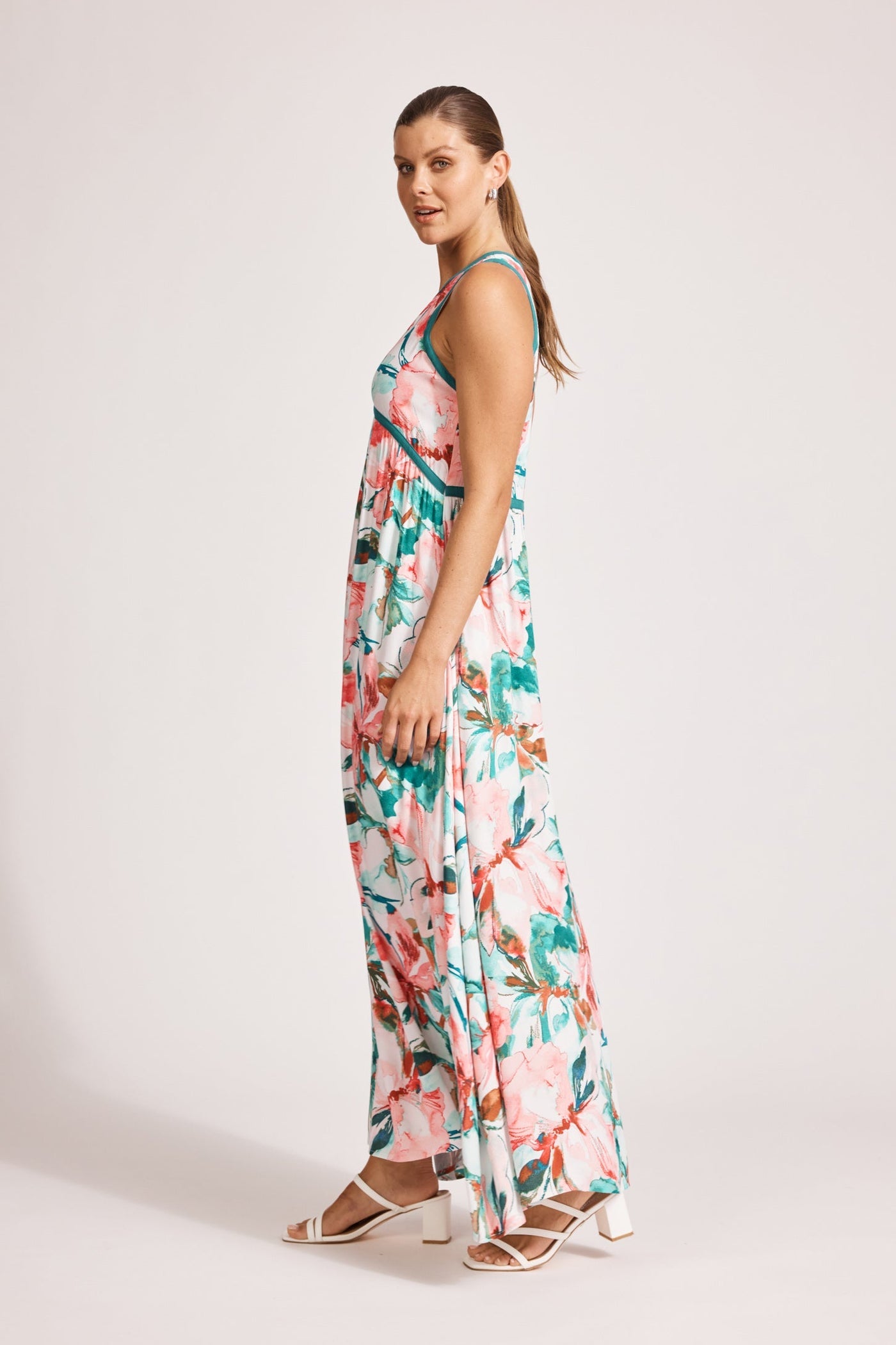 A flowing maxi dress designed for soft sophistication. Features spliced piping detail, fitted bust, and concealed side zip for ease of wear. Falls to a flattering A-line silhouette around the hips.