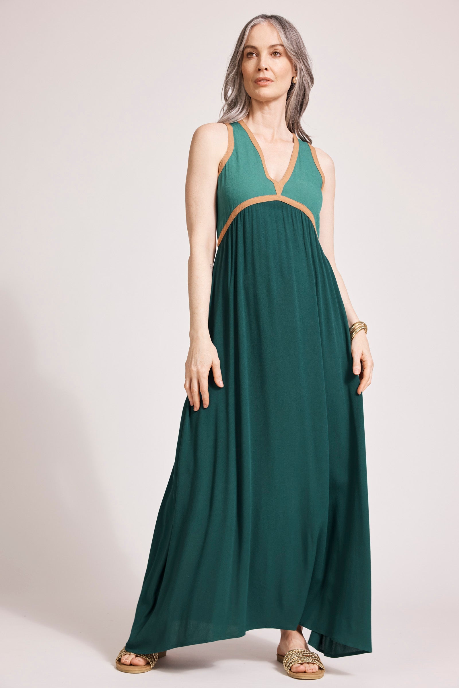 A flowing maxi dress designed for soft sophistication. Features spliced piping detail, fitted bust, and concealed side zip for ease of wear. Falls to a flattering A-line silhouette around the hips.