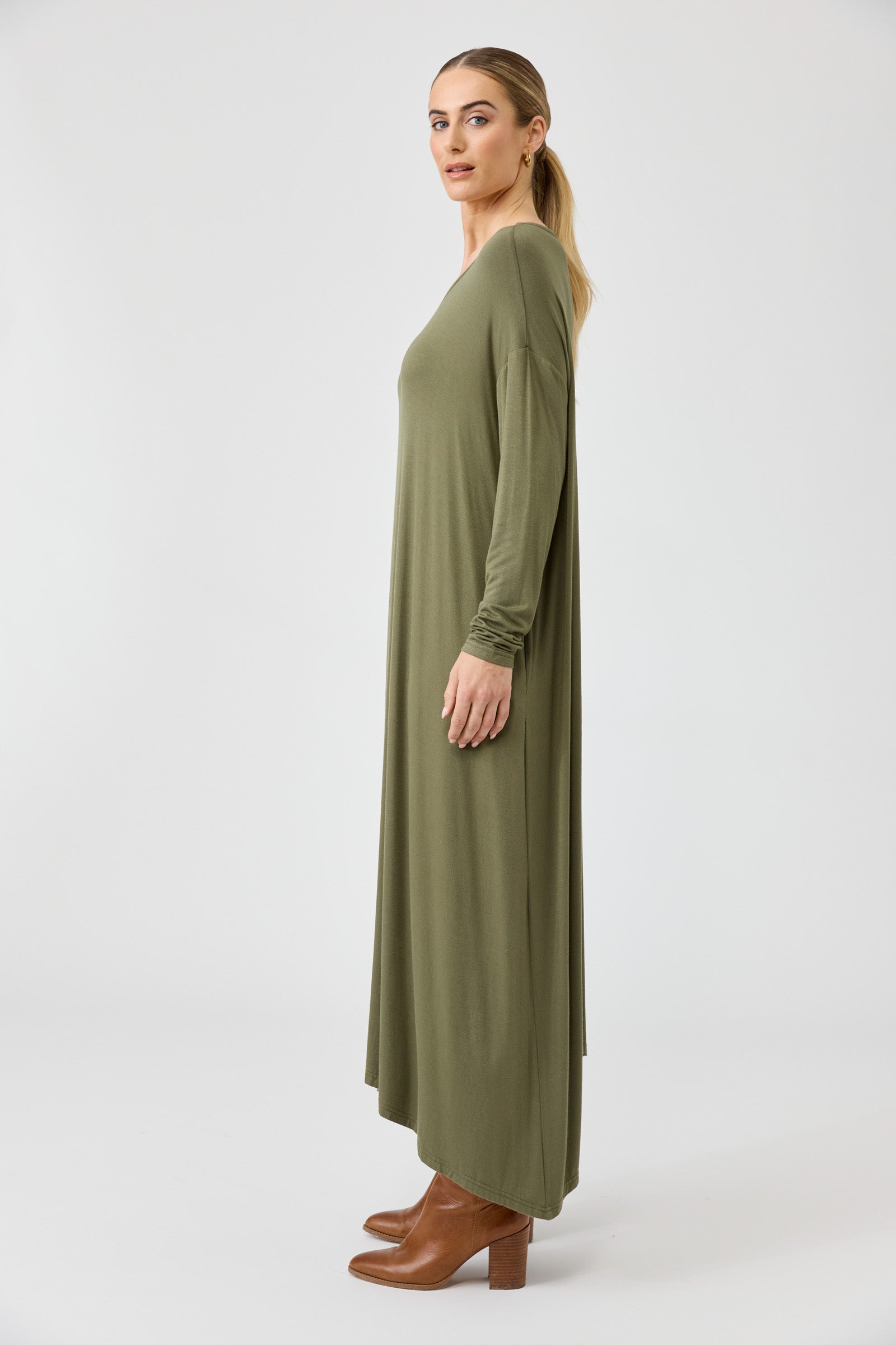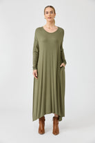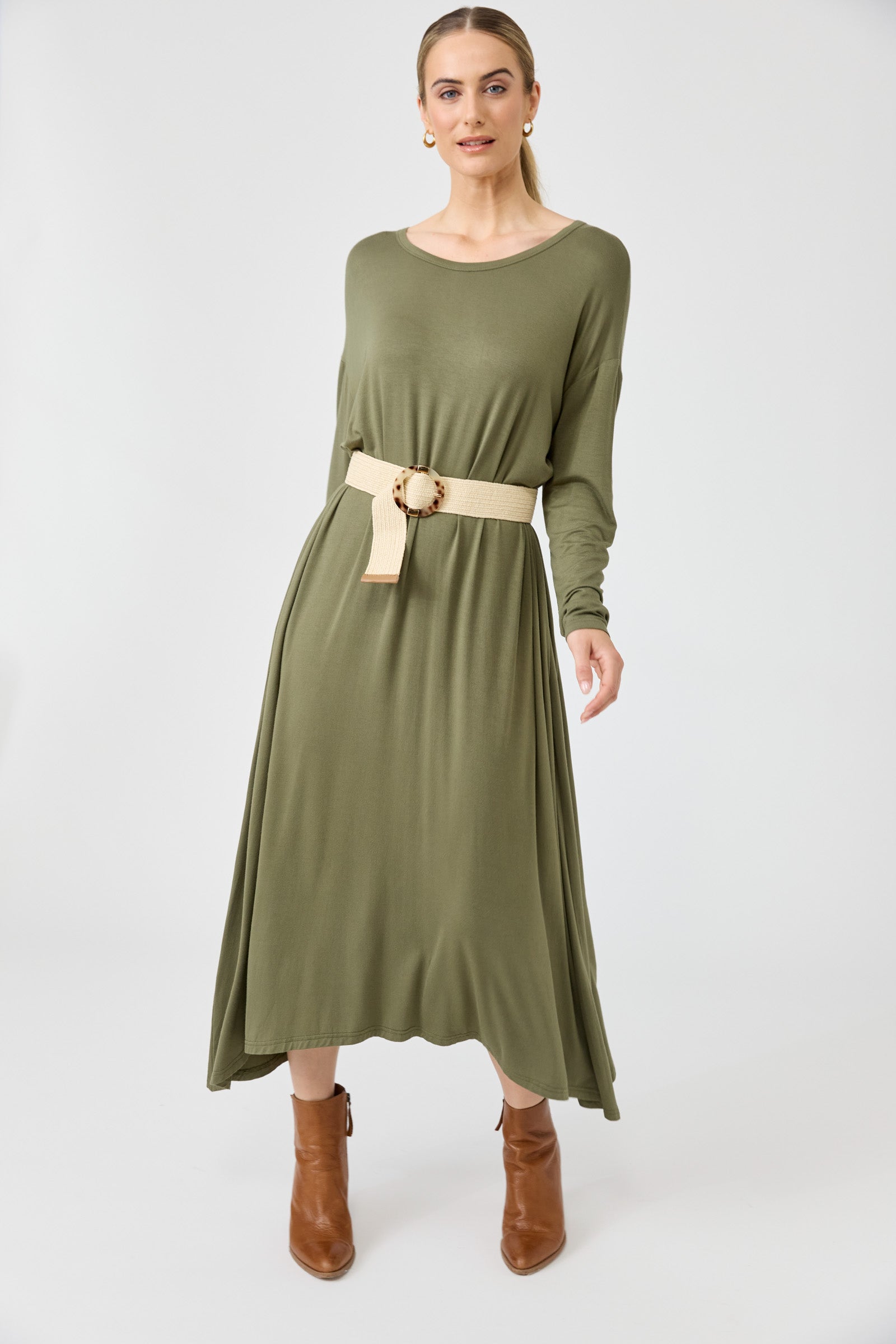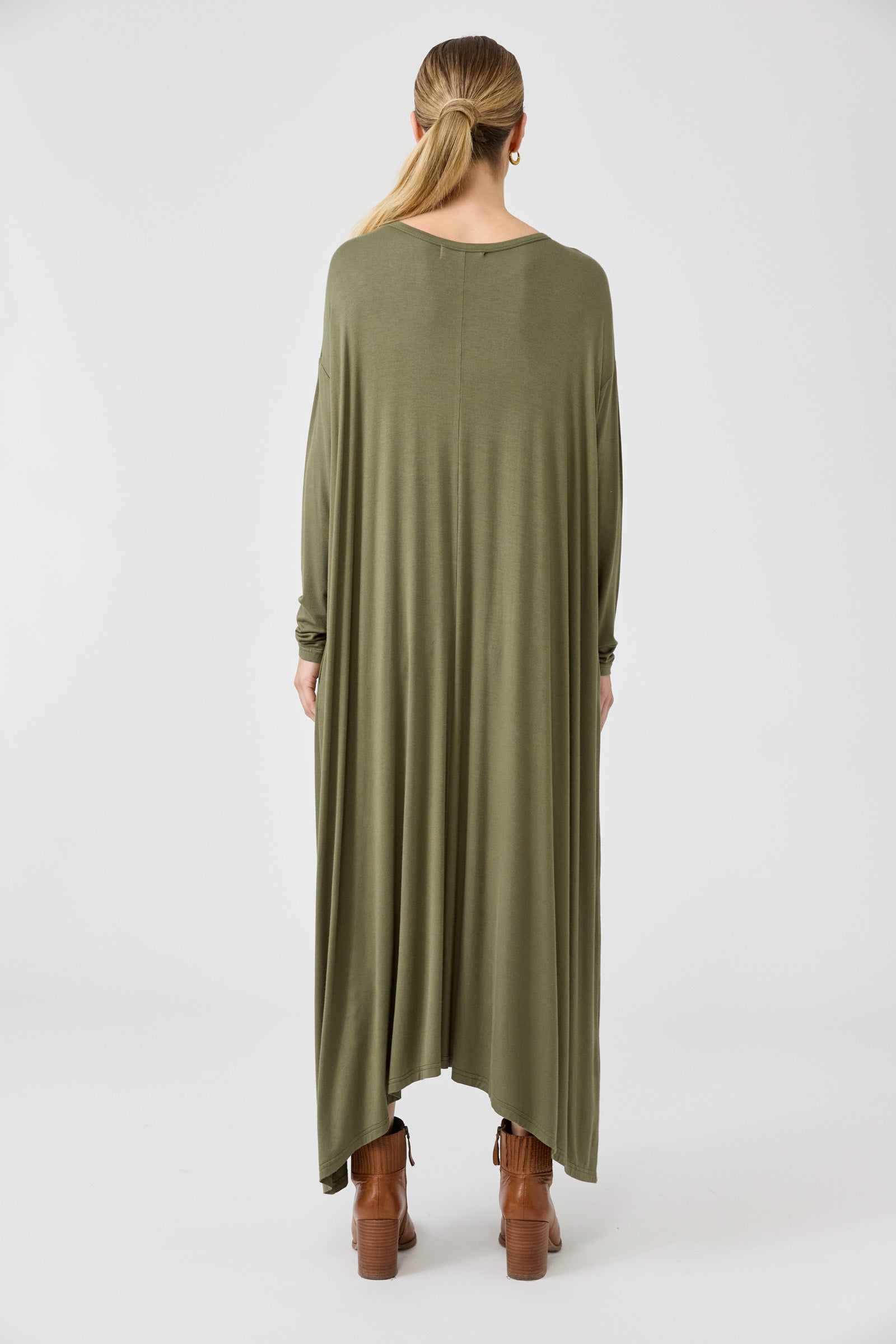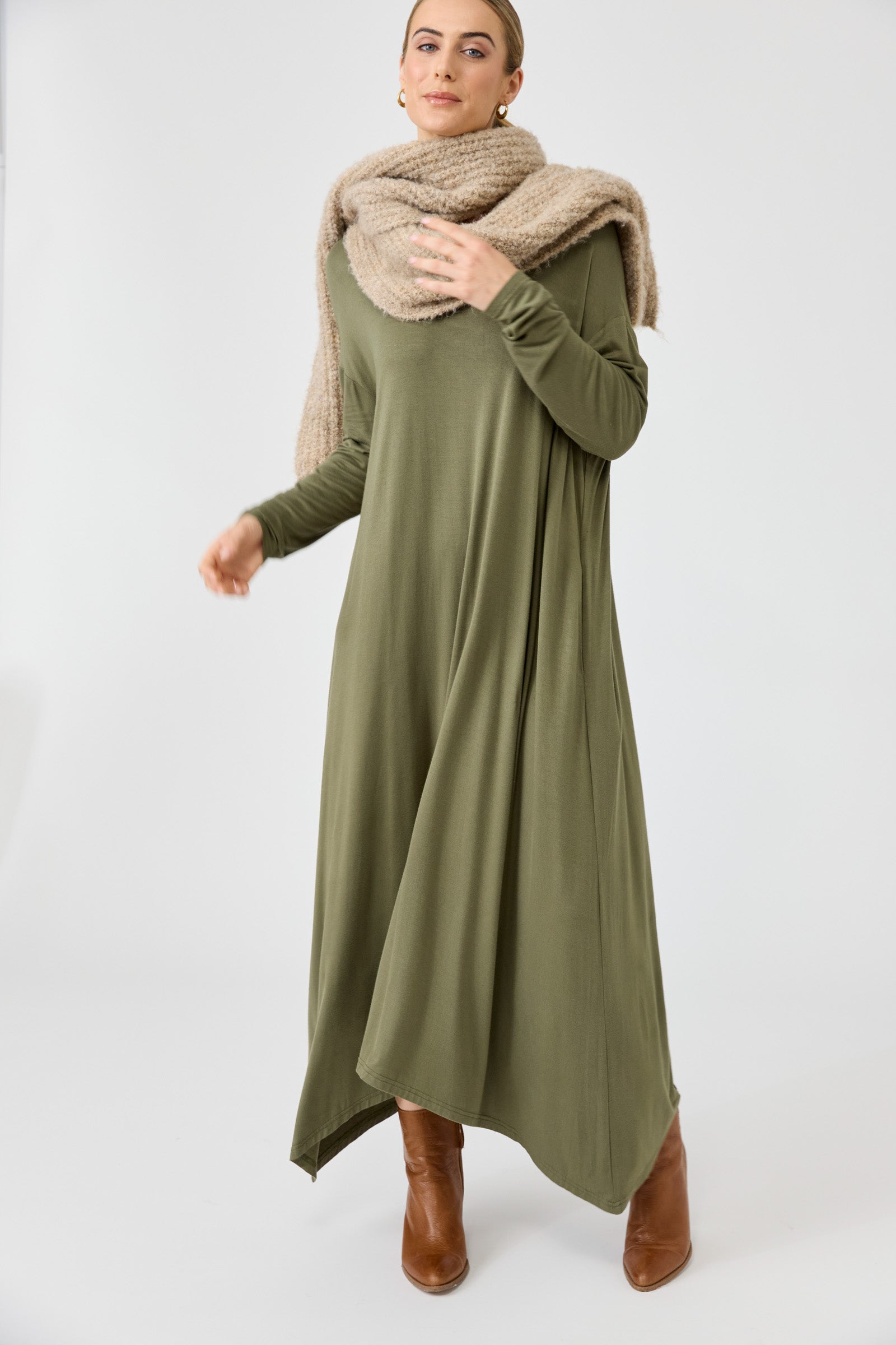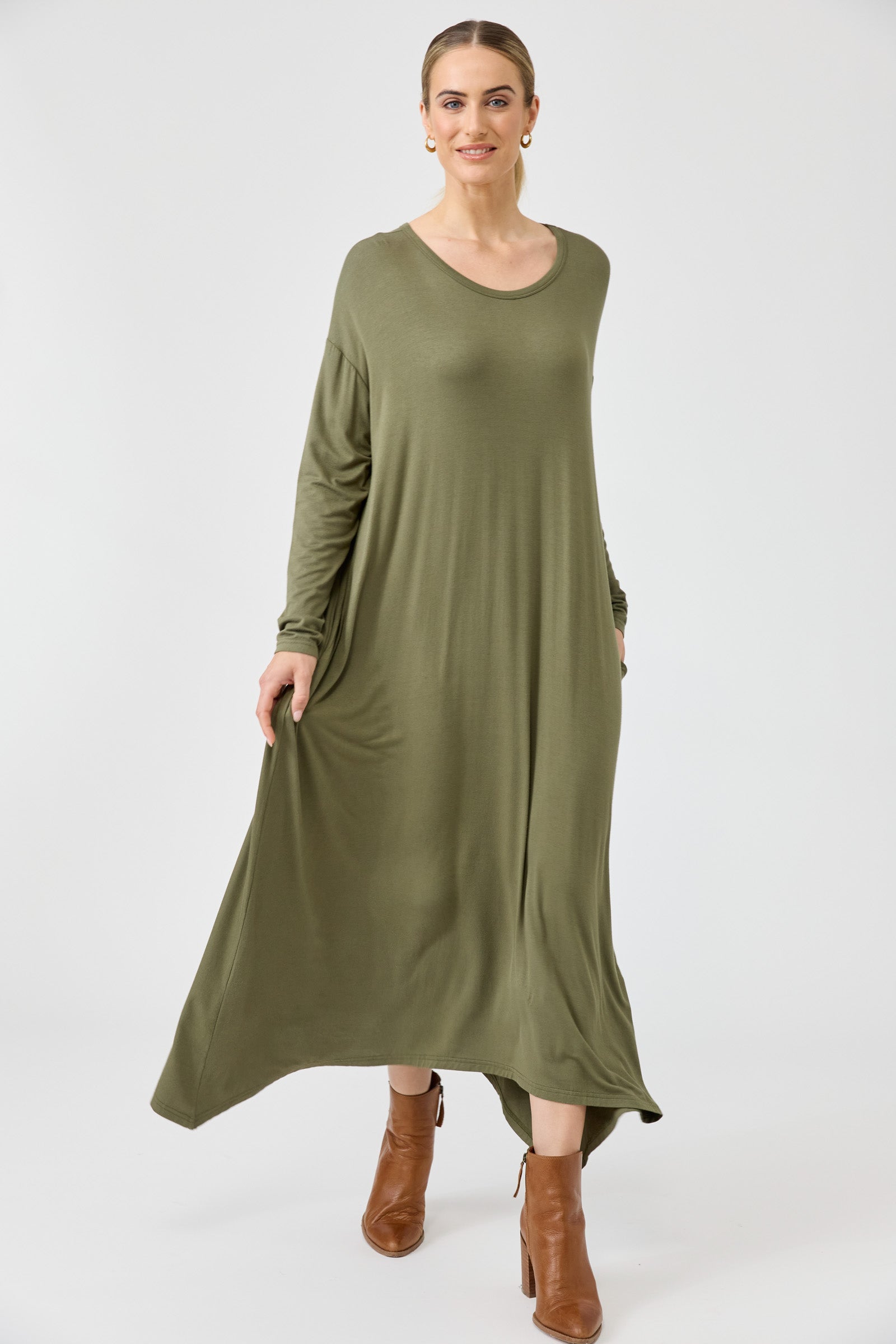 Whether for the office or casual moments off the clock, the Studio Jersey Dress is a one-size style that complements various body shapes. Soon to become a wardrobe staple, this drapey, easy-going style has been crafted from stretchy jersey fabric. It boasts a round neck, long sleeves, inseam pockets and a handkerchief hem. Wear it loose and relaxed, or cinch it at the waist with a belt for a more structured silhouette.