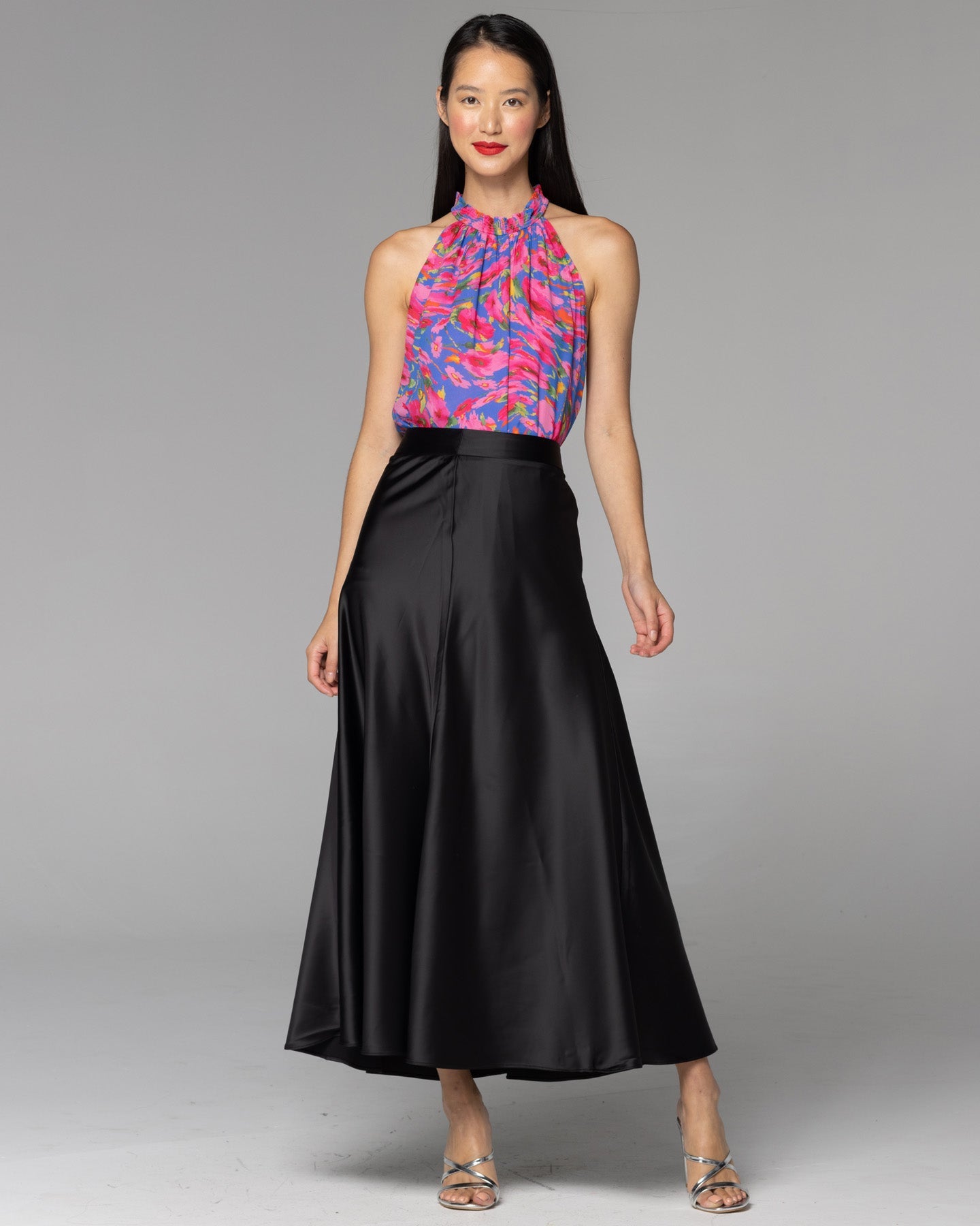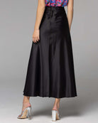 Designed with a high waist, it offers a flattering silhouette. The slim fit gracefully flows into a relaxed long line skirt, exuding timeless elegance. The center-back invisible zip ensures a sleek finish. Elevate your style with the Rock Steady Satin Skirt, a versatile piece that can be dressed up or down with ease.