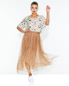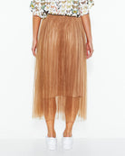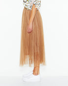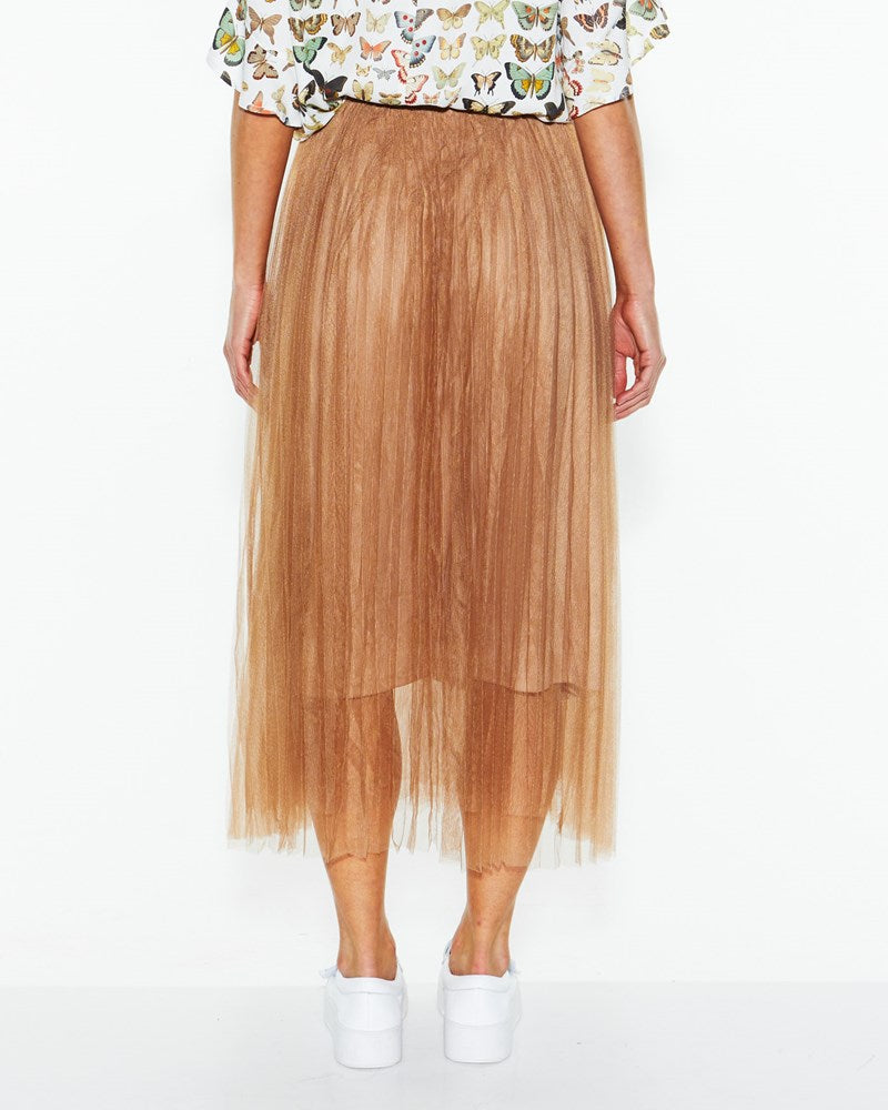 The Sway Mesh Skirt features a soft mesh fabric and pleated outer layer, offering an elevated yet relaxed silhouette. The elastic waistband ensures comfort, making it perfect for effortless springtime style.