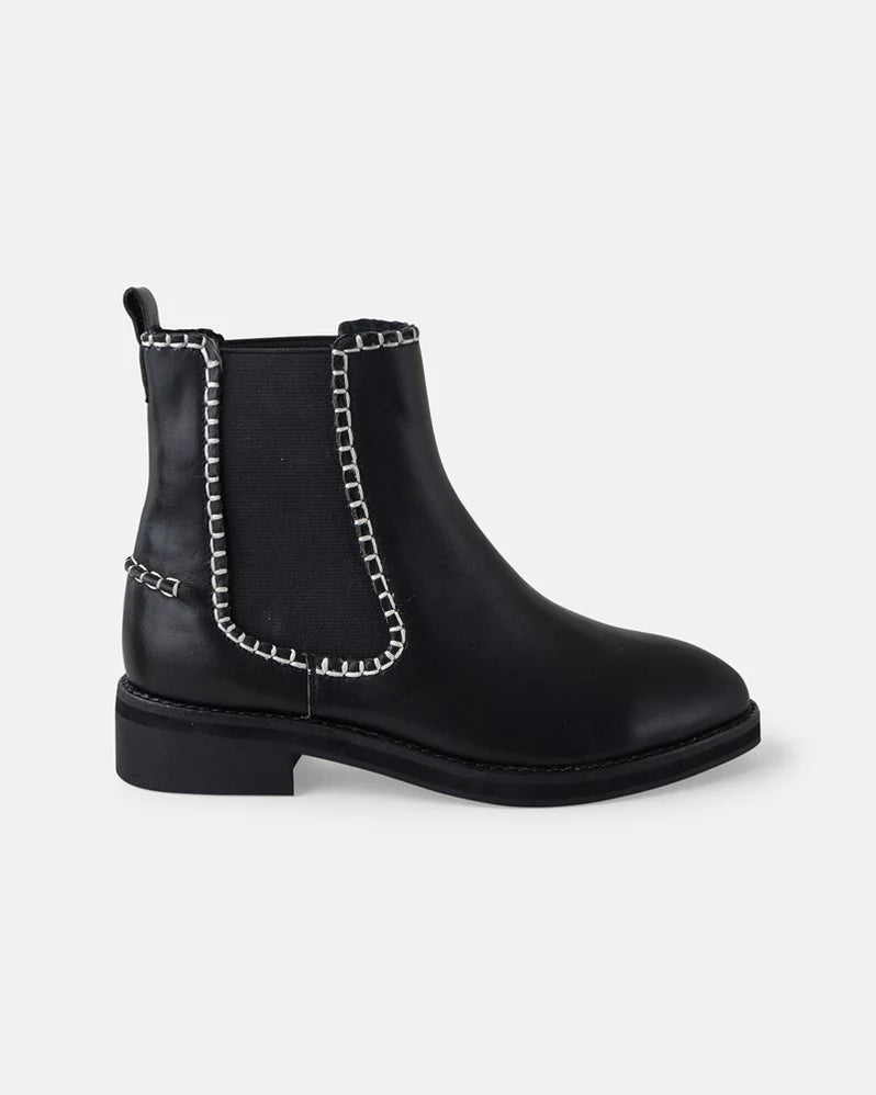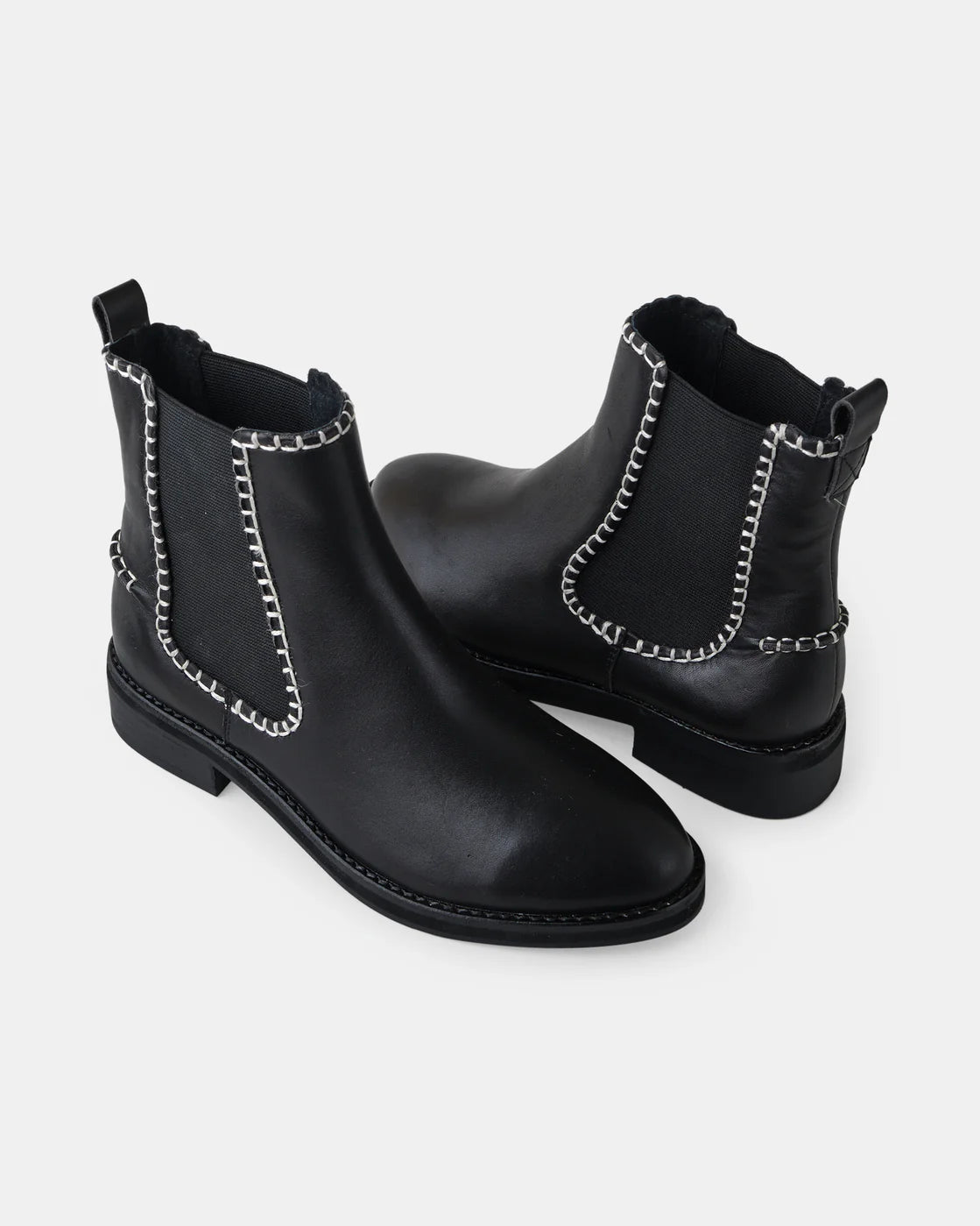 Crafted from soft buttery leather, these ankle boots are a winter essential. The Cinda boot in Black, featuring blanket stitching details in beige, adding a touch of style to this classic design.
