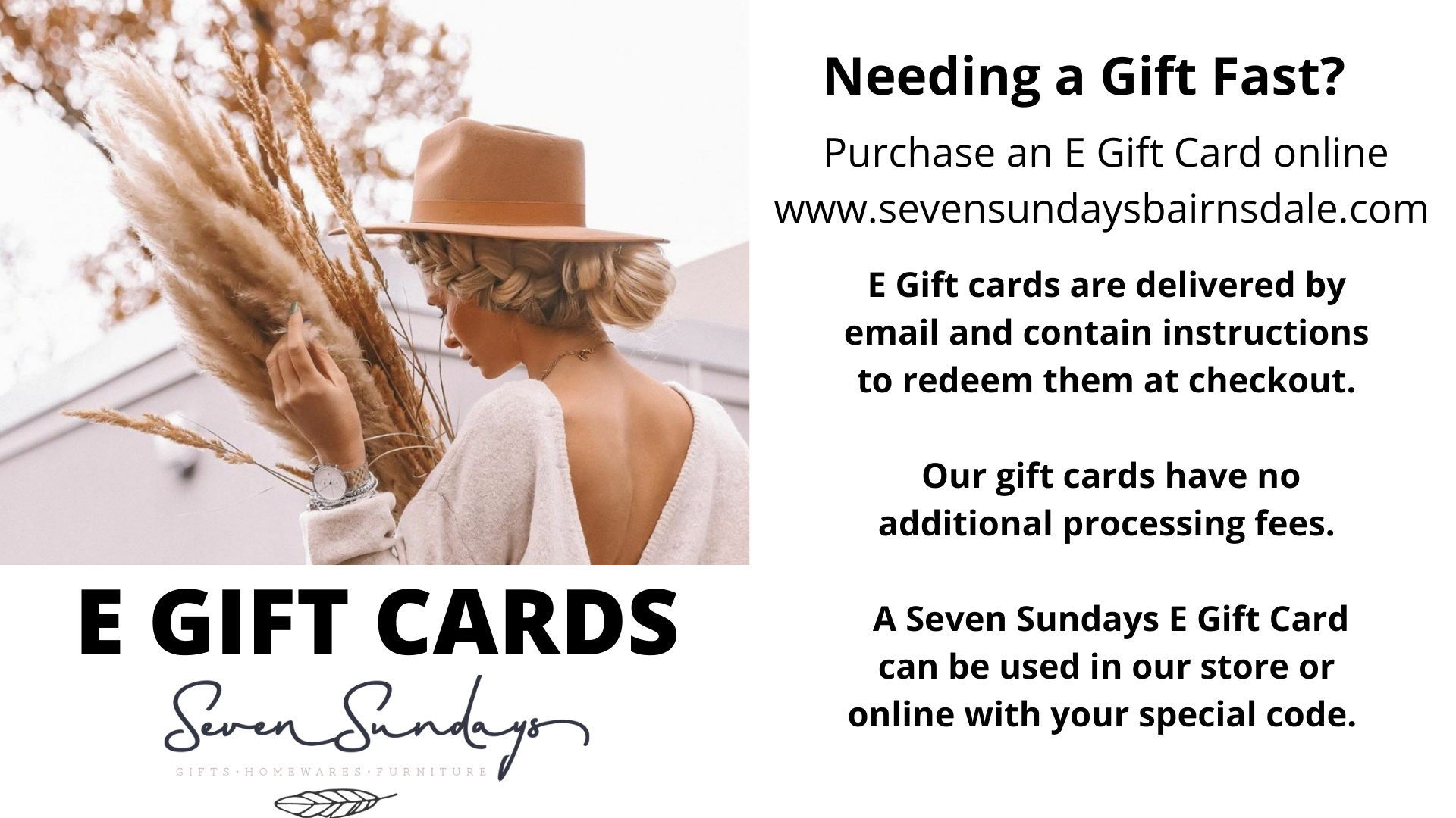 A Seven Sundays E Gift Card can be used in our store or online with your special code.  They're the perfect way to say 'Congratulations', 'Happy Birthday', 'Merry Christmas' or 'Thank you'.
