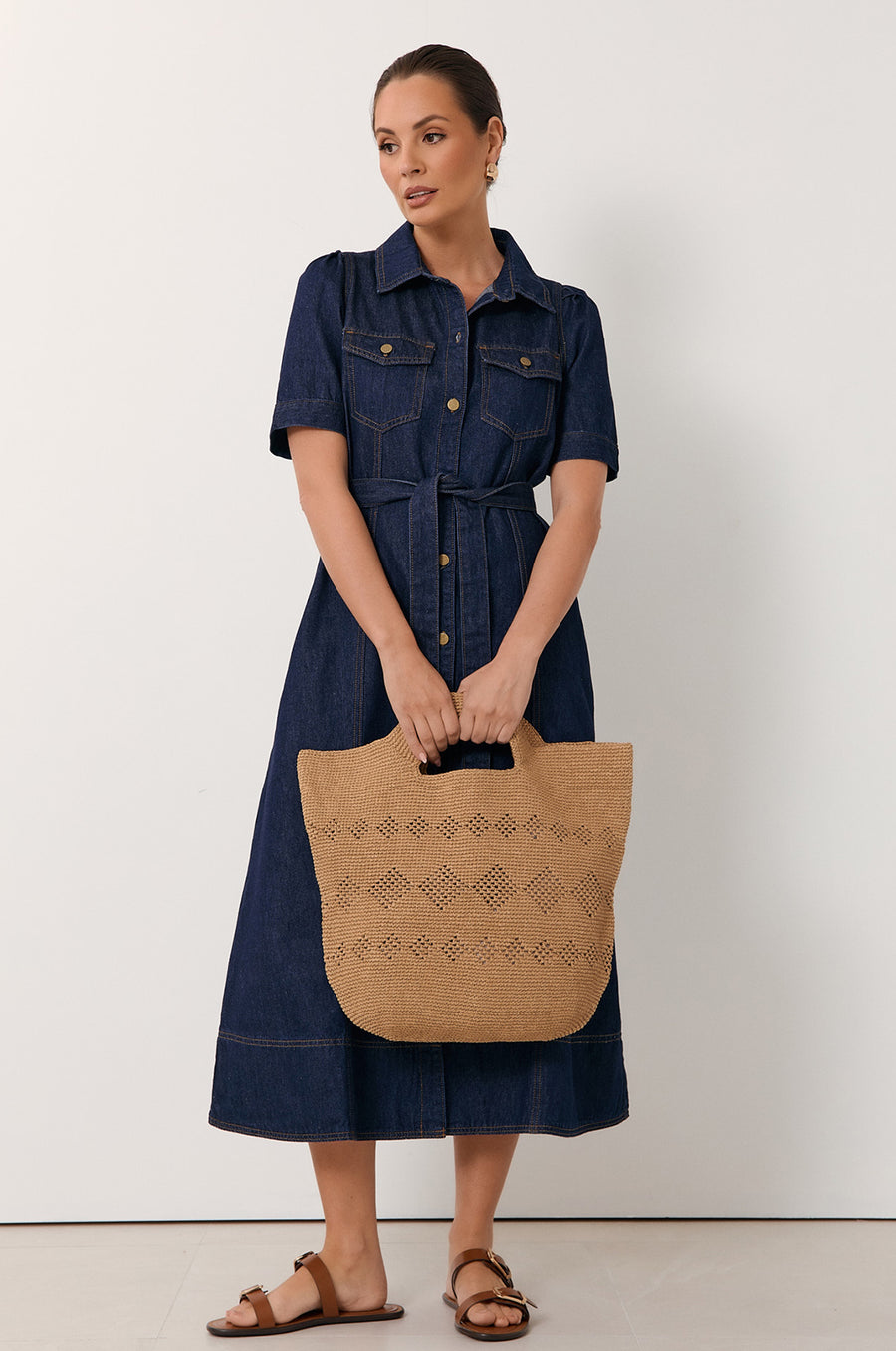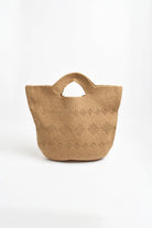 The Esta Diamond Weave Event Basket in Camel is a relaxed bucket-style bag crafted from paper weave, featuring top handles and textured diamond detailing for effortless, everyday styling.