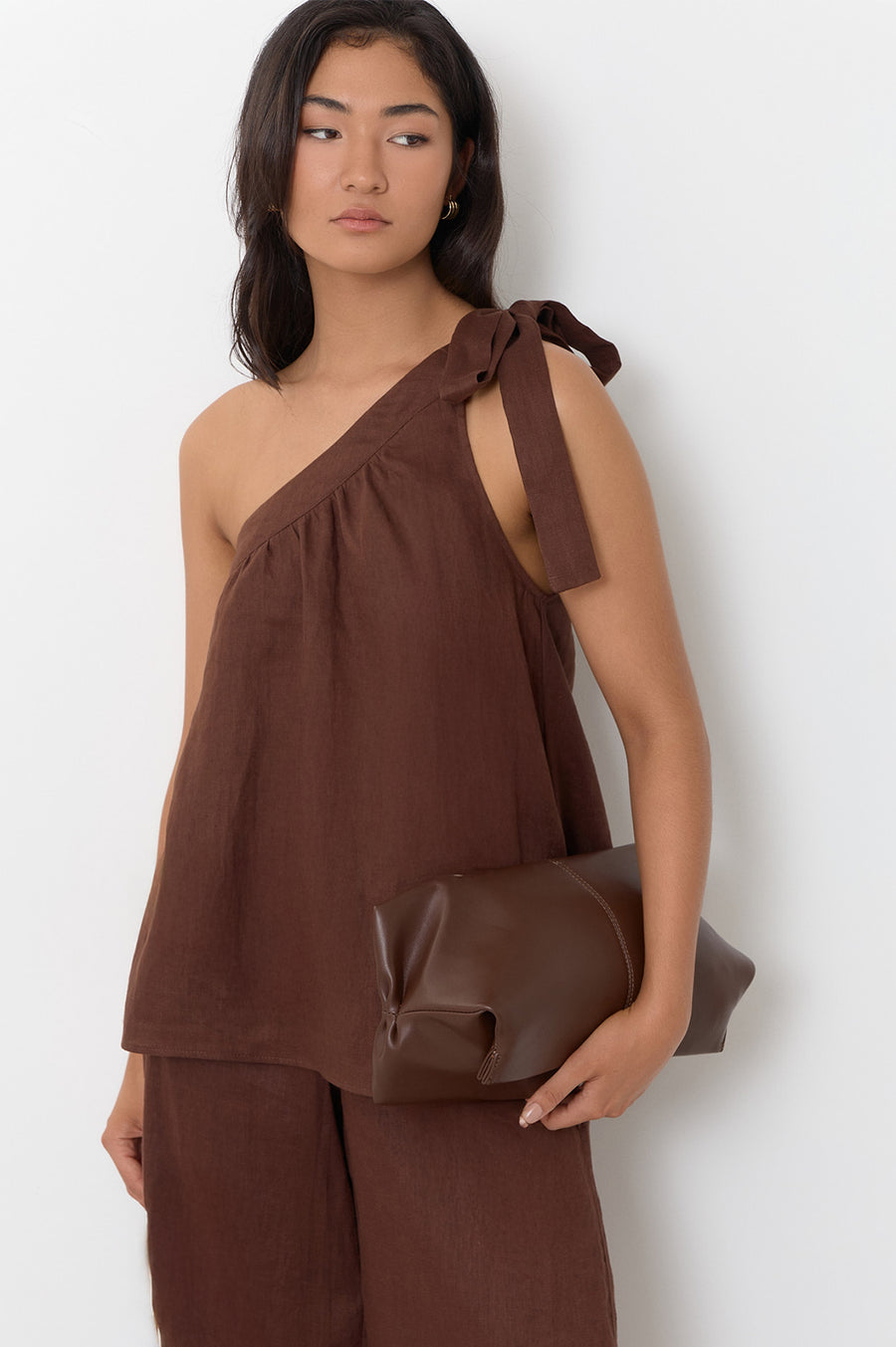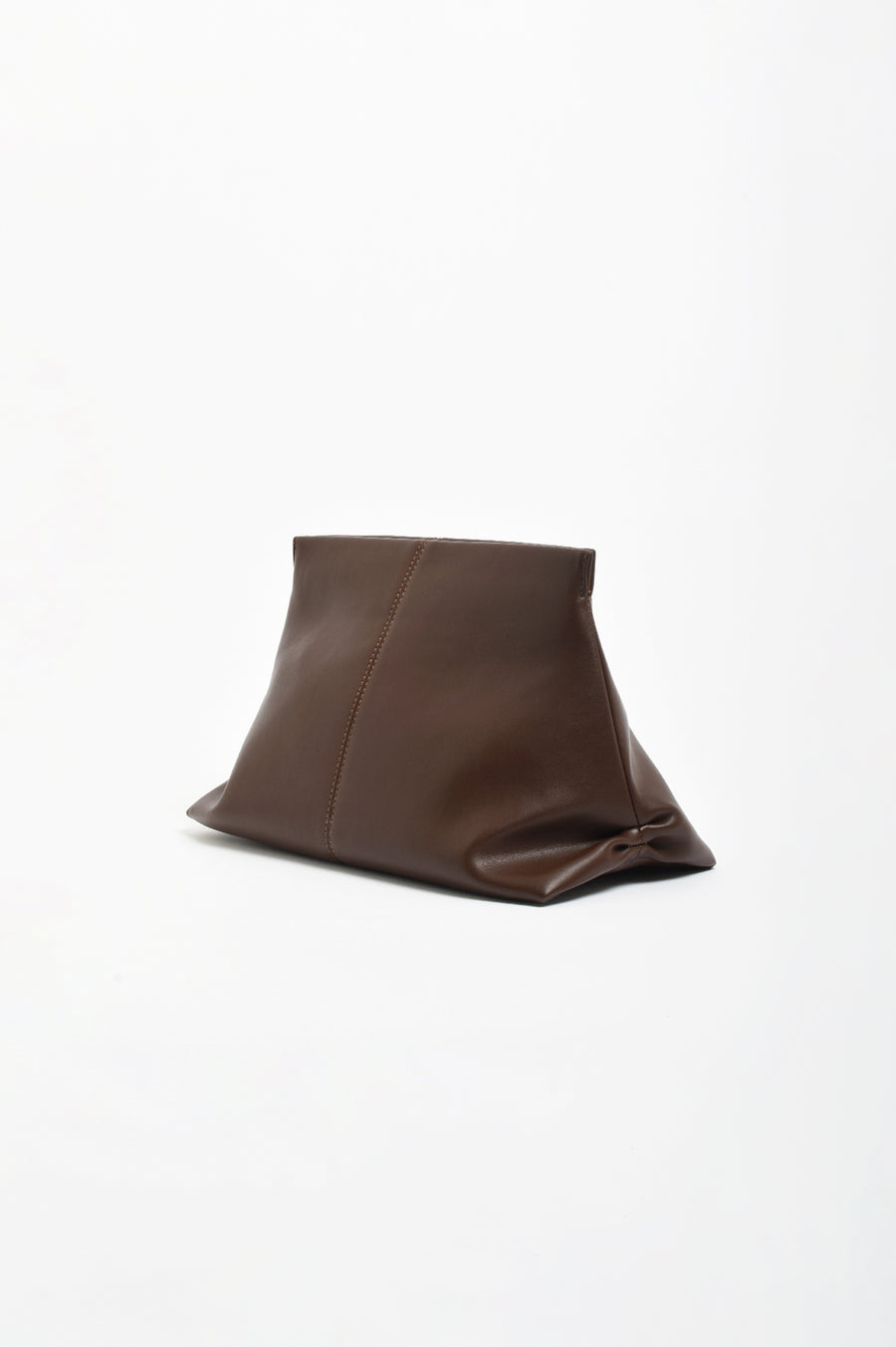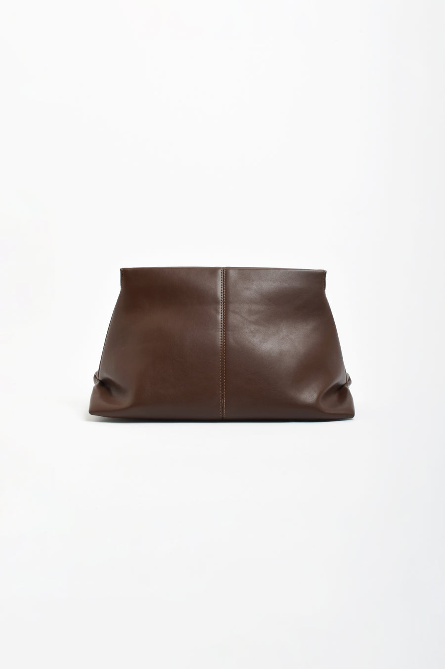 The Semi Structured Fold Over Clutch in Chocolate is a pouch-style clutch with internal pockets and a hinge closure. Crafted from vegan leather.