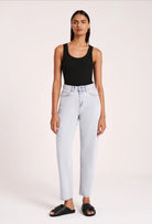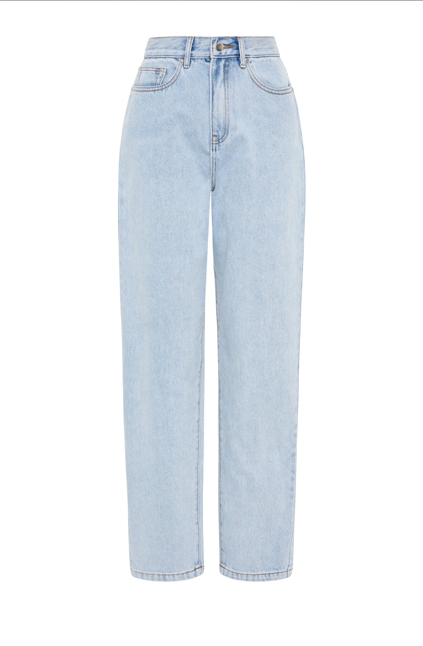 A classic Mom Jean made from 12 oz 100% organic cotton denim, stone washed to an authentic stone wash blue. Shape is a high rise & fitted waist with classic mom leg, relaxed through the thigh, tapering down at the ankle. Features include branded shank button, rivets & Jacron Back patch. Fits true to size, size up for a more relaxed fit.