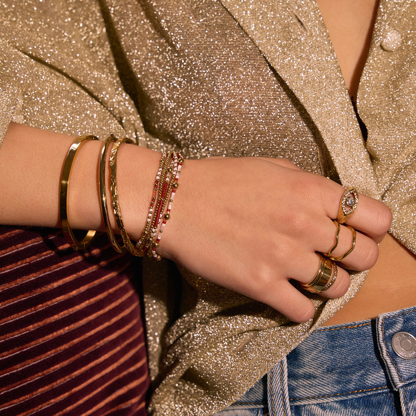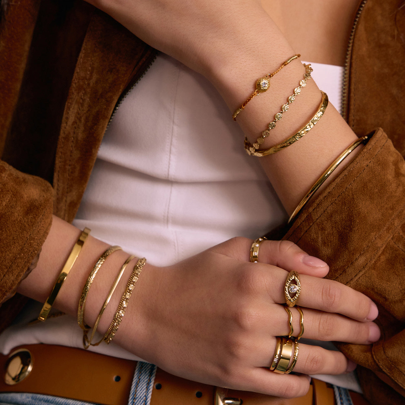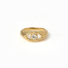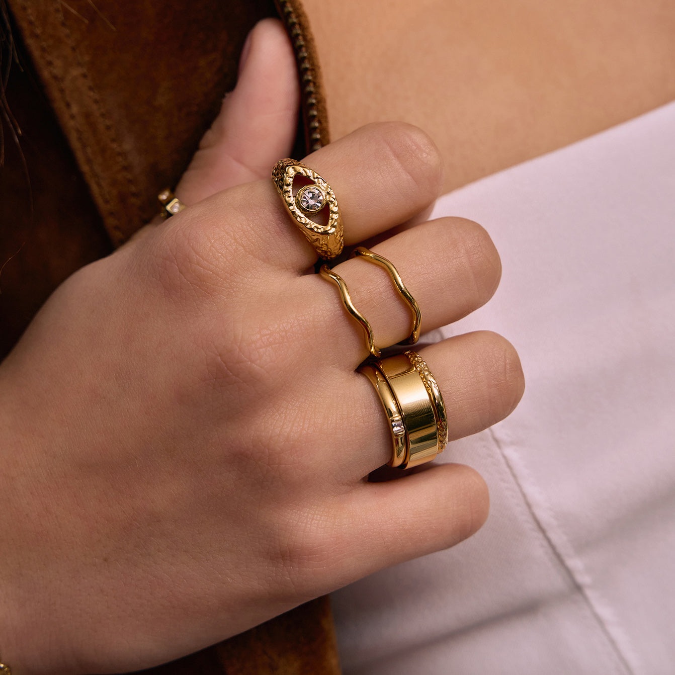 Rich in texture and sparkling with good vibes only, the stunning Karma Ring is sure to be your new favourite statement piece! Featuring a shimmering evil eye on a crushed golden band, this elevated signet style brings a bold touch of protection to your everyday style, perfect for gifting a loved one.