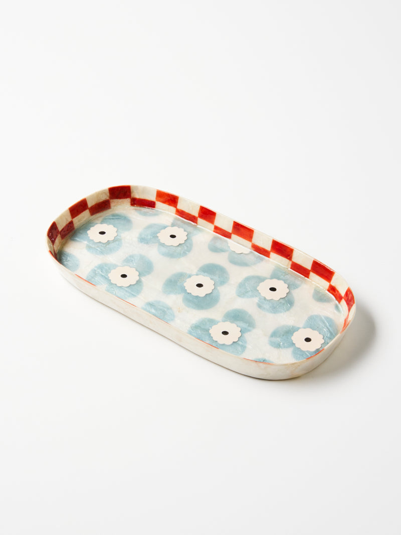 Sky blue blooms fill this Capiz shell tray, transforming everyday organisation into artful display. Designed in Sydney and crafted by Philippine artisans, each piece harnesses the natural luminosity of the shell through hand-painted floral patterns. Perfect for corralling jewellery, keys, or small treasures on vanities and entryway tables.
