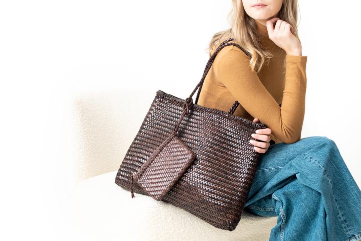 These bags are made in a coastal area of South India, where women traditionally weaved fishing nets and baskets. These skilled artisans are located, and then trained in weaving bags out of bamboo-sized strips of leather.