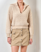 - Boucle yarn creates a cozy