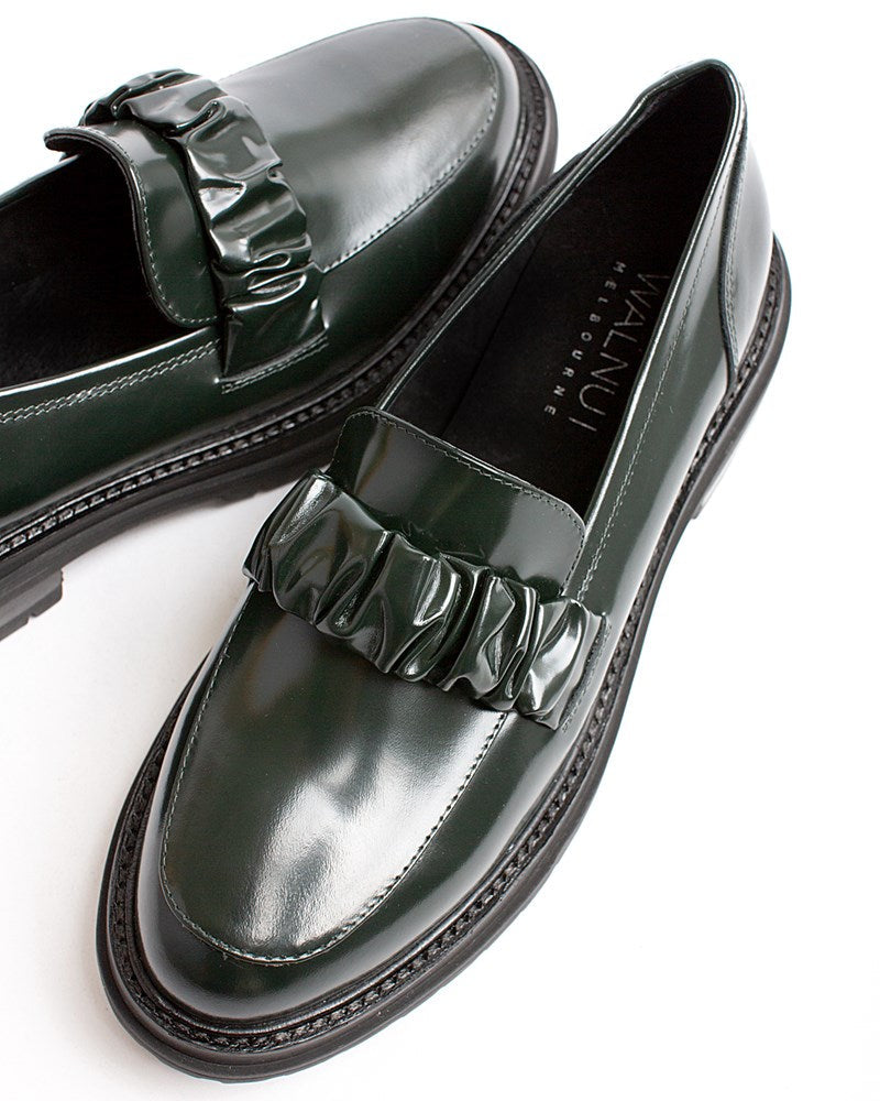 The Owen is a classic loafer with a detailed ruched strap, designed to be paired with everything from sharp tailoring to 90's inspired silhouettes. Made from olive high shine patent leather set on a chunky lug sole for maximum comfort and an ample lift.