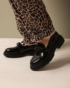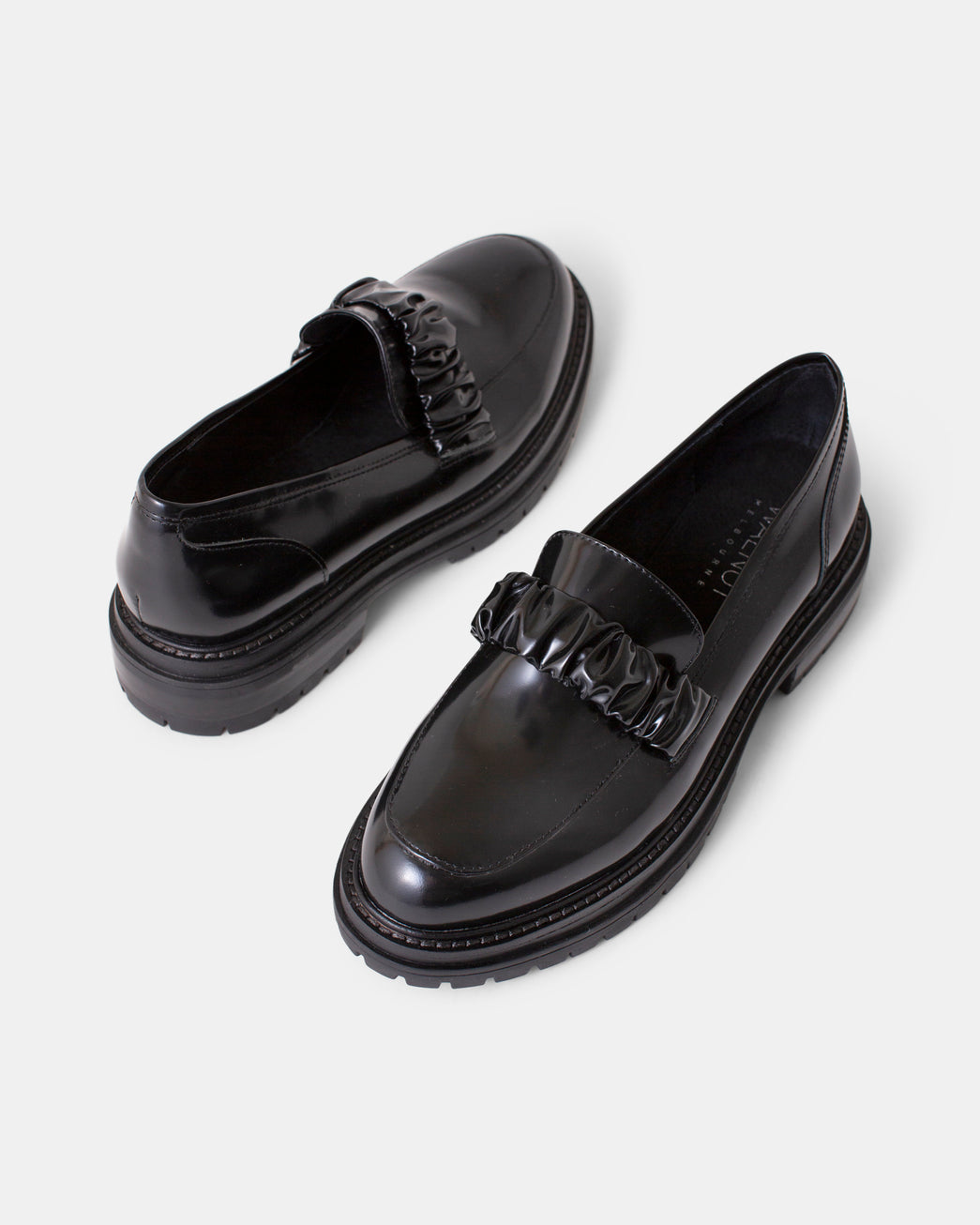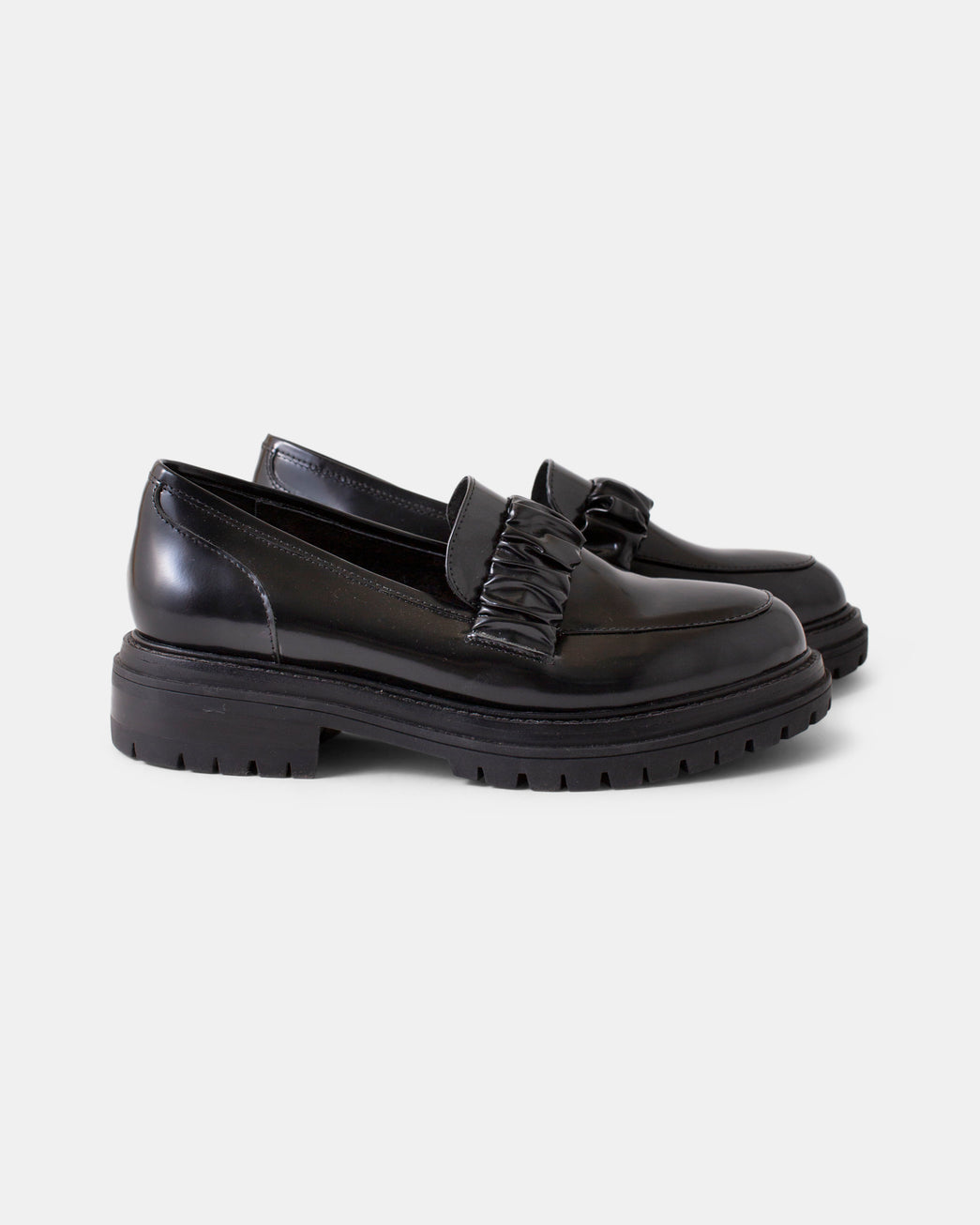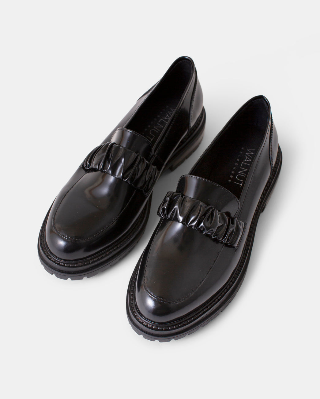 The Owen is a classic loafer with a detailed ruched strap, designed to be paired with everything from sharp tailoring to 90's inspired silhouettes. Made from olive high shine patent leather set on a chunky lug sole for maximum comfort and an ample lift.