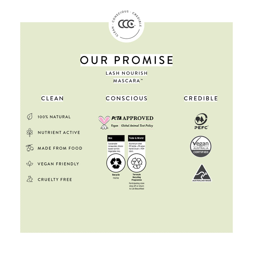 Synthetic-free creamy botanical formula nourishes, hydrates and supports natural lash growth and allows lashes to breathe, be nourished and not dry out: enriched with argan (EFA's), cucumber seed and avocado oils (Vitamins B5, B7 & E) and infused with green tea + coffee tea extracts (antioxidants, anti inflammatories + caffeine) plus silica-rich bamboo for the healthiest lashes ever.