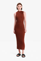The Onda Knit Dress is slim fitting with a racer tank cut finishing midi in length. Features include a classic rib pattern construction through the body and an extended neckline. Skirt slit through centre back for ease with movement.